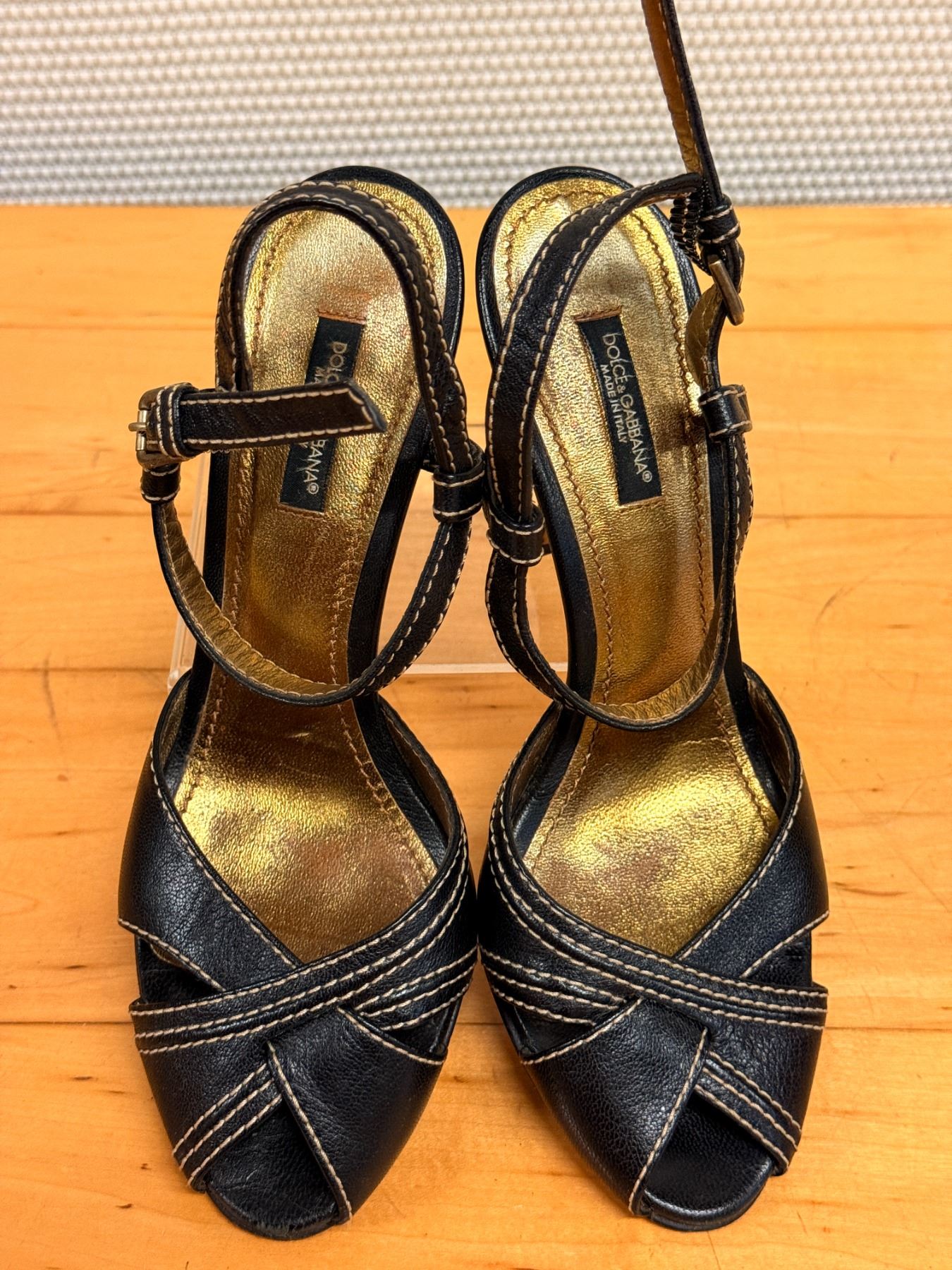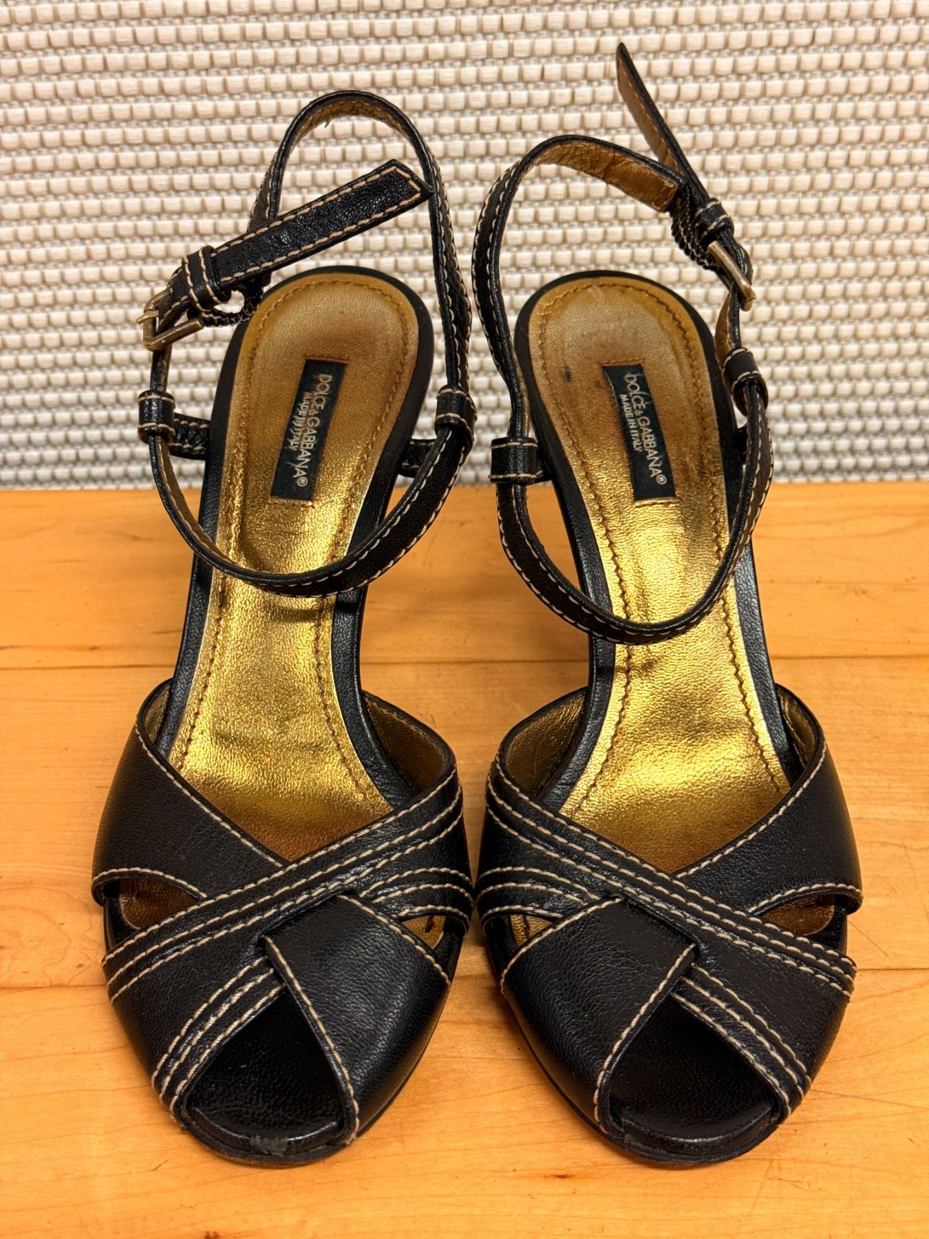 Dolce & Gabbana black strappy sandals with white contrast stitching and a gold insole. They feature an open-toe design, crossed straps over the front of the foot, an ankle strap with a buckle closure, and a stiletto heel. Signs of wear in pictures