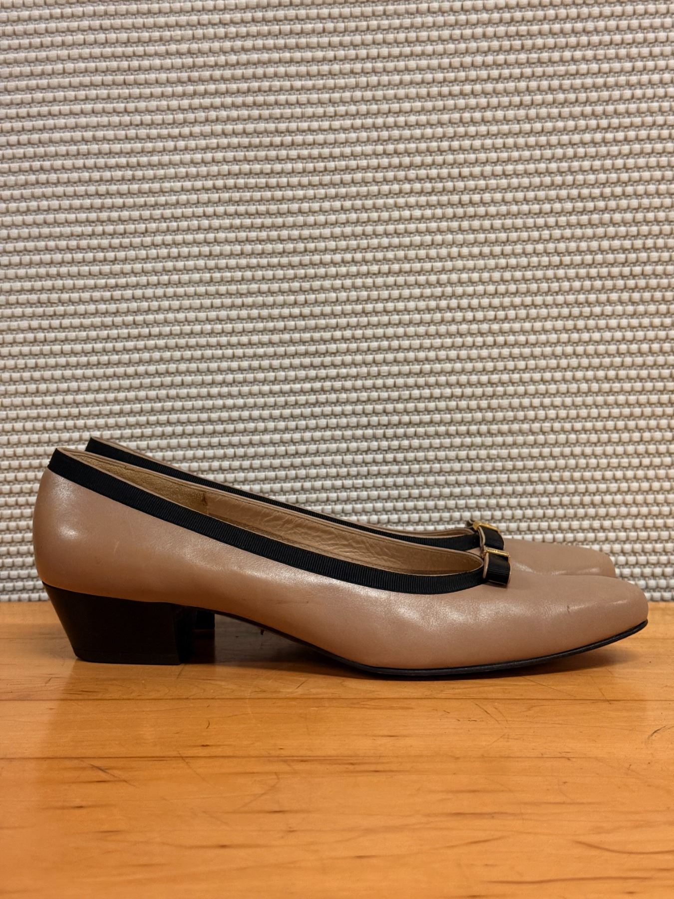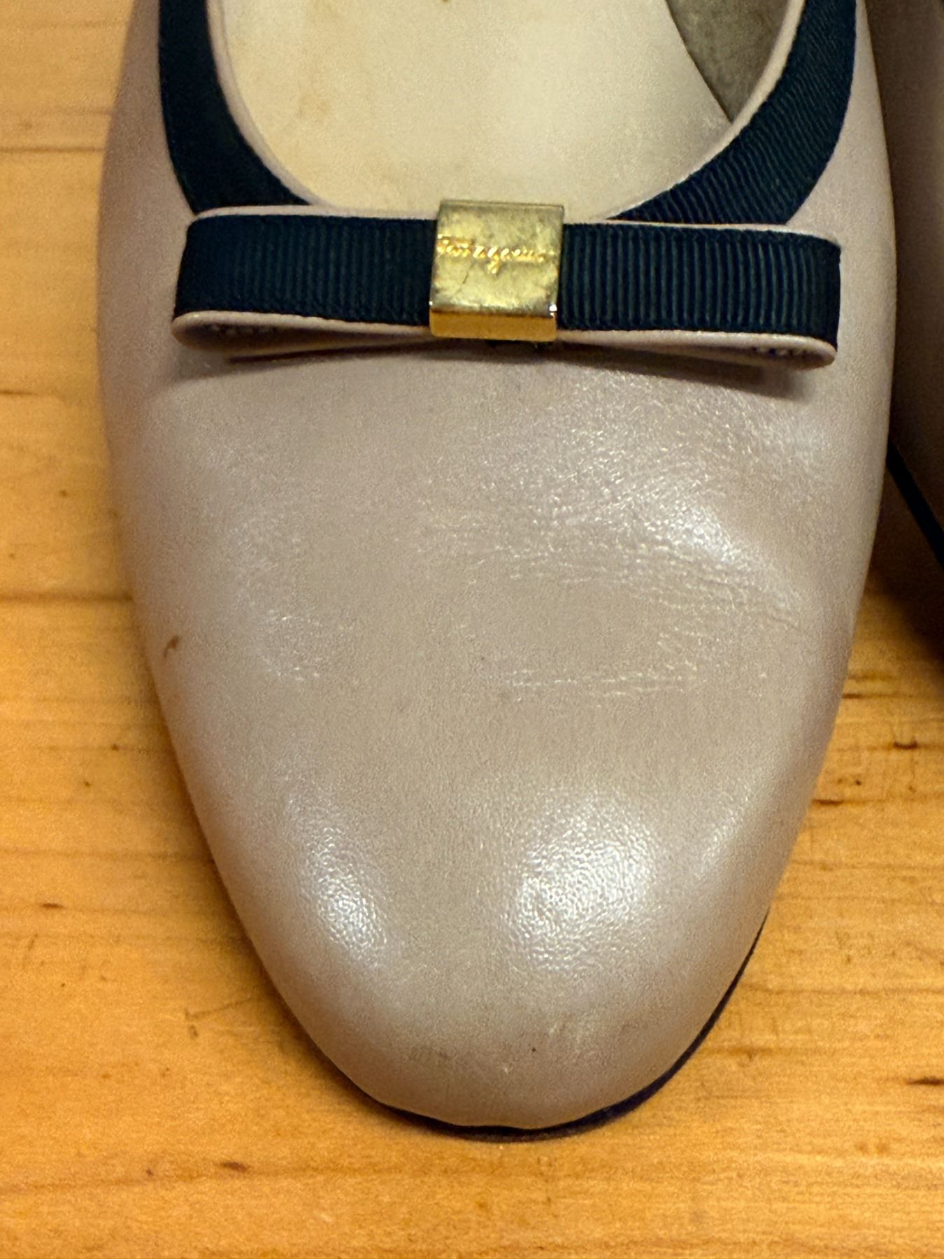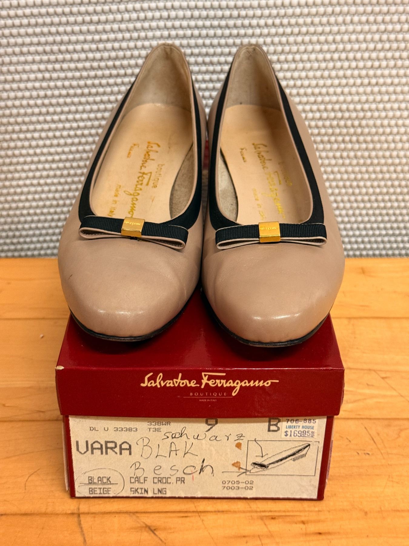 Classic Ferragamo Vara flats in beige calfskin with black grosgrain trim and signature gold bow hardware. Elegant, timeless, and lightly worn.