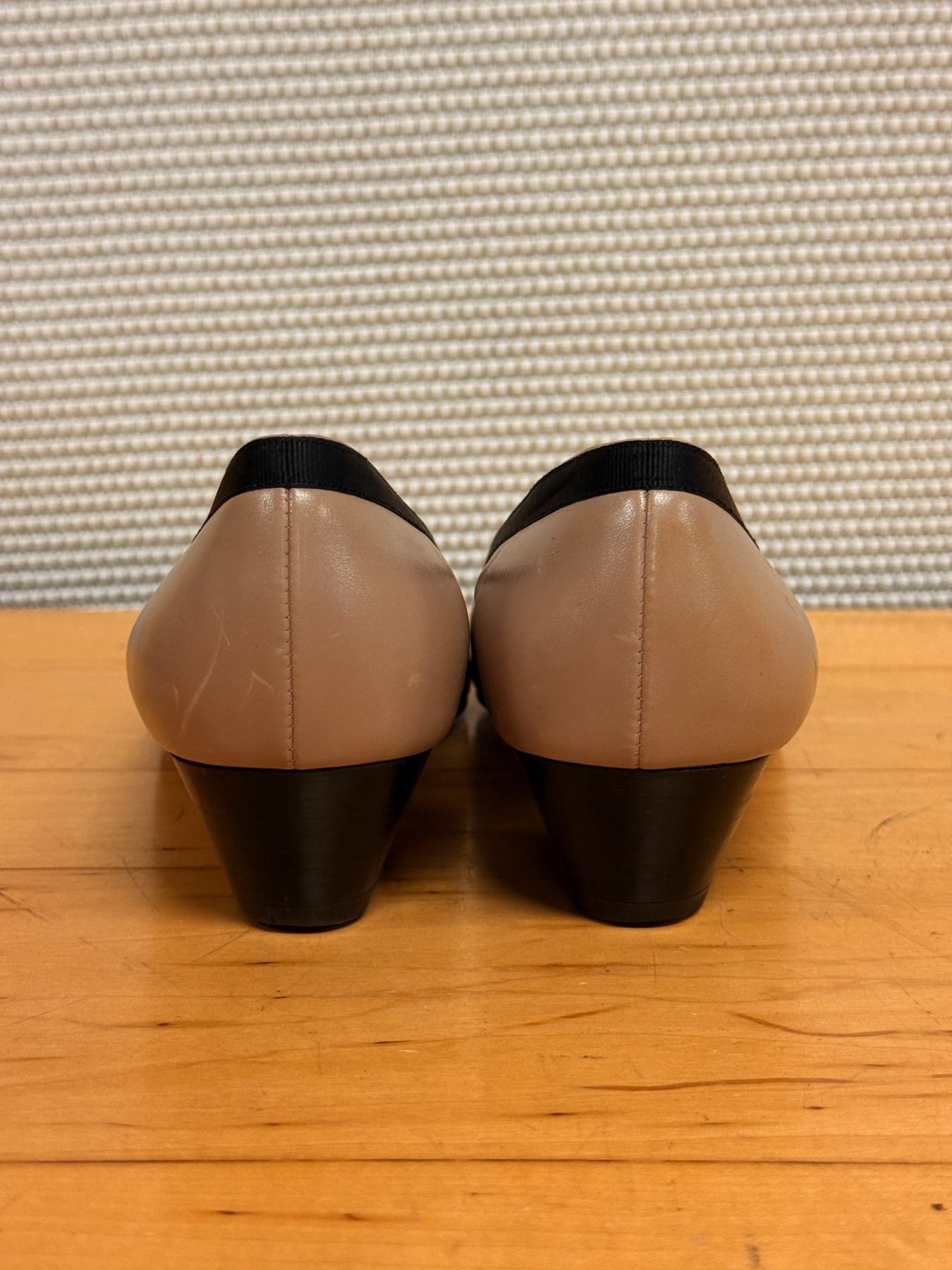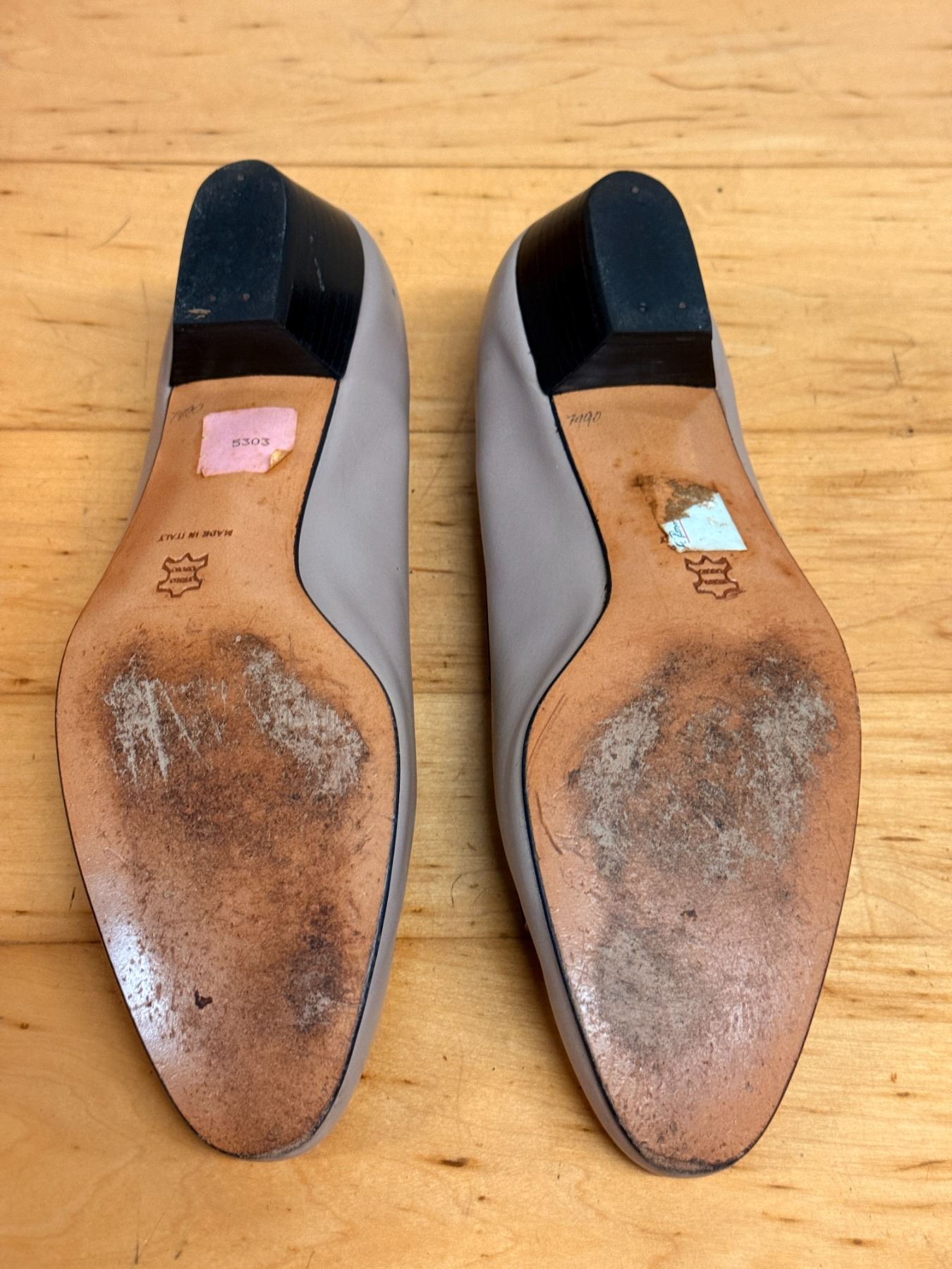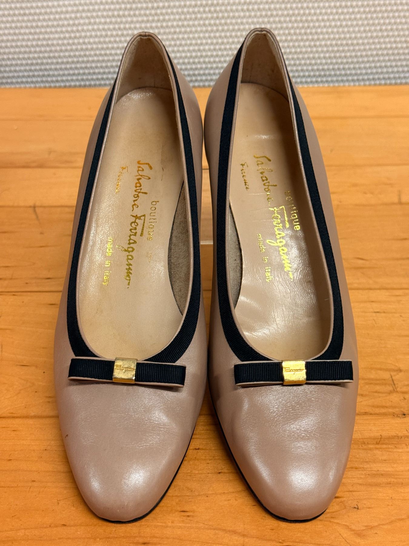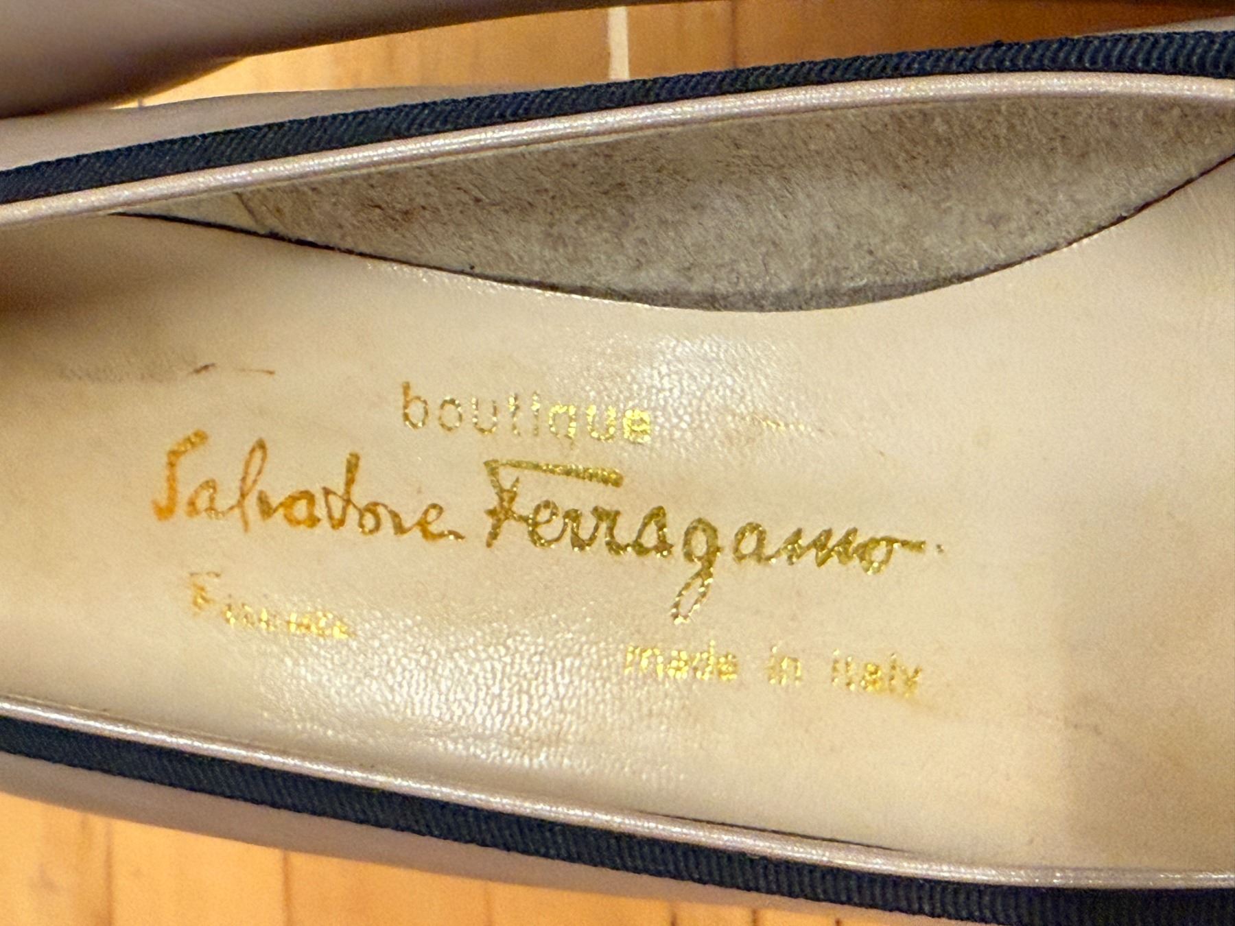 Classic Ferragamo Vara flats in beige calfskin with black grosgrain trim and signature gold bow hardware. Elegant, timeless, and lightly worn.