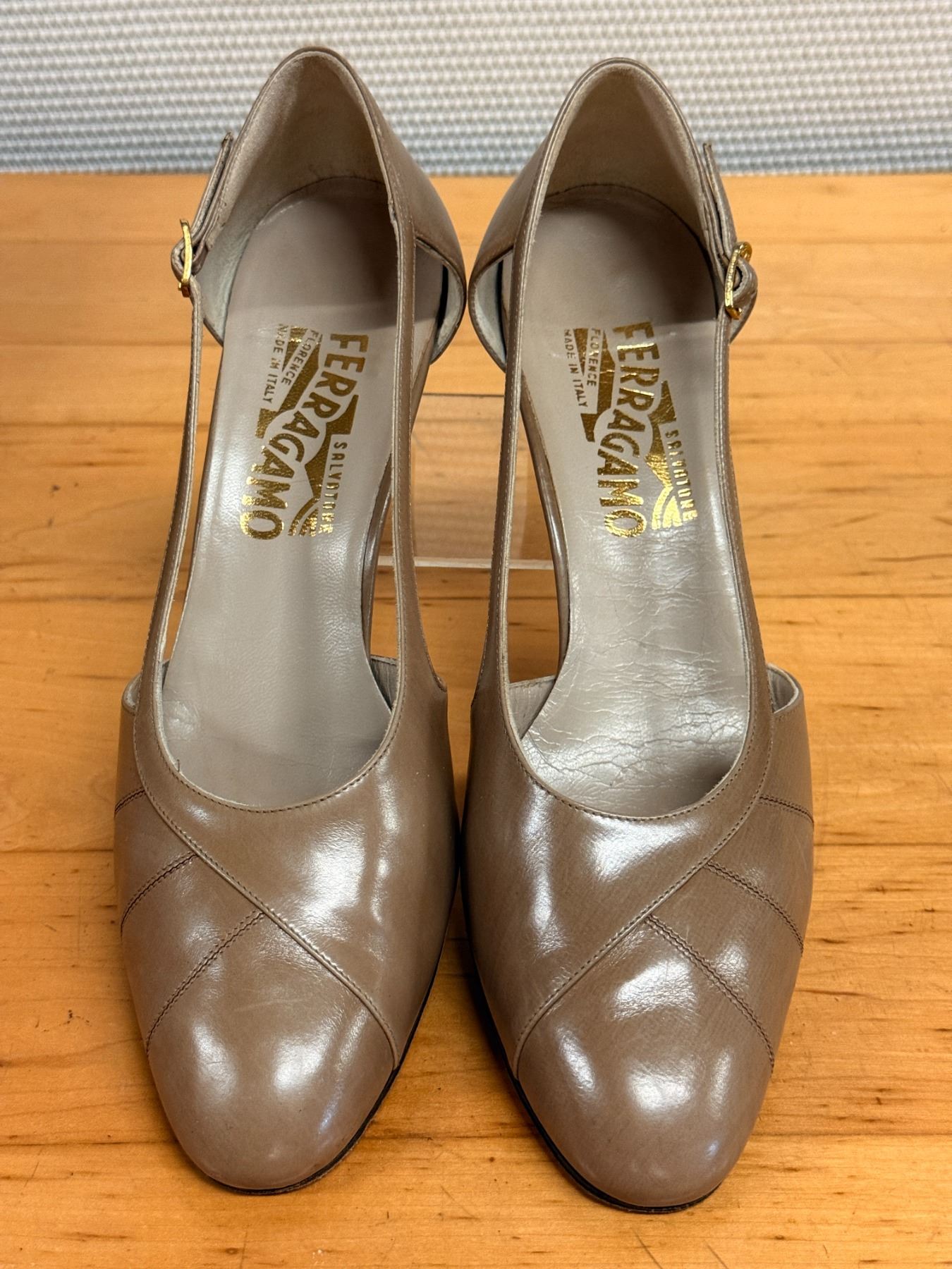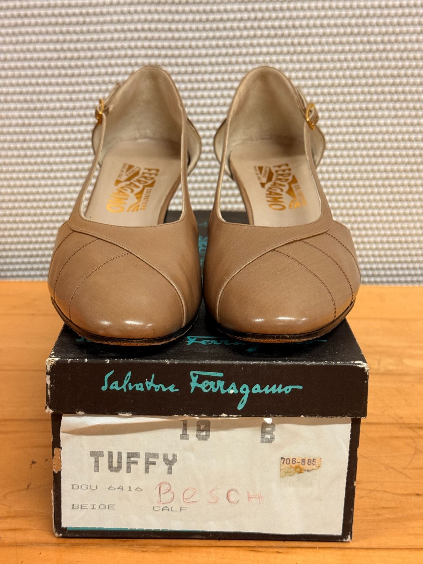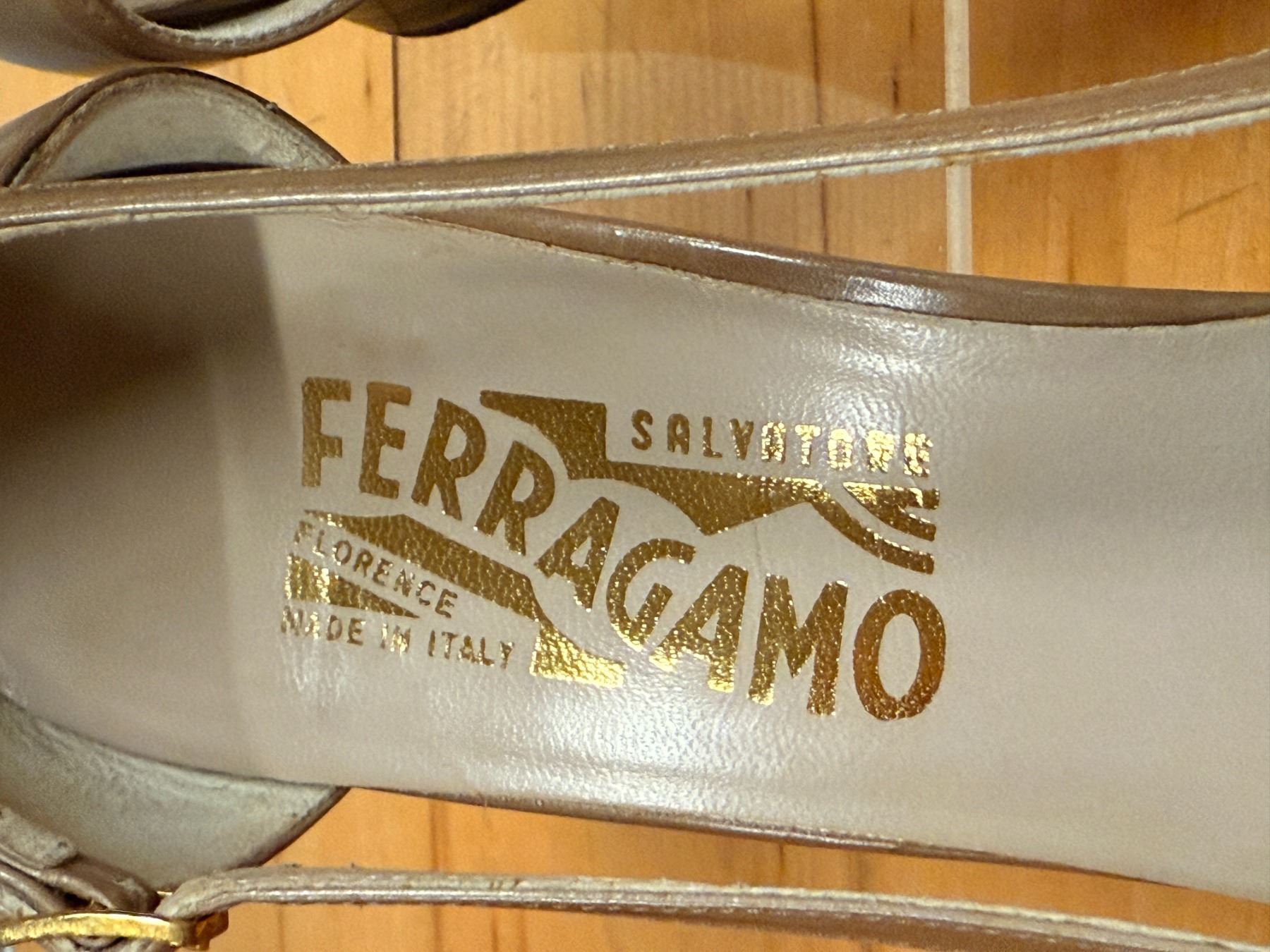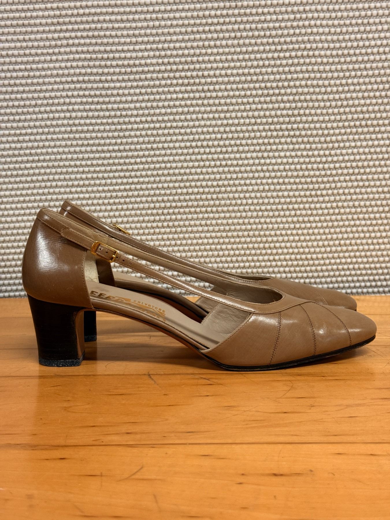 Classic Ferragamo slingback heels in smooth beige calf leather with elegant stitched panel detailing. Finished with a rounded toe, slim adjustable strap with gold-tone buckle, and lightly worn leather insoles. A refined neutral pair ideal for work, special occasions, or polished everyday style.