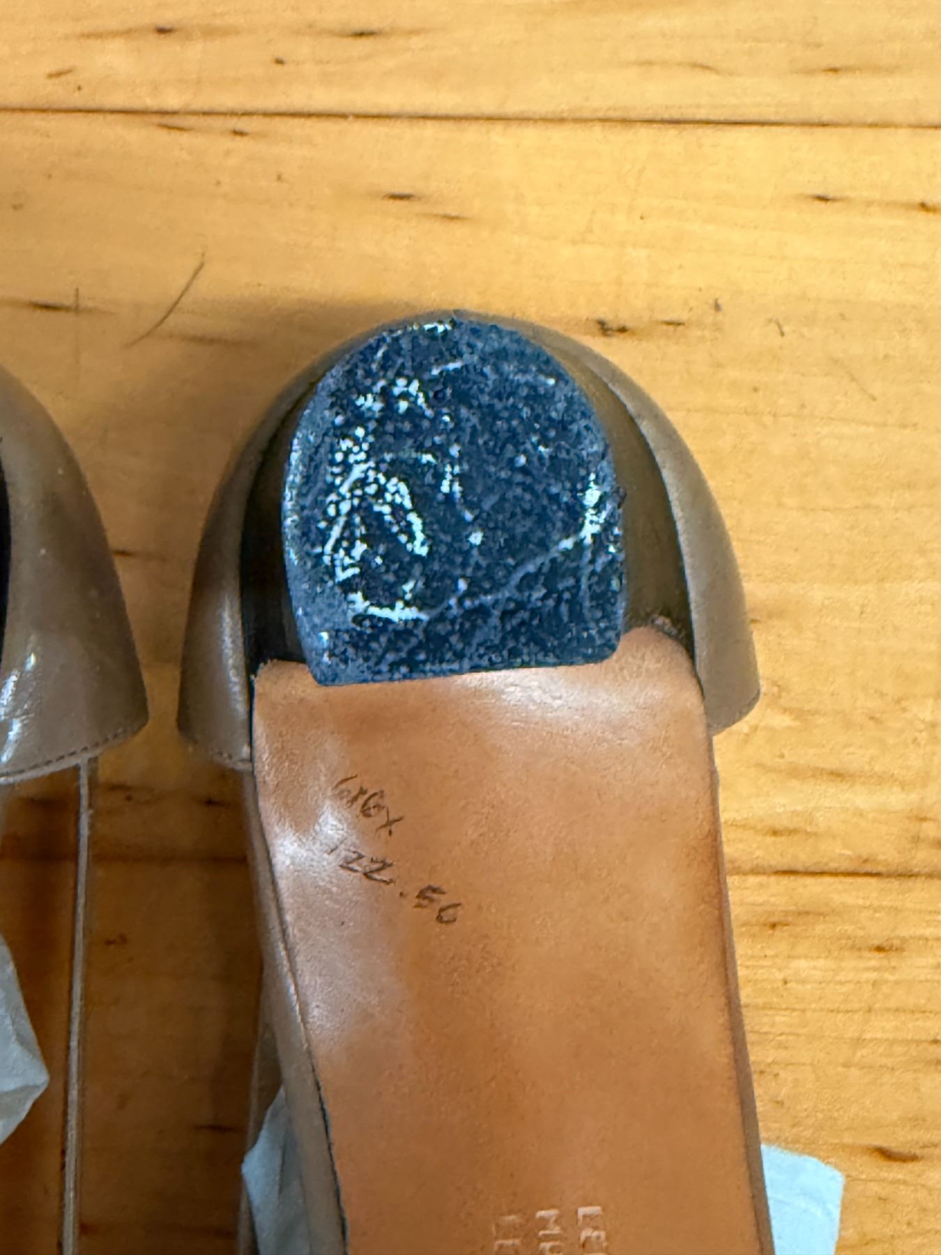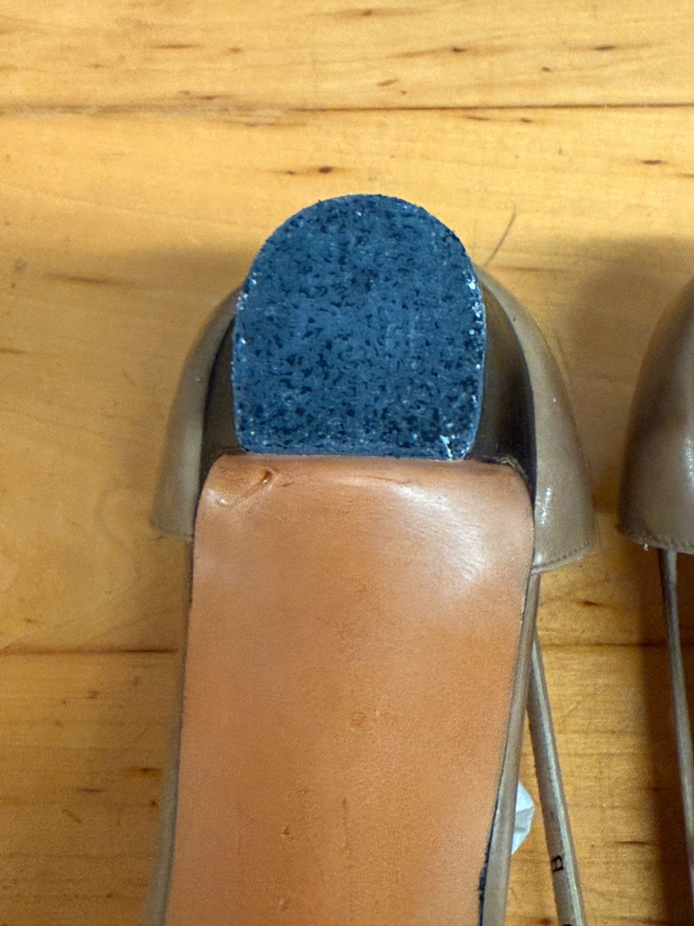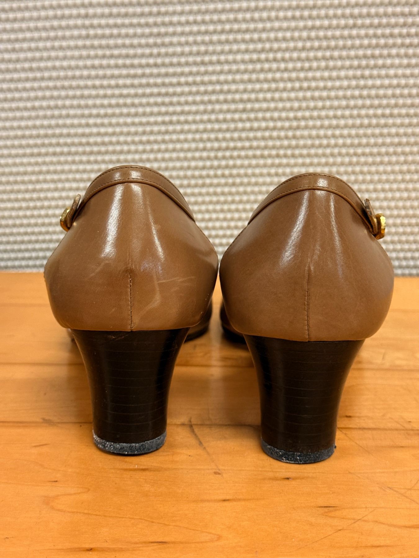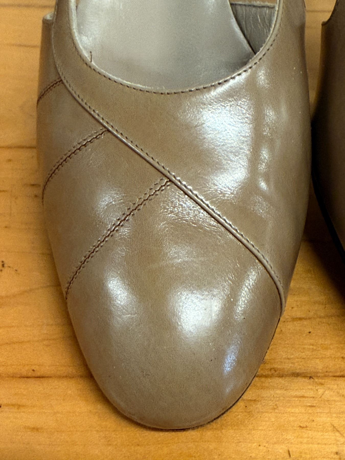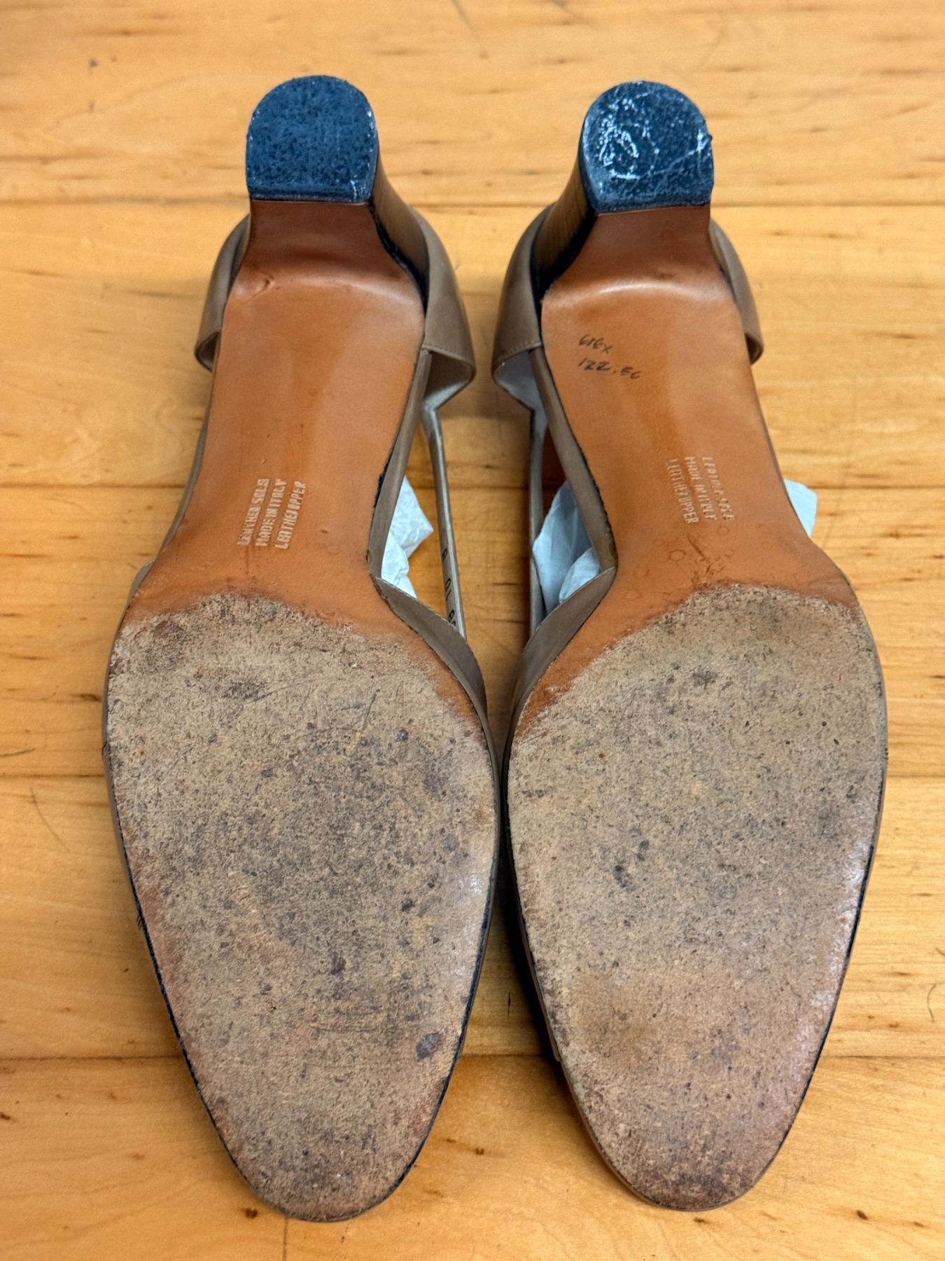 Classic Ferragamo slingback heels in smooth beige calf leather with elegant stitched panel detailing. Finished with a rounded toe, slim adjustable strap with gold-tone buckle, and lightly worn leather insoles. A refined neutral pair ideal for work, special occasions, or polished everyday style.