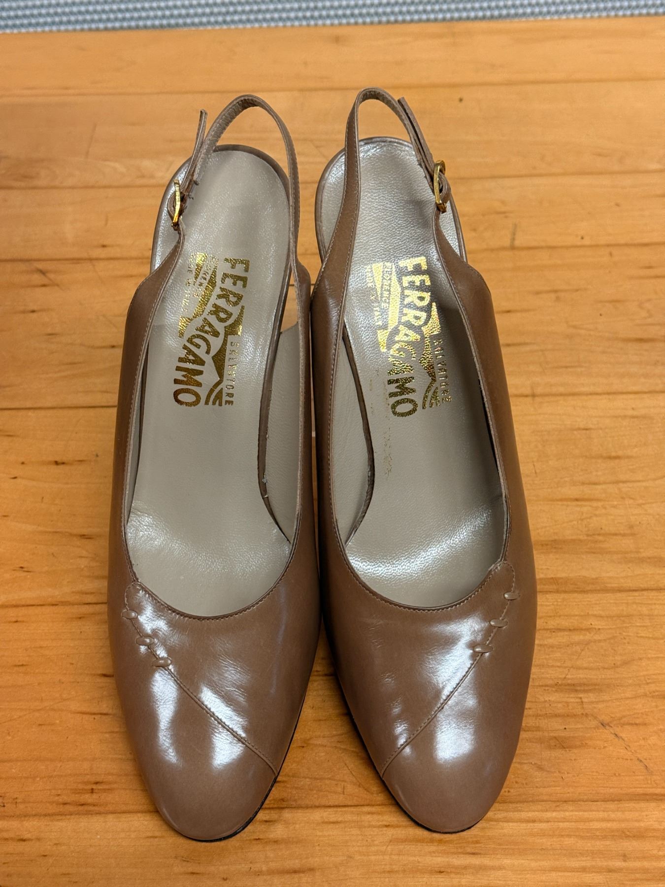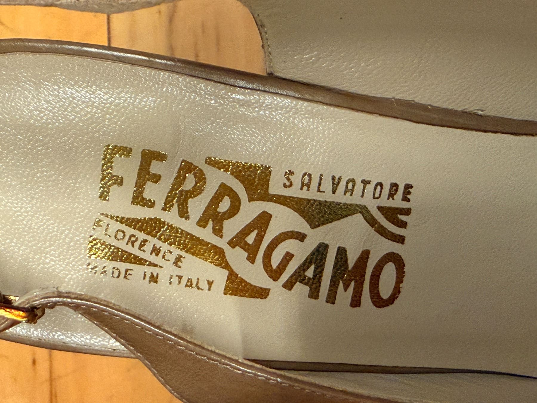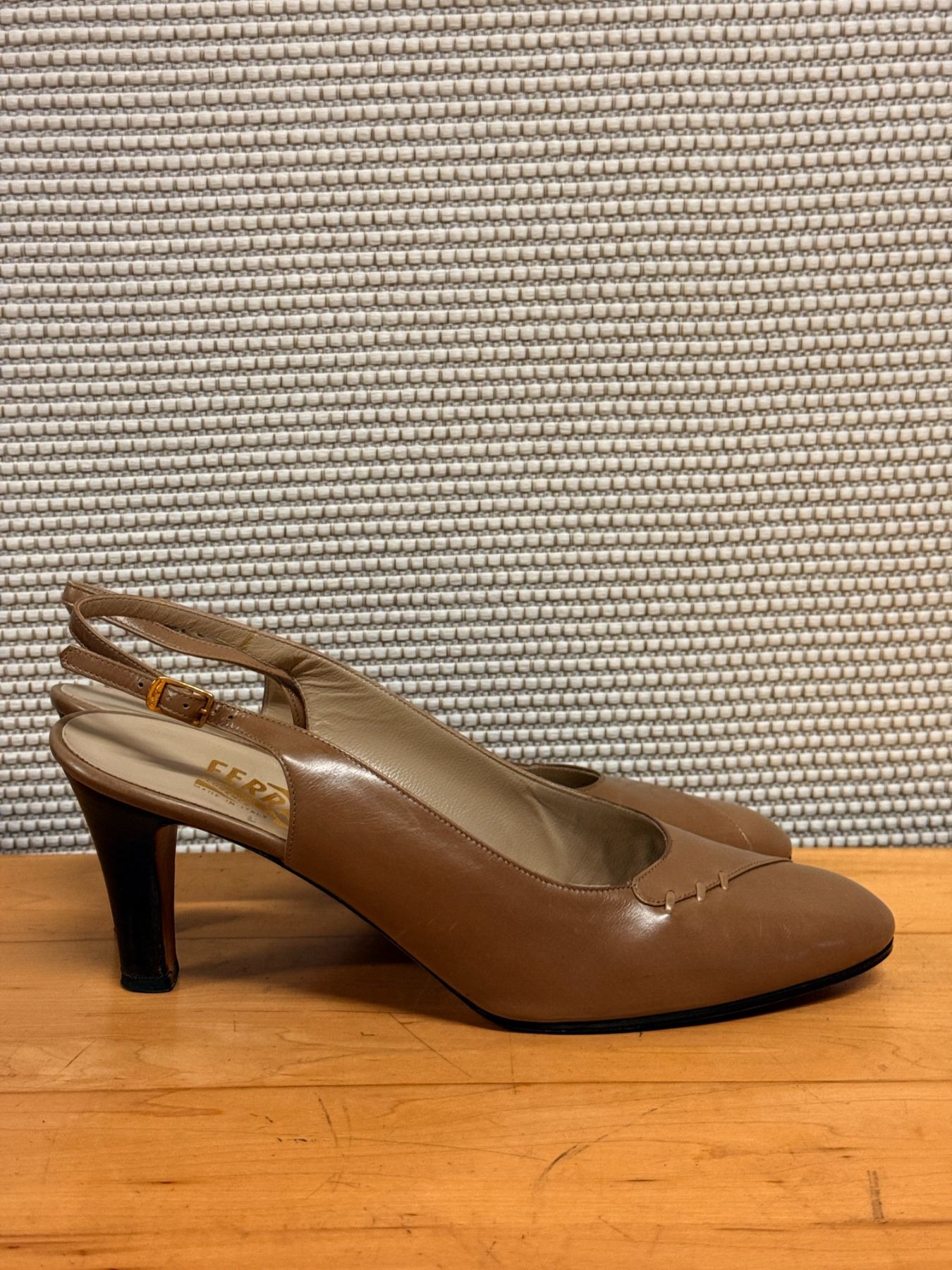 Classic Ferragamo slingbacks in smooth beige calf leather with stitched detailing and gold buckle straps. Clean, elegant, and perfect for everyday wear or work outfits.