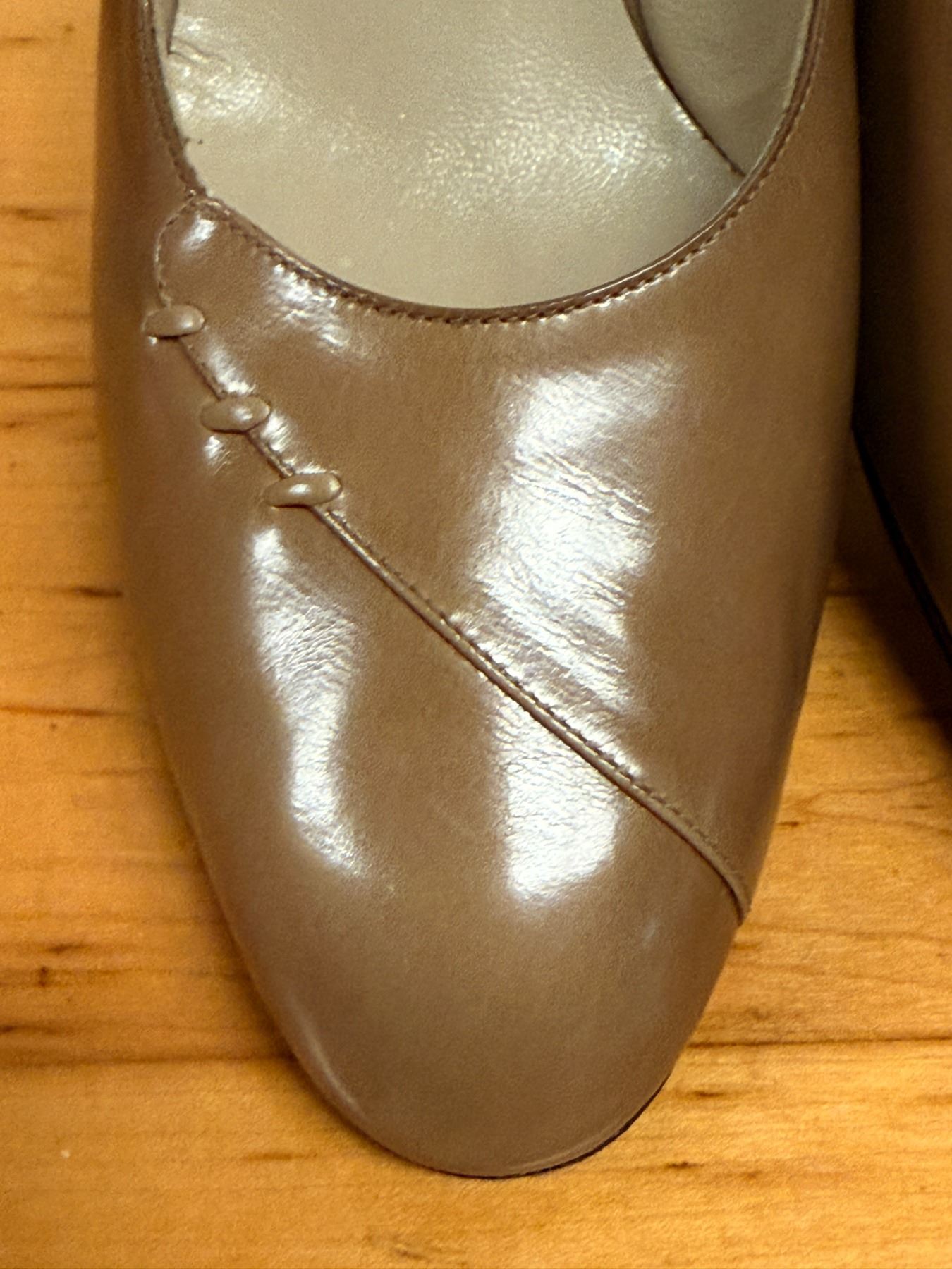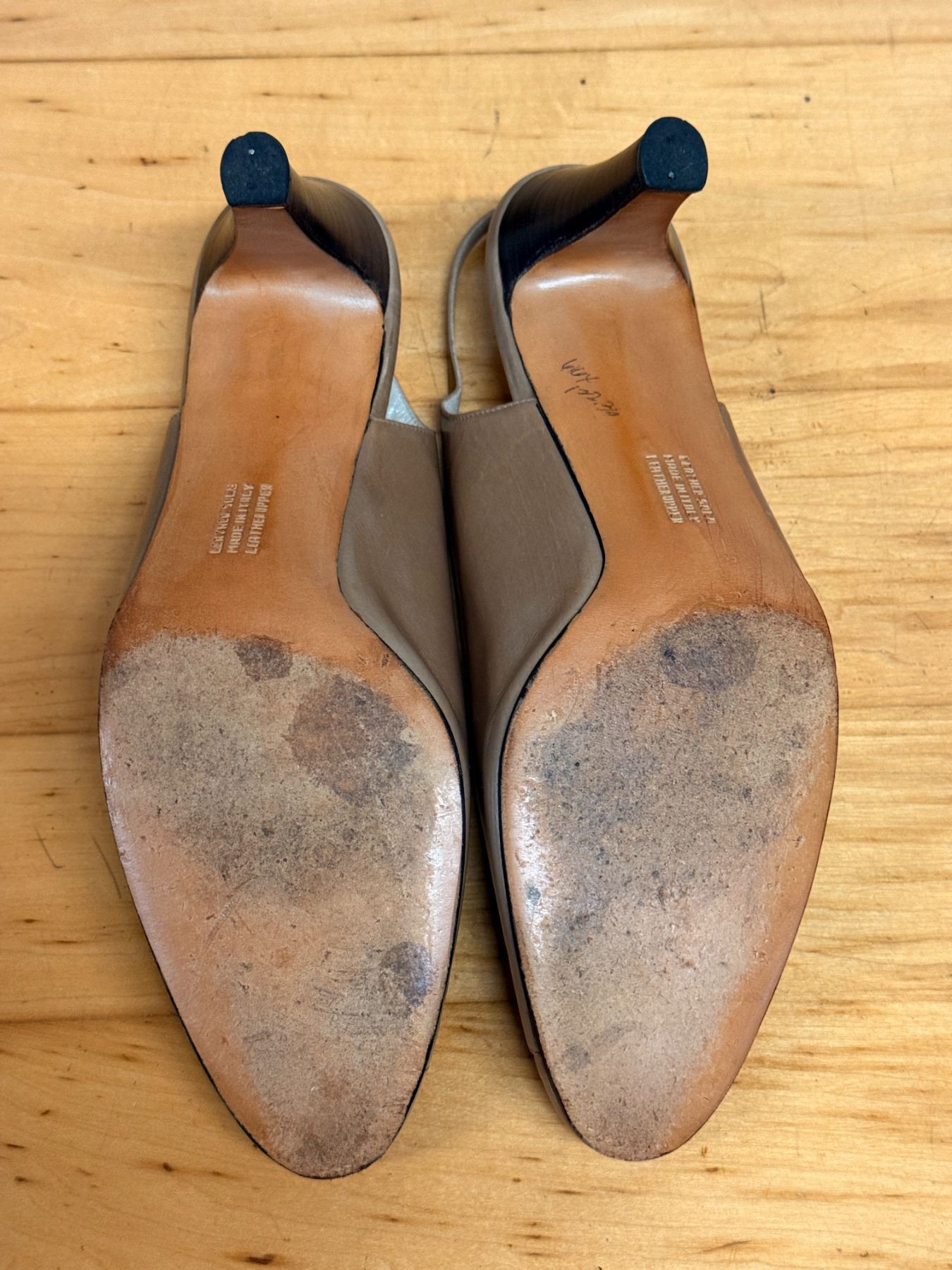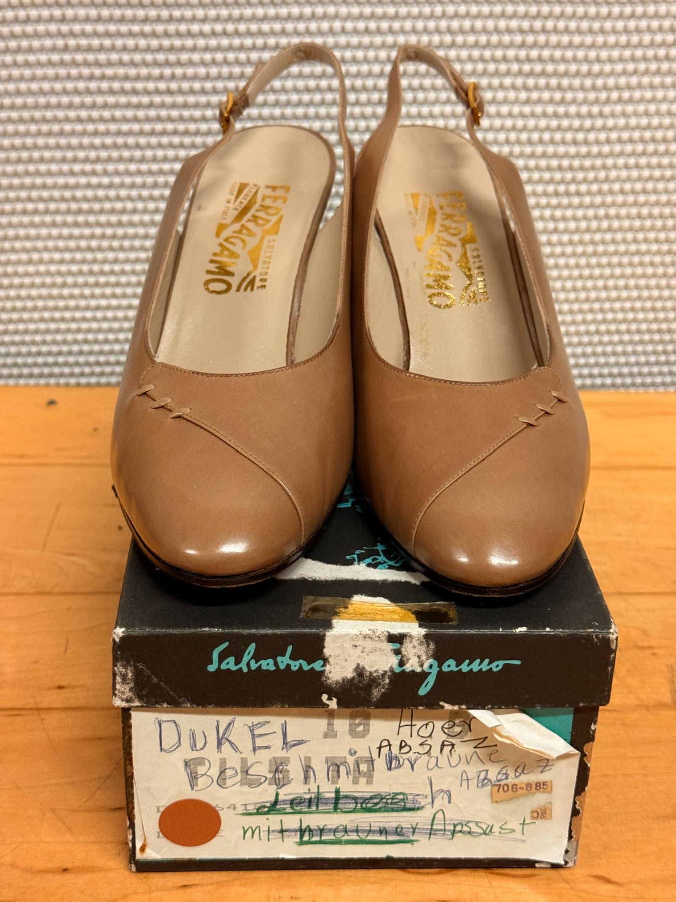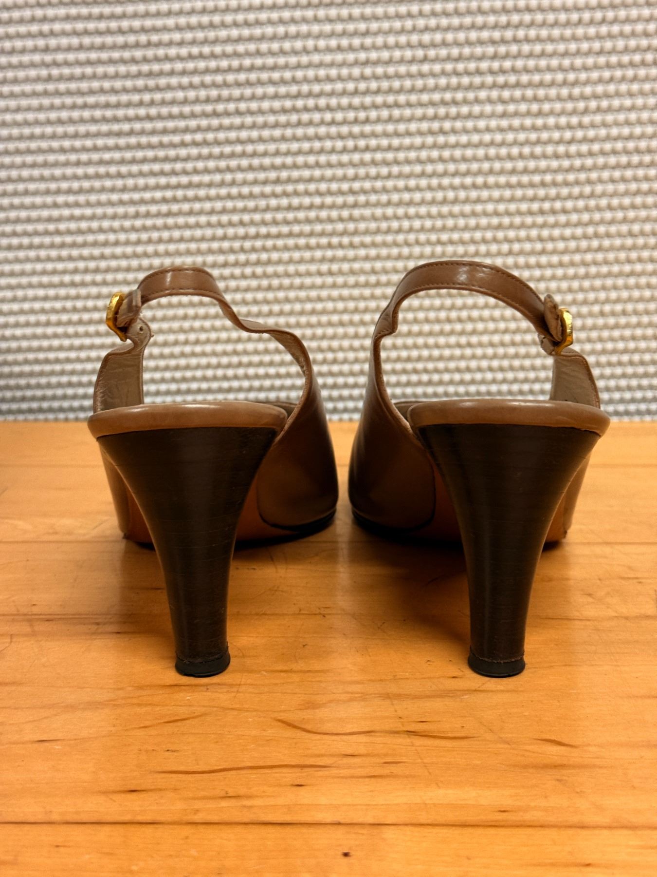 Classic Ferragamo slingbacks in smooth beige calf leather with stitched detailing and gold buckle straps. Clean, elegant, and perfect for everyday wear or work outfits.