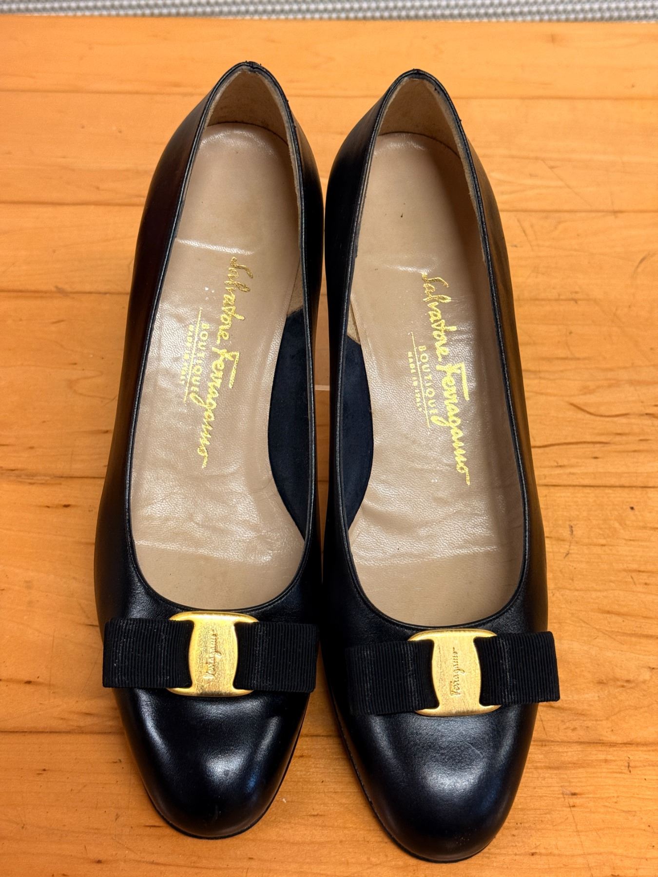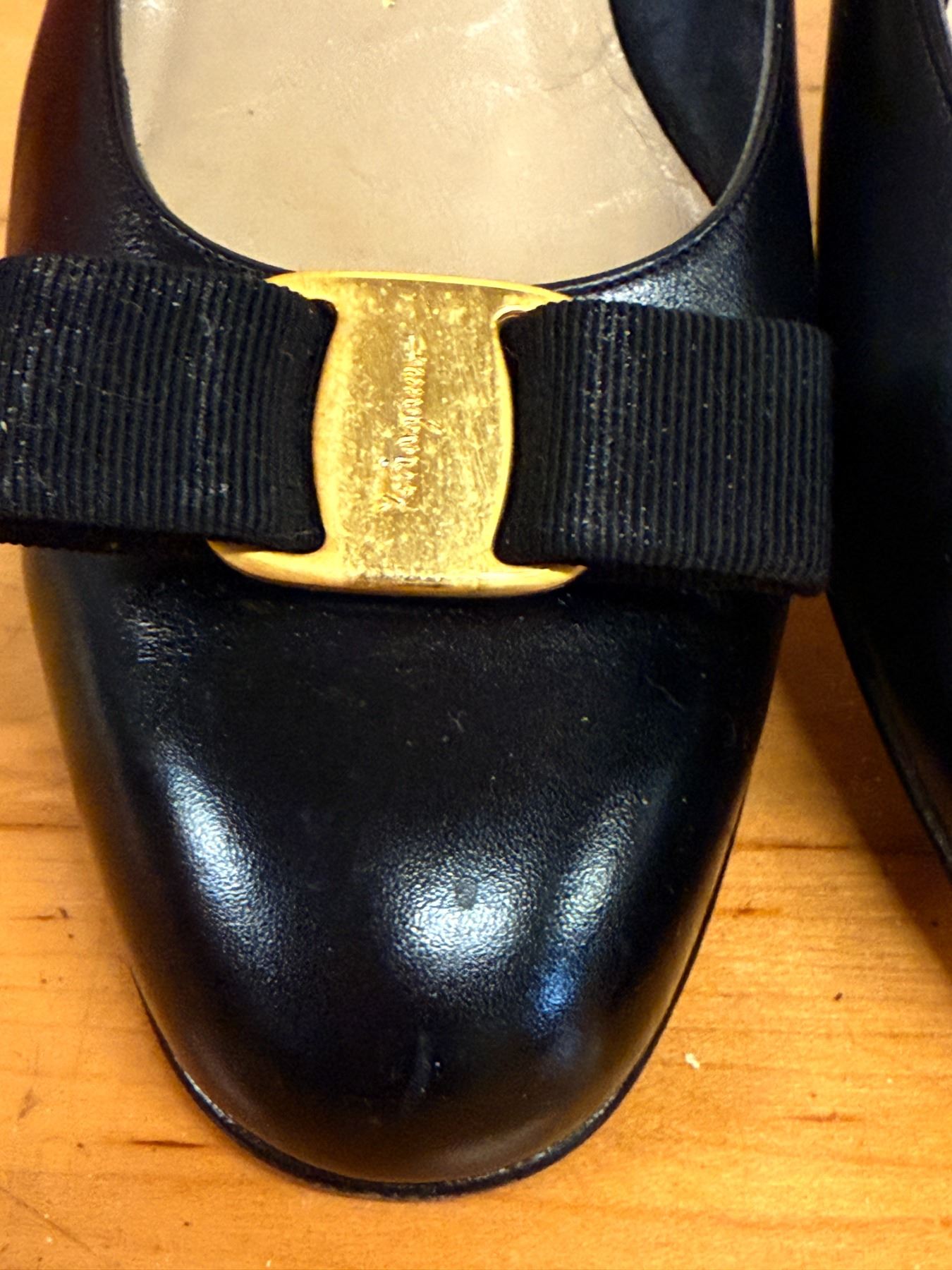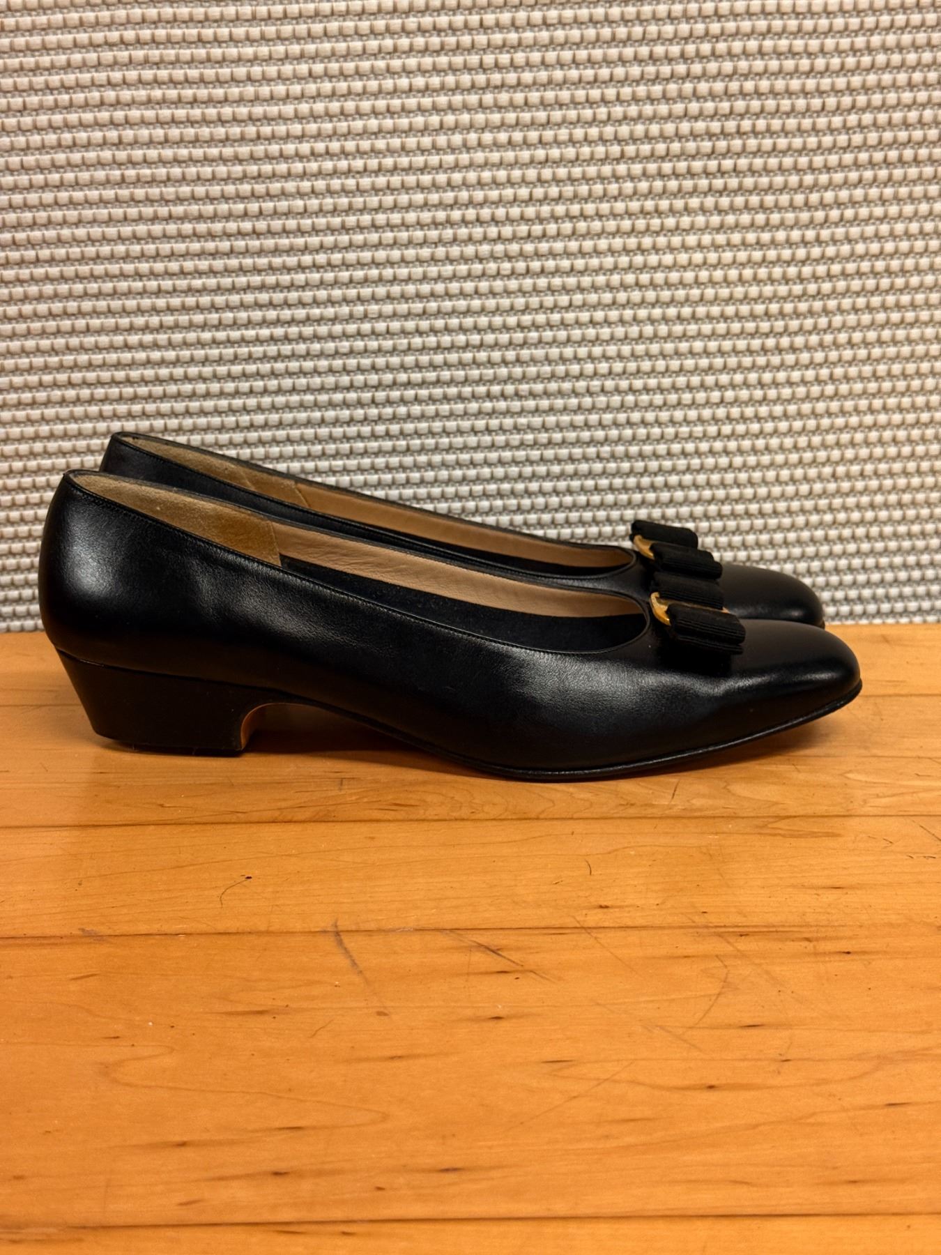 Classic Ferragamo pumps in black calfskin with signature grosgrain bows and gold Vara-style hardware. Features a rounded toe, smooth leather lining, and light interior wear from storage. Timeless, elegant, and perfect for both office and evening looks