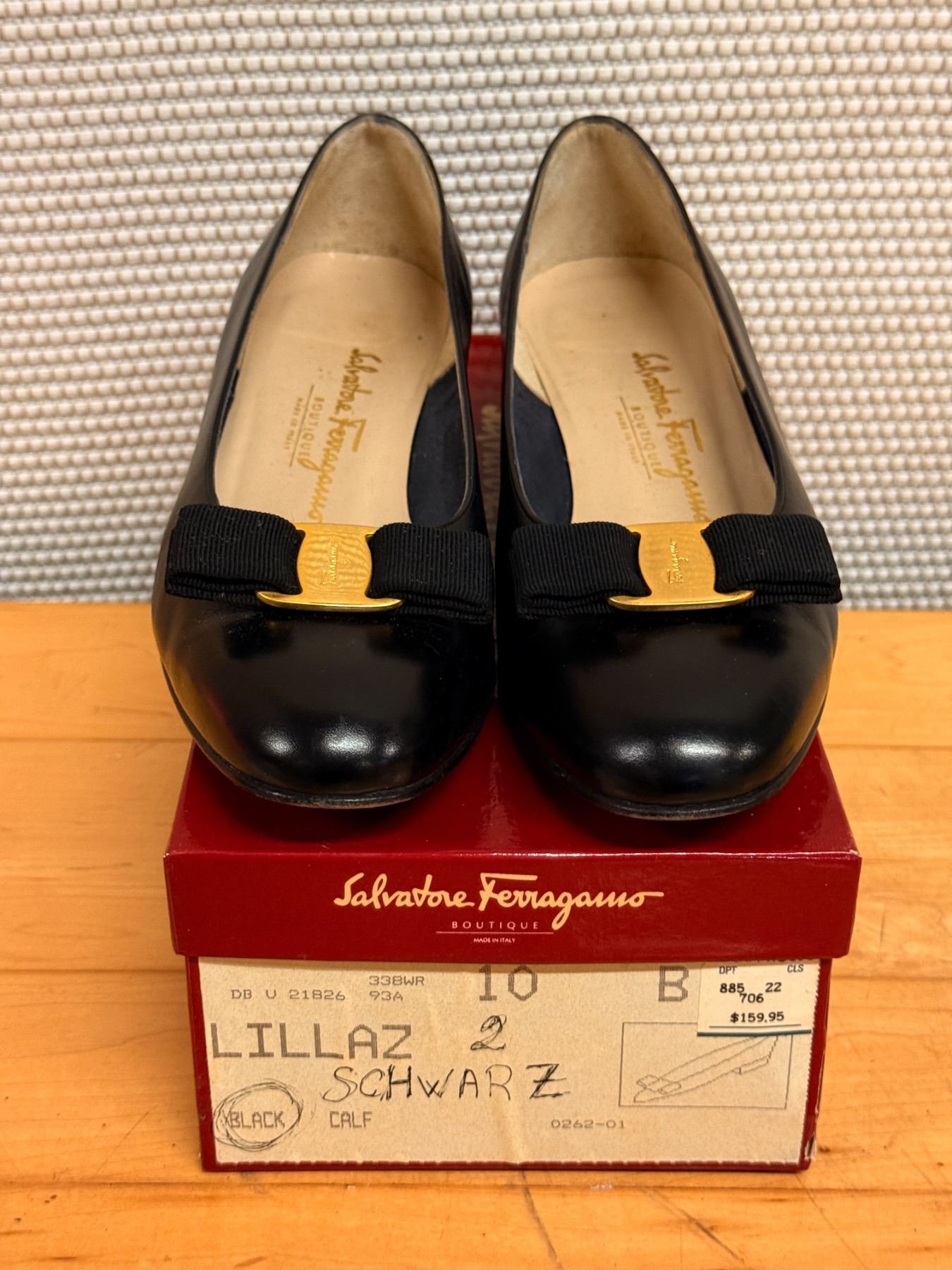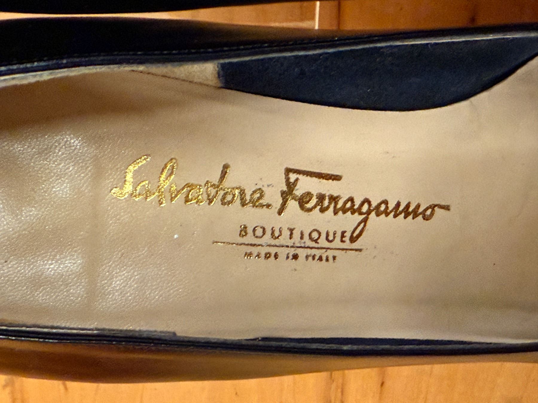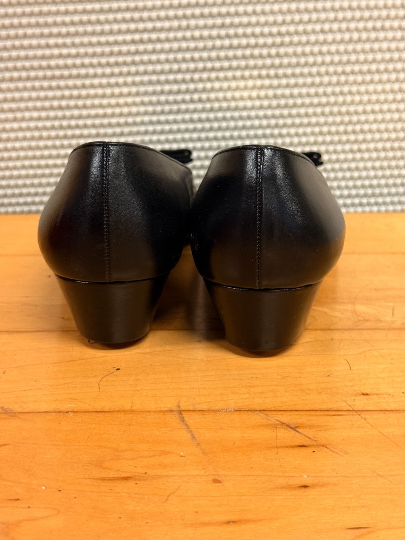 Classic Ferragamo pumps in black calfskin with signature grosgrain bows and gold Vara-style hardware. Features a rounded toe, smooth leather lining, and light interior wear from storage. Timeless, elegant, and perfect for both office and evening looks