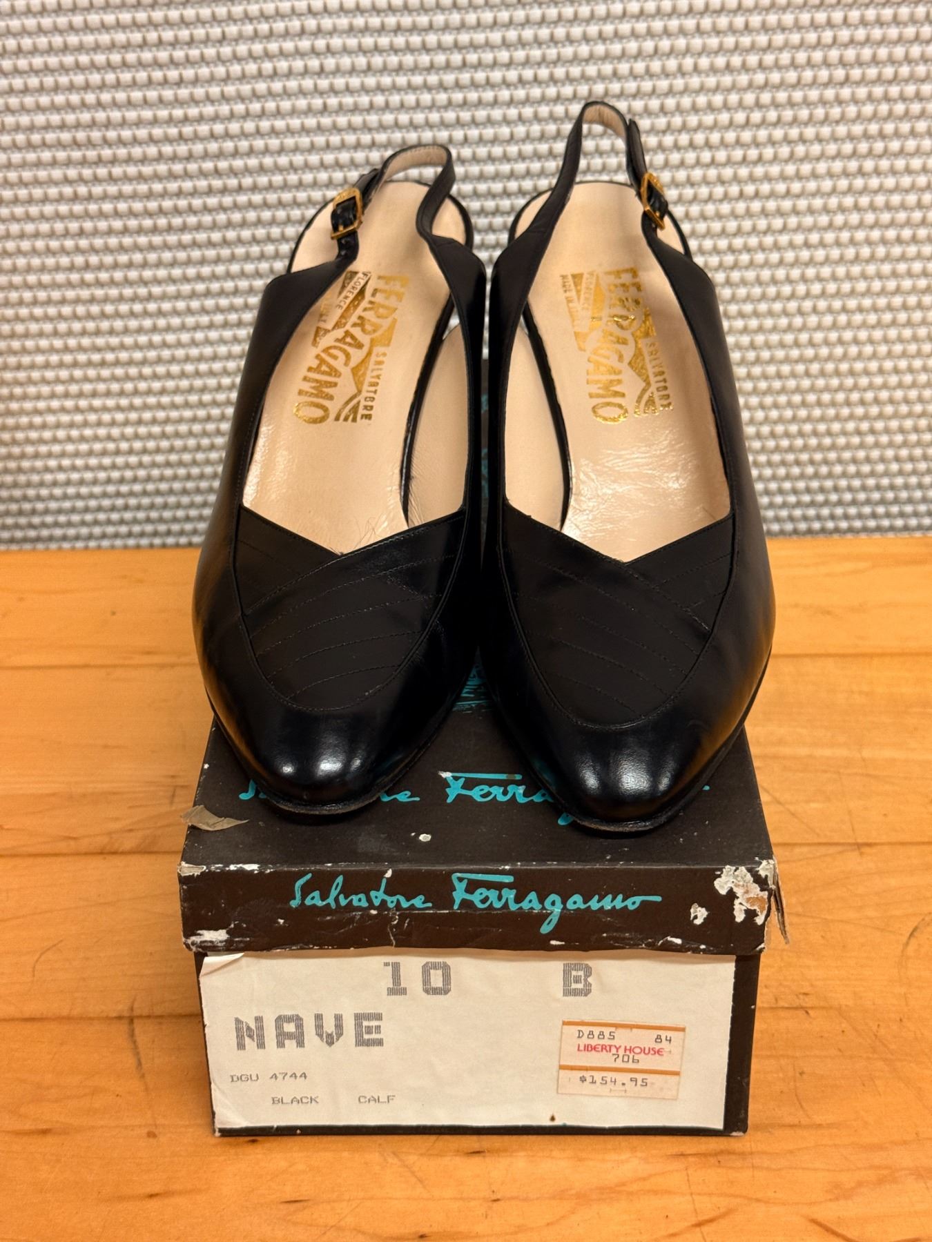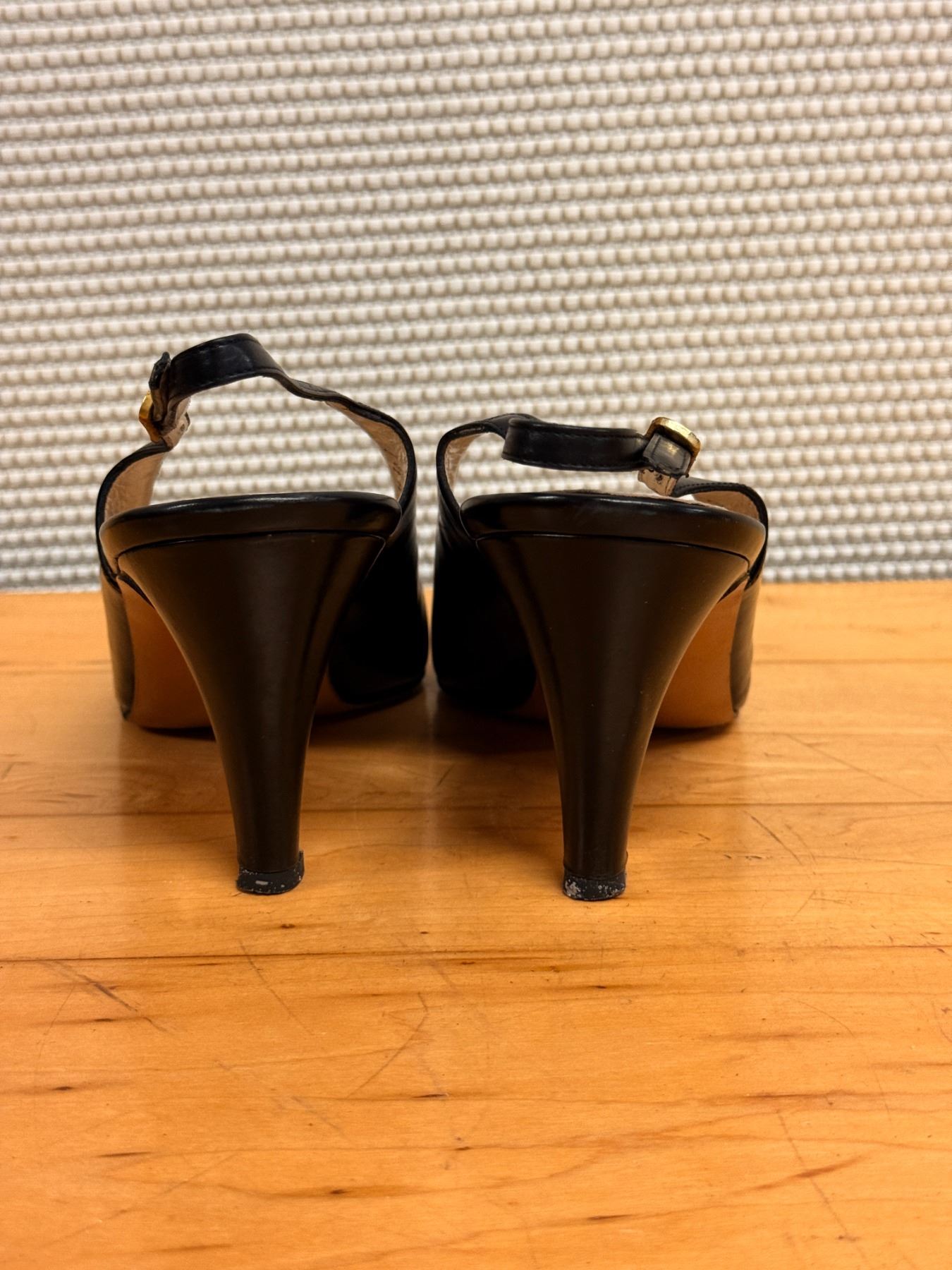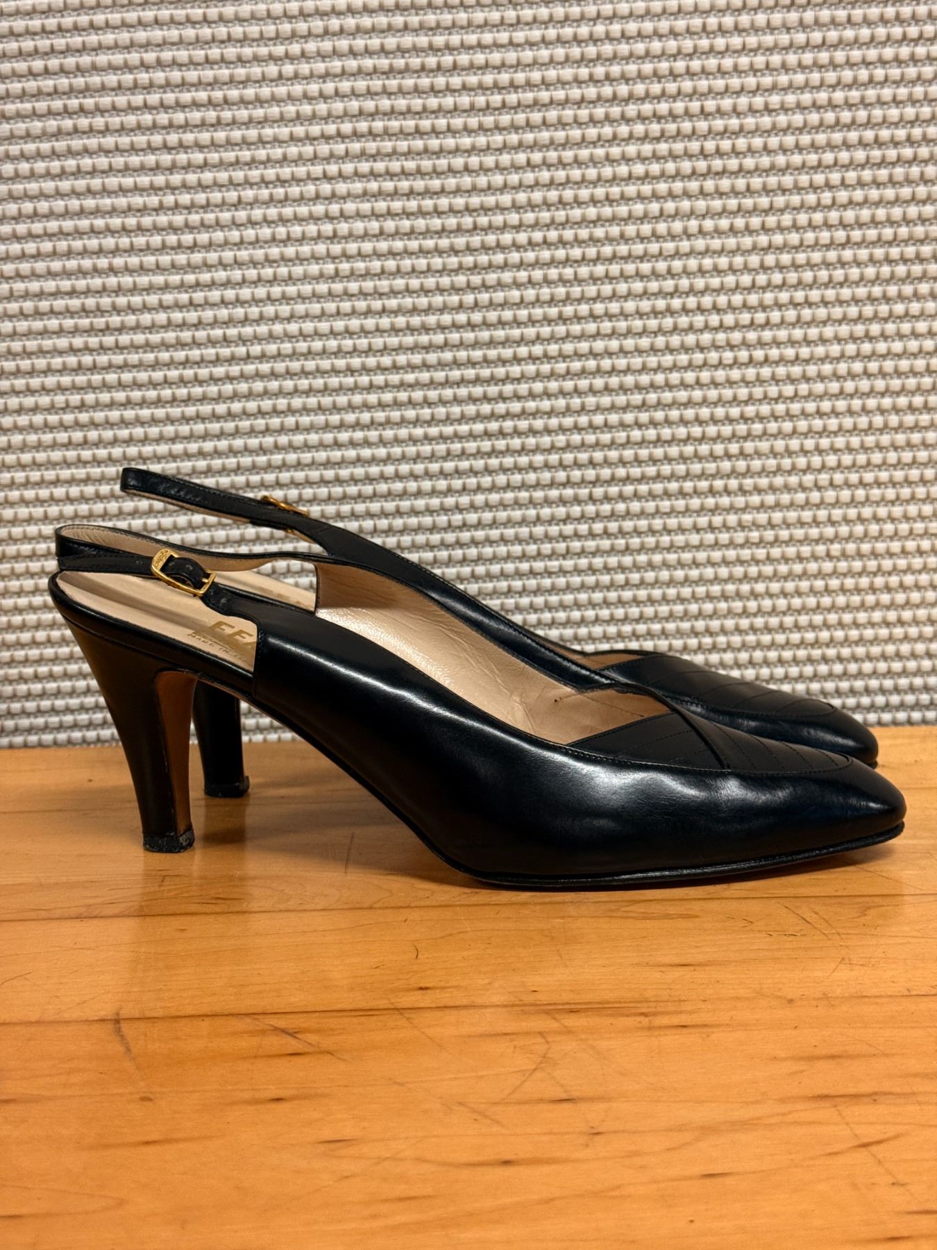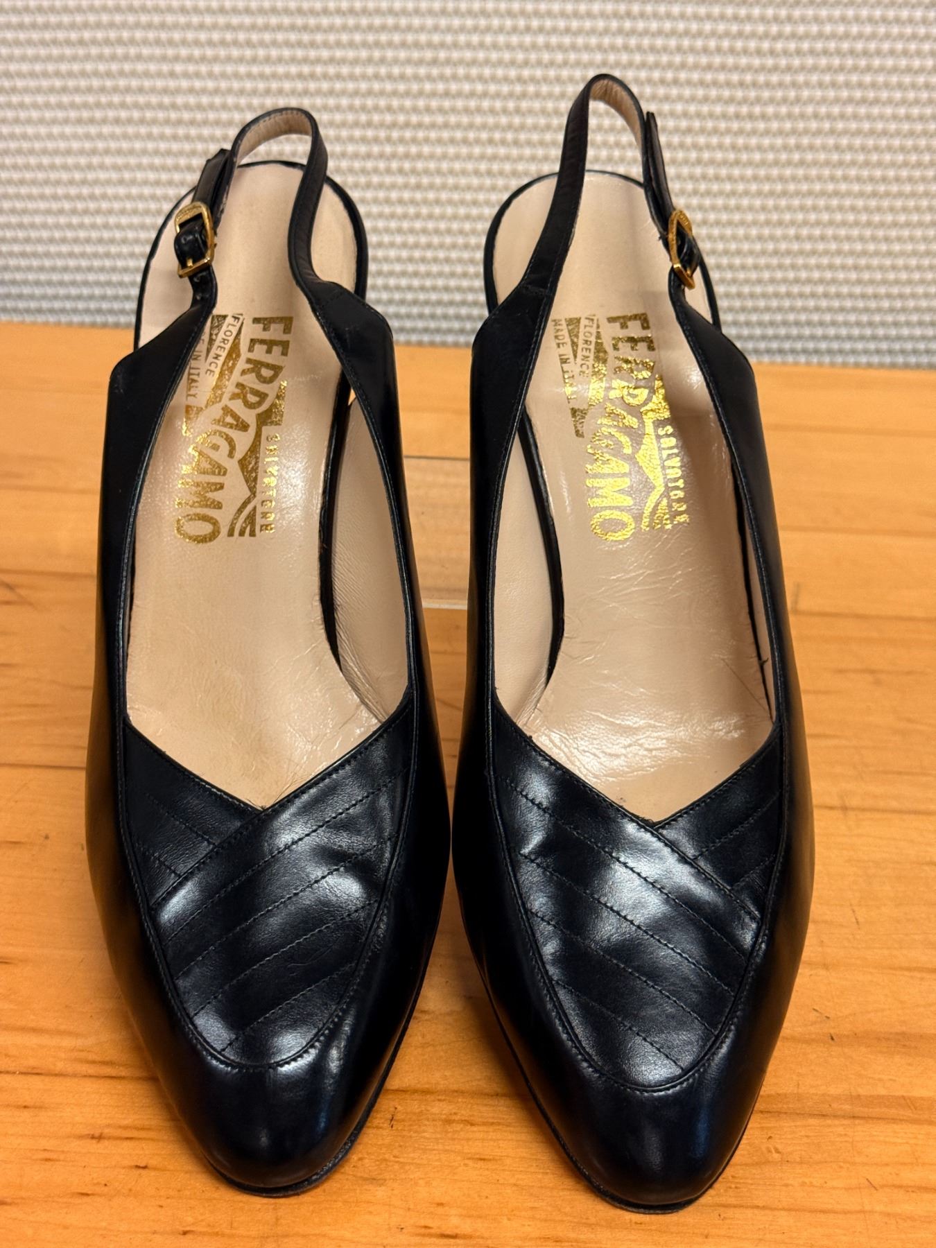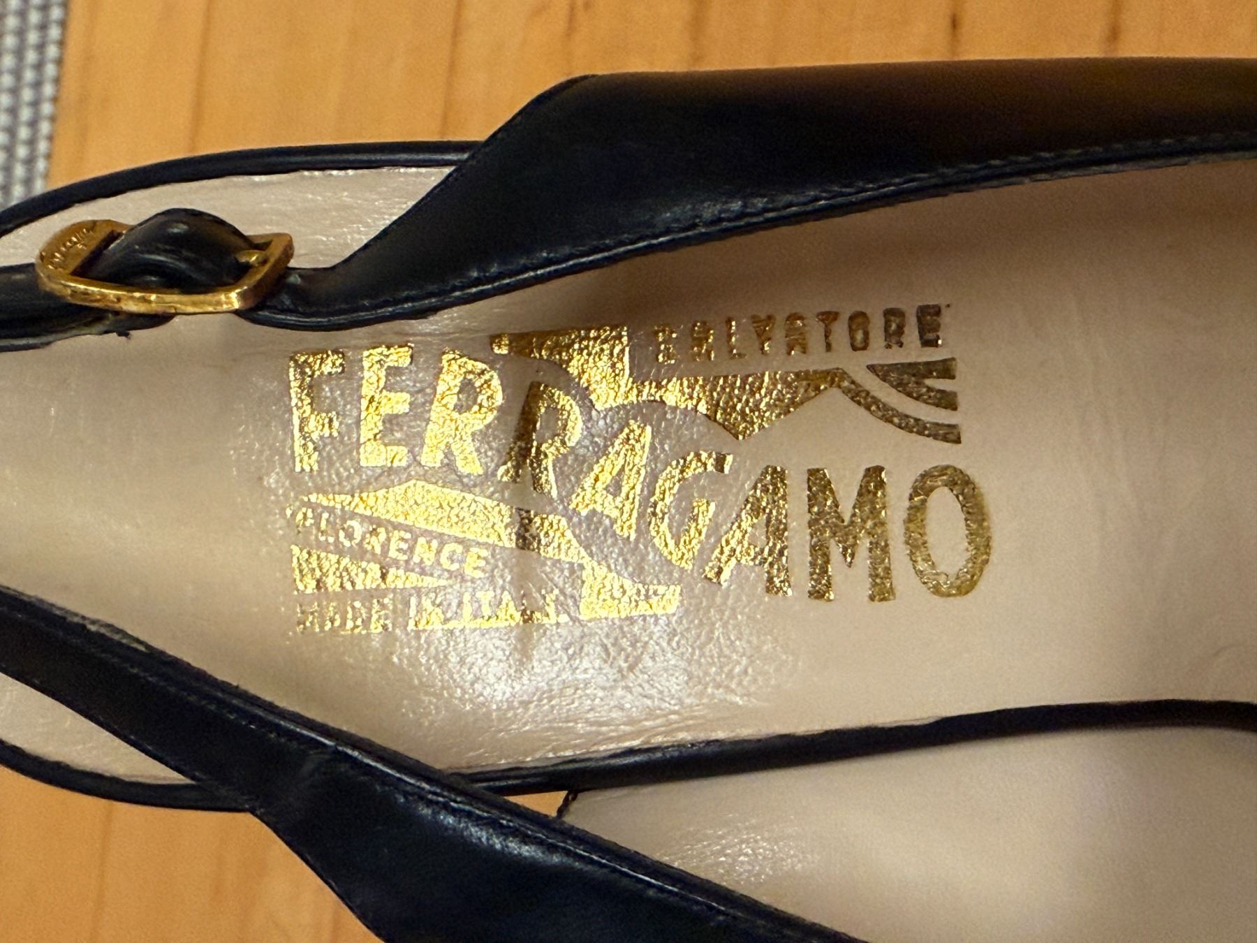 Classic black leather slingbacks with a sleek pointed toe and subtle stitched detailing. Timeless Ferragamo style perfect for work or evening wear.