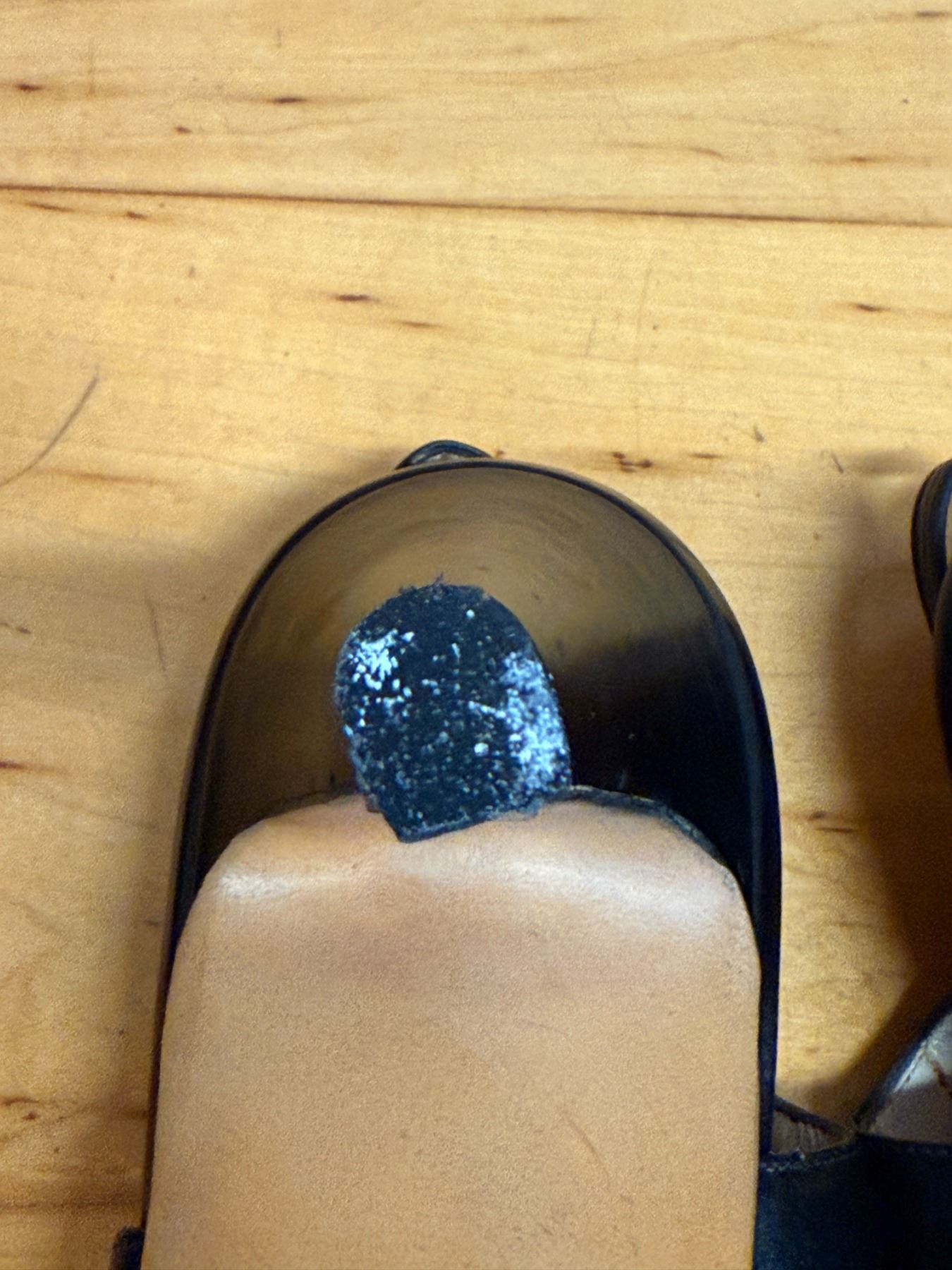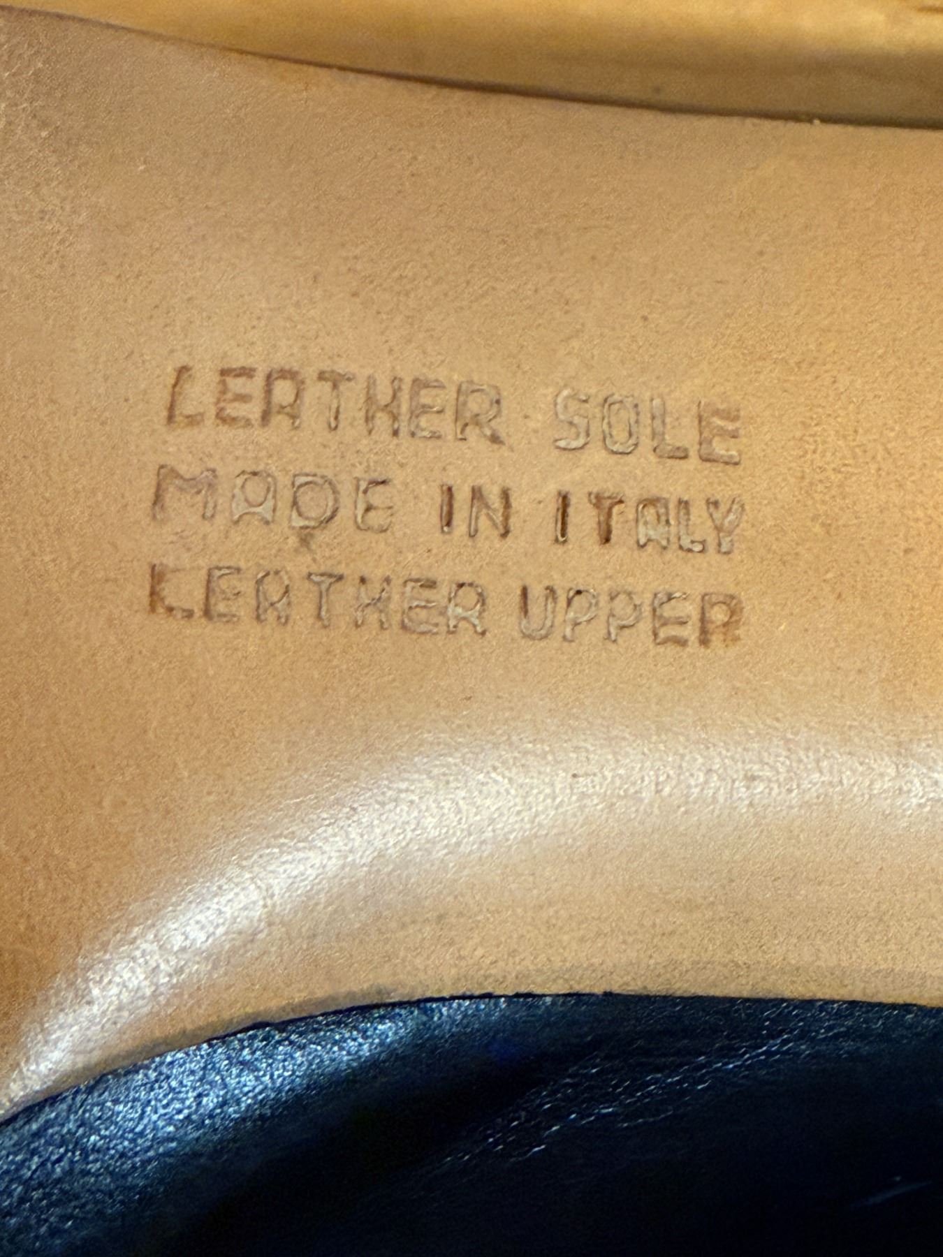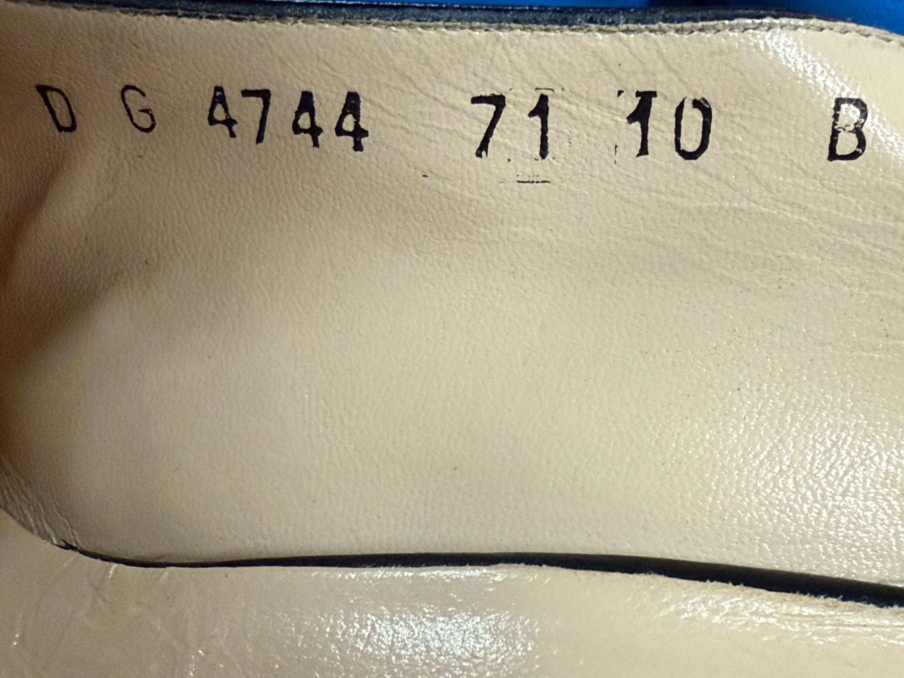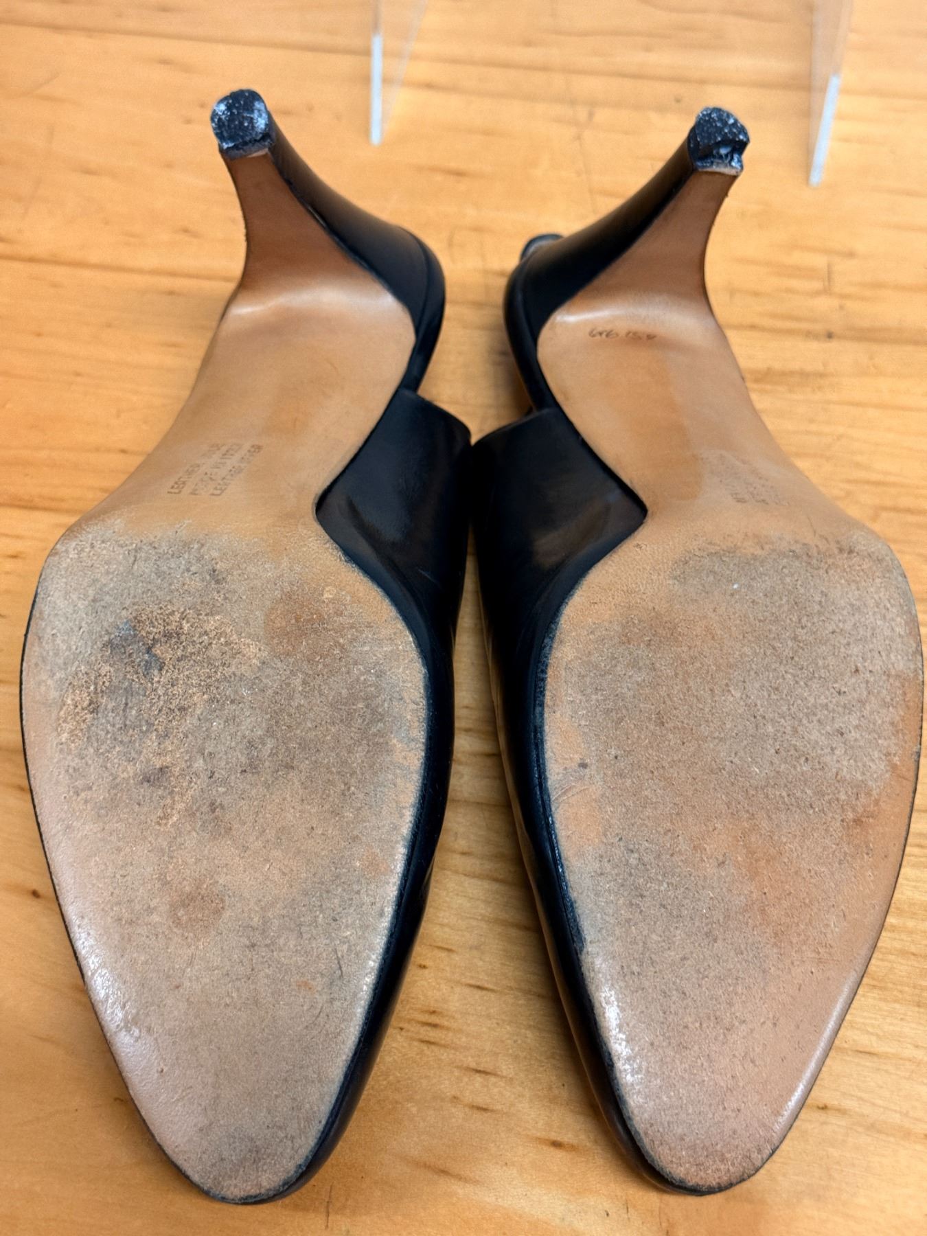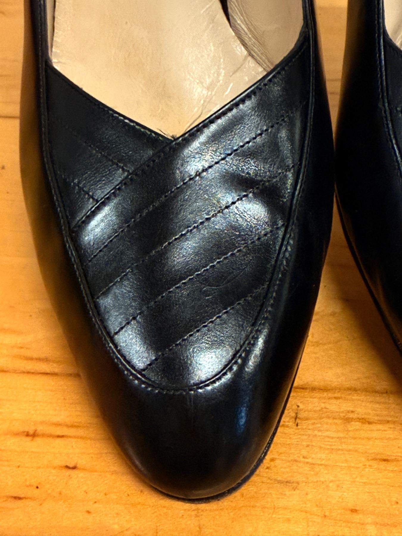 Classic black leather slingbacks with a sleek pointed toe and subtle stitched detailing. Timeless Ferragamo style perfect for work or evening wear.