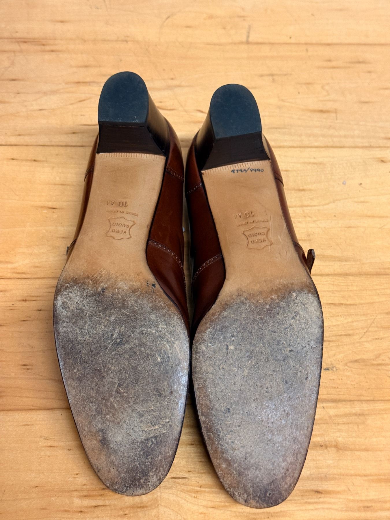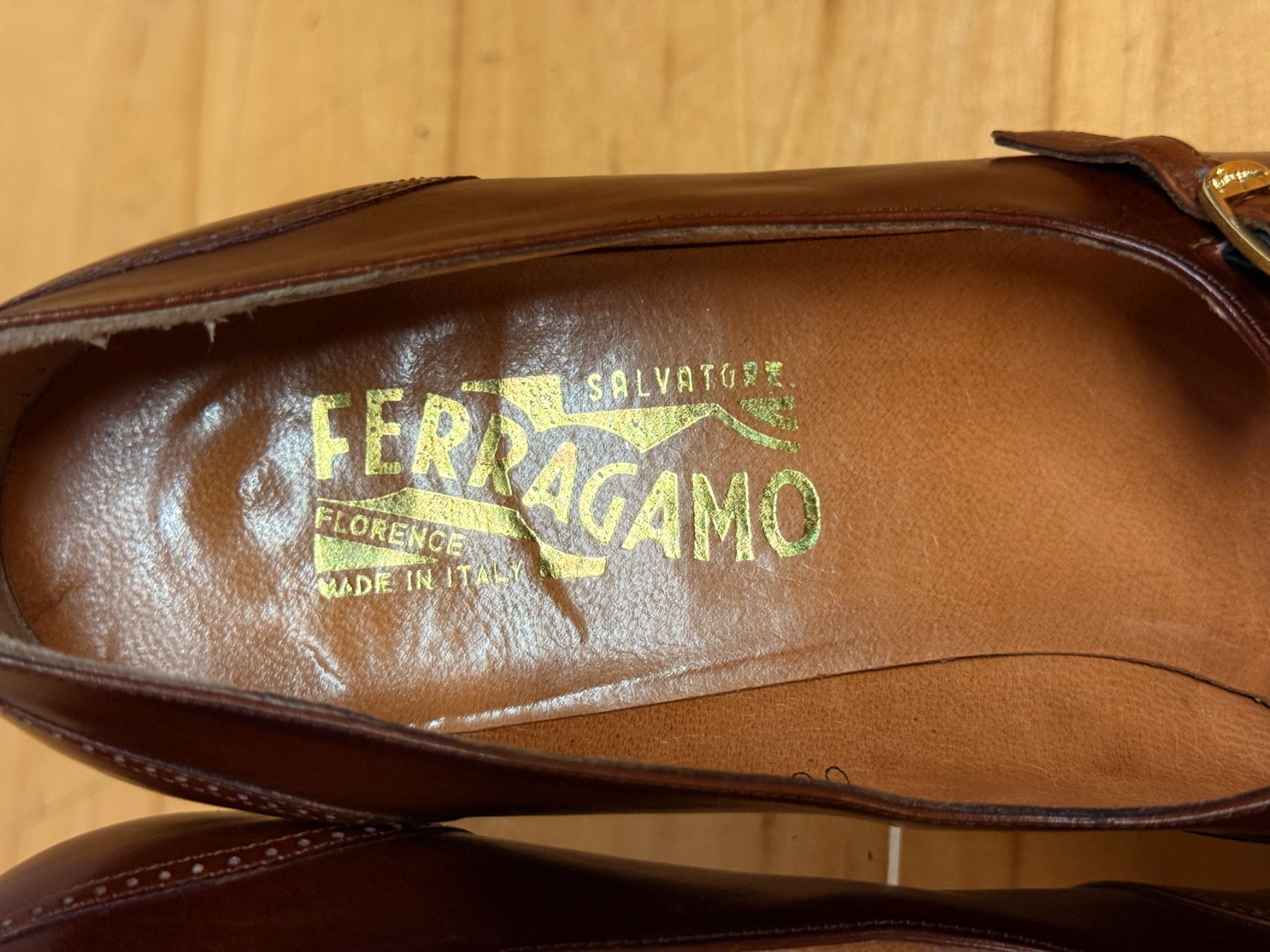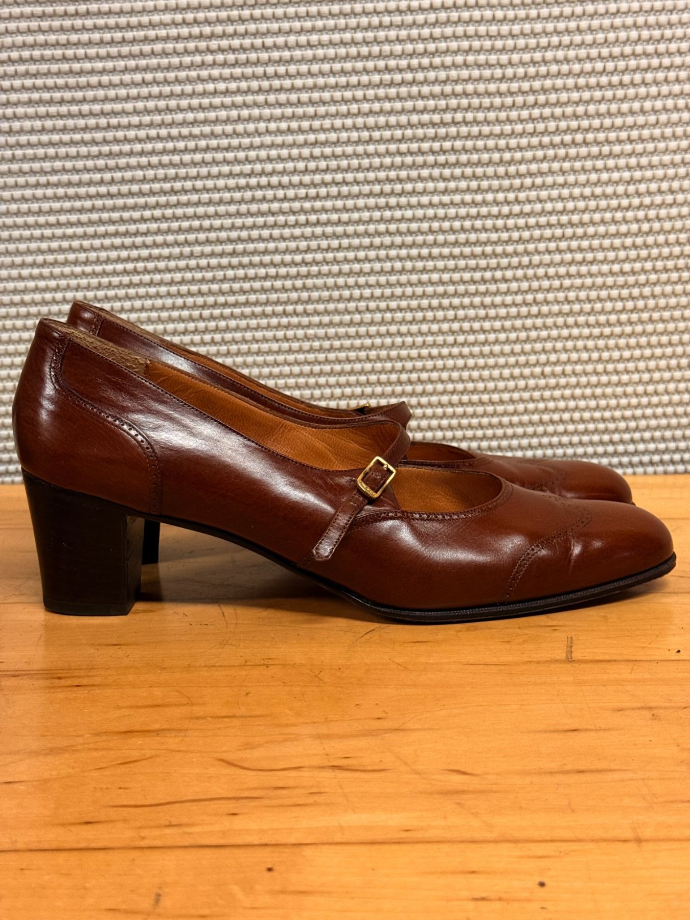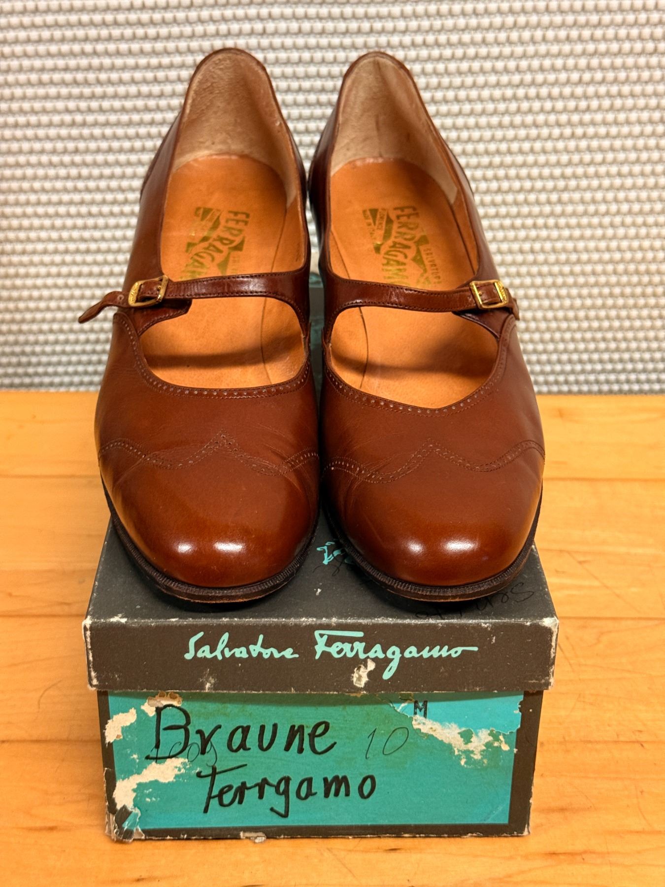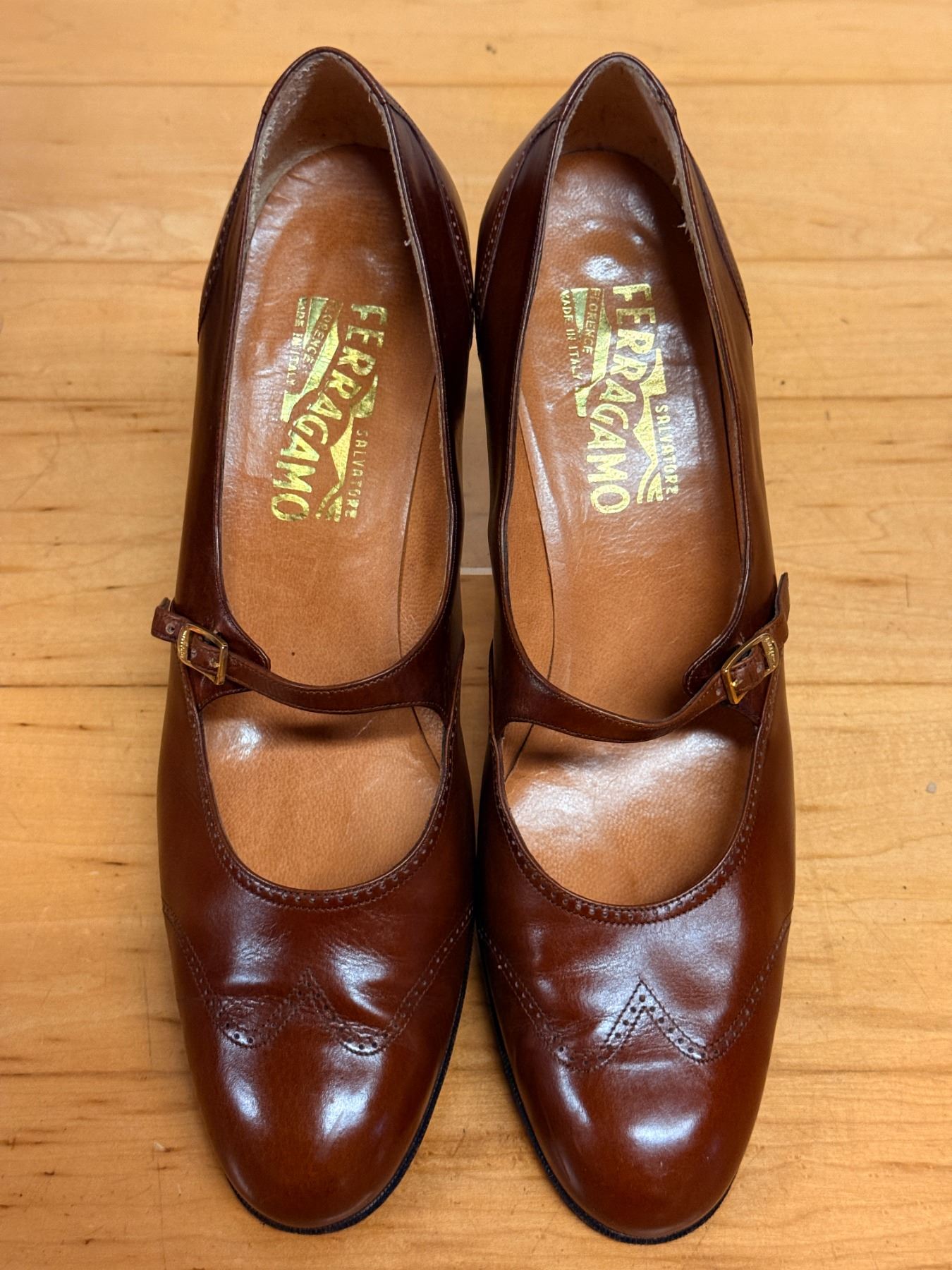 Rich brown leather Mary Jane heels with classic Ferragamo craftsmanship, gold buckle straps, and subtle stitched detailing. Timeless, polished, and ideal for everyday or office wear.