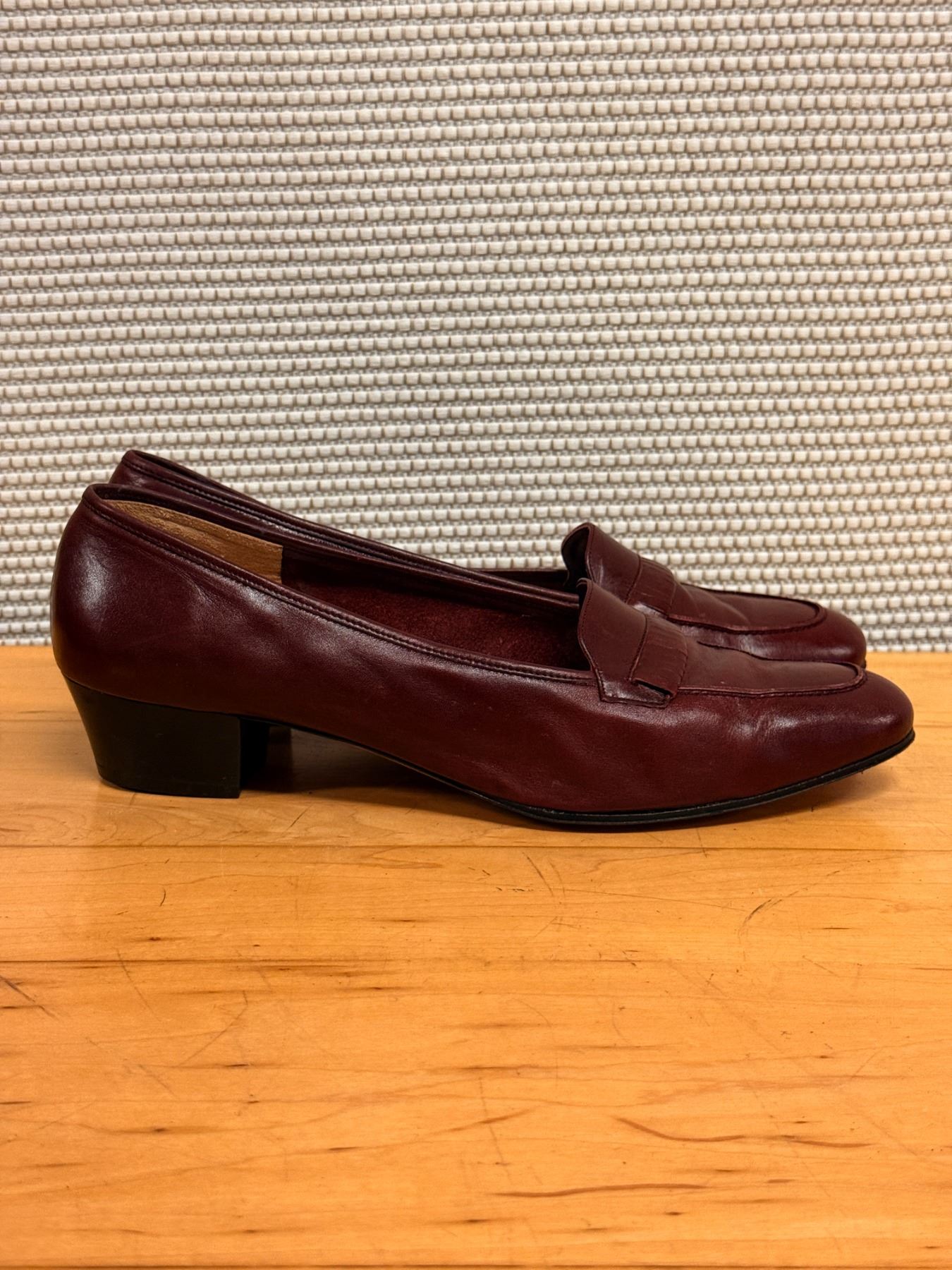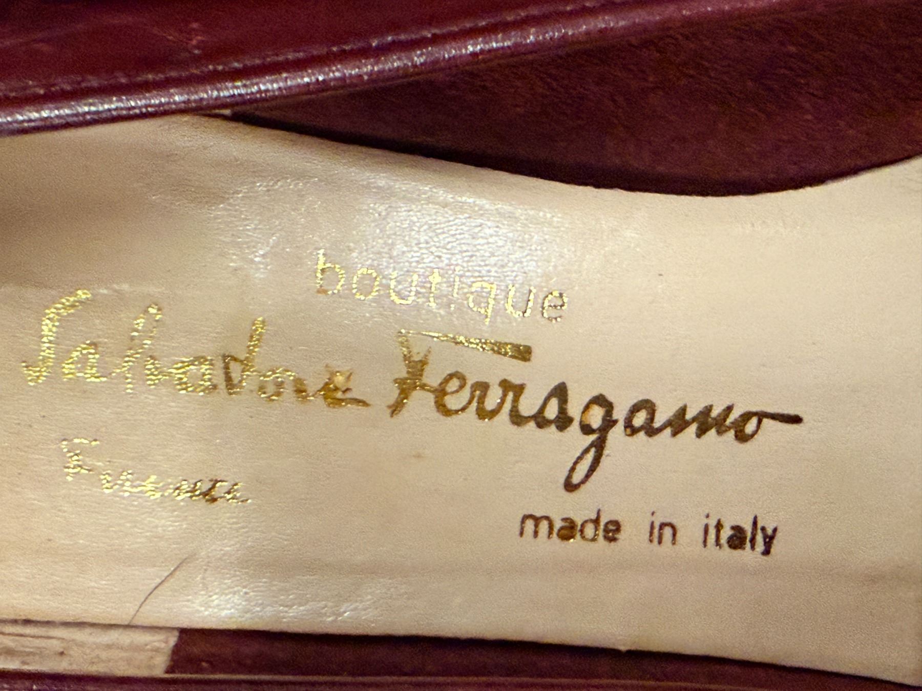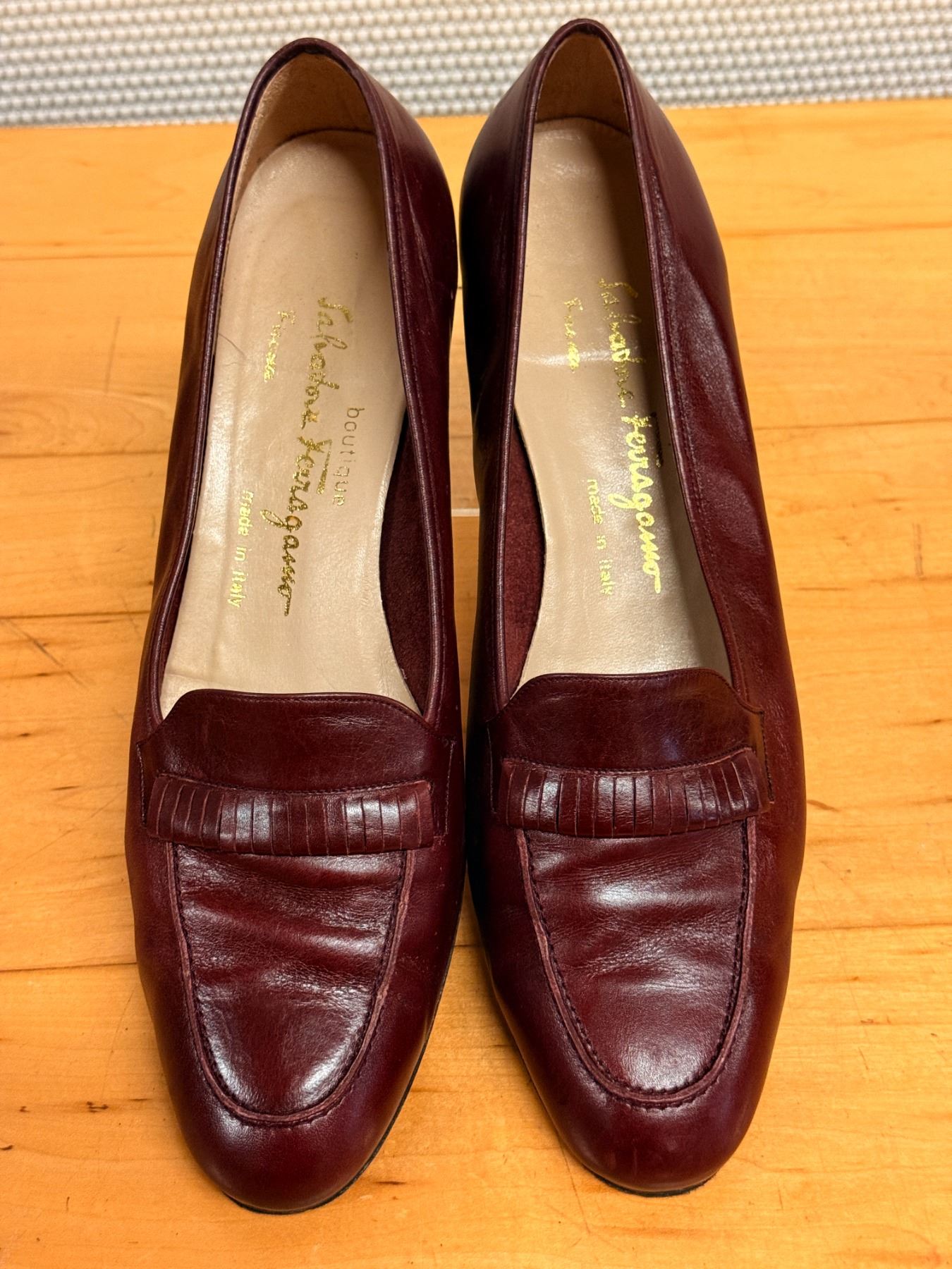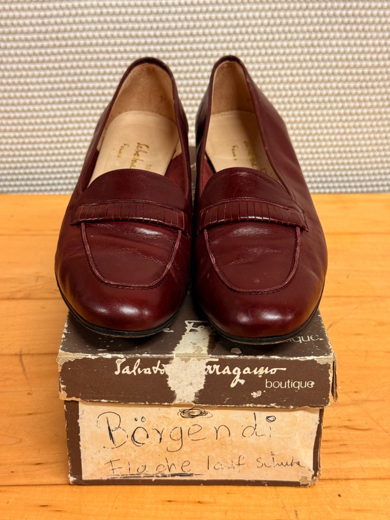 Rich burgundy leather loafers with a sleek, polished finish. A classic Ferragamo flat with elegant stitching for timeless everyday wear.