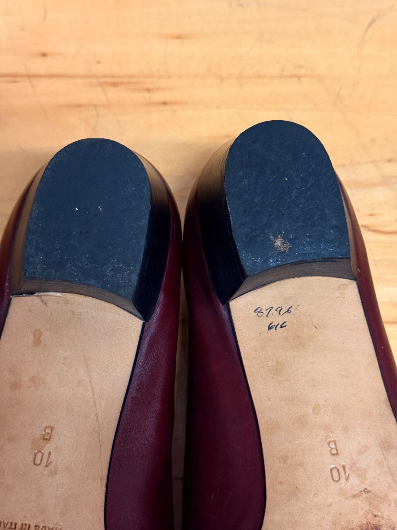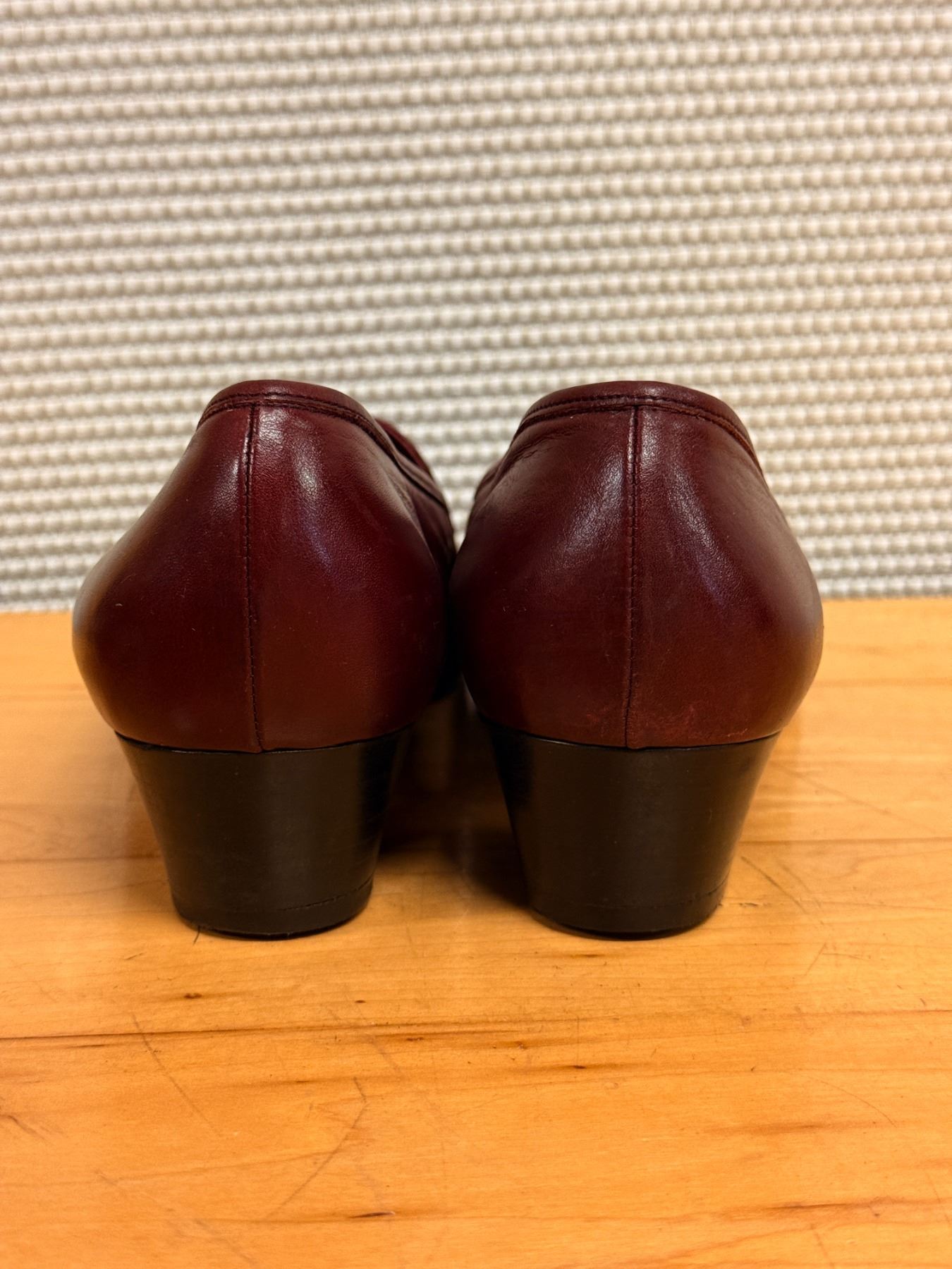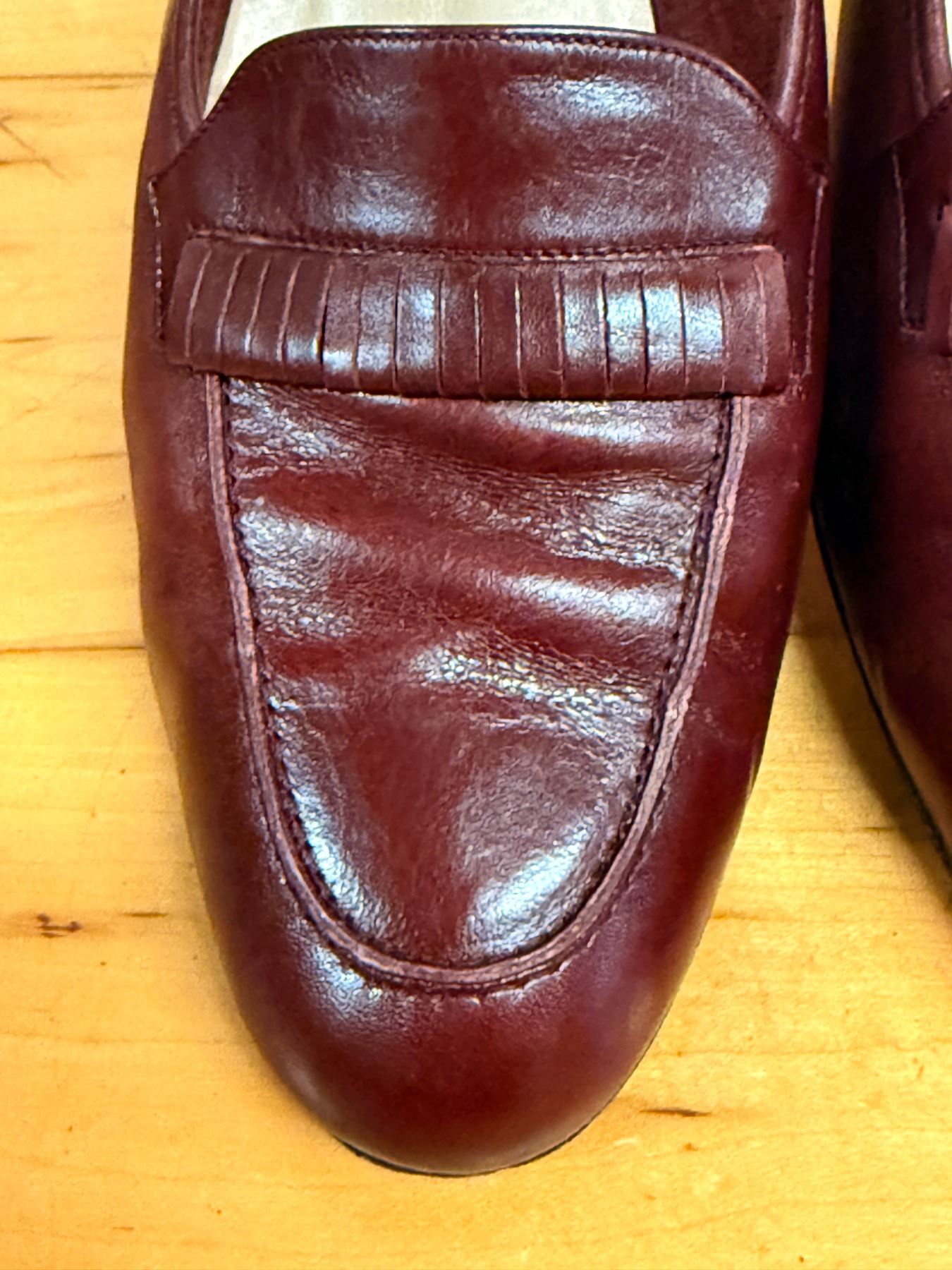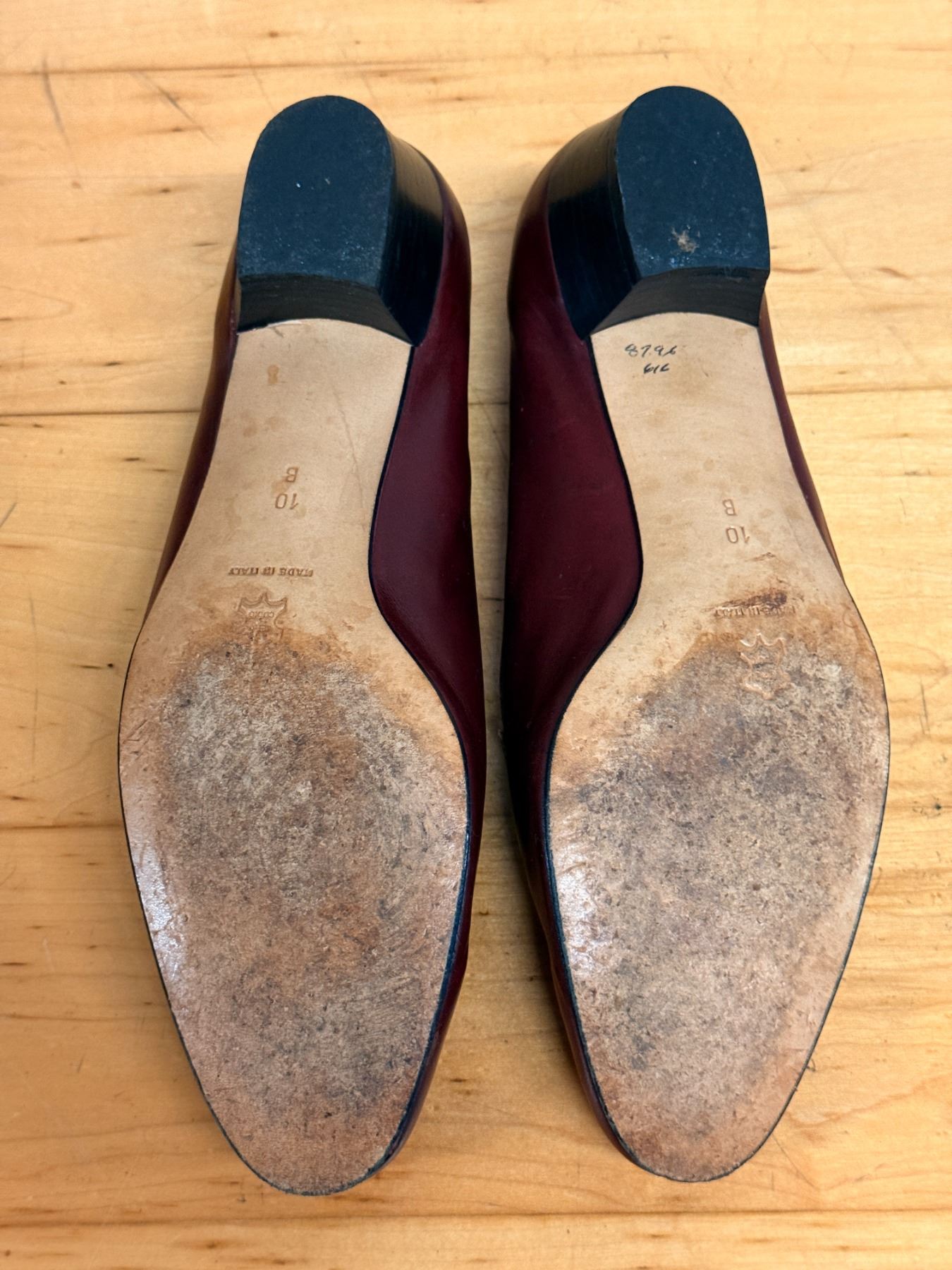 Rich burgundy leather loafers with a sleek, polished finish. A classic Ferragamo flat with elegant stitching for timeless everyday wear.