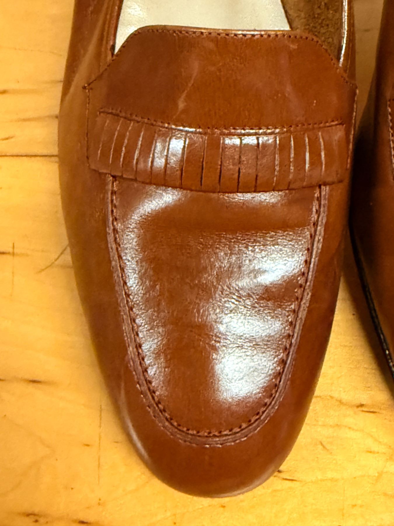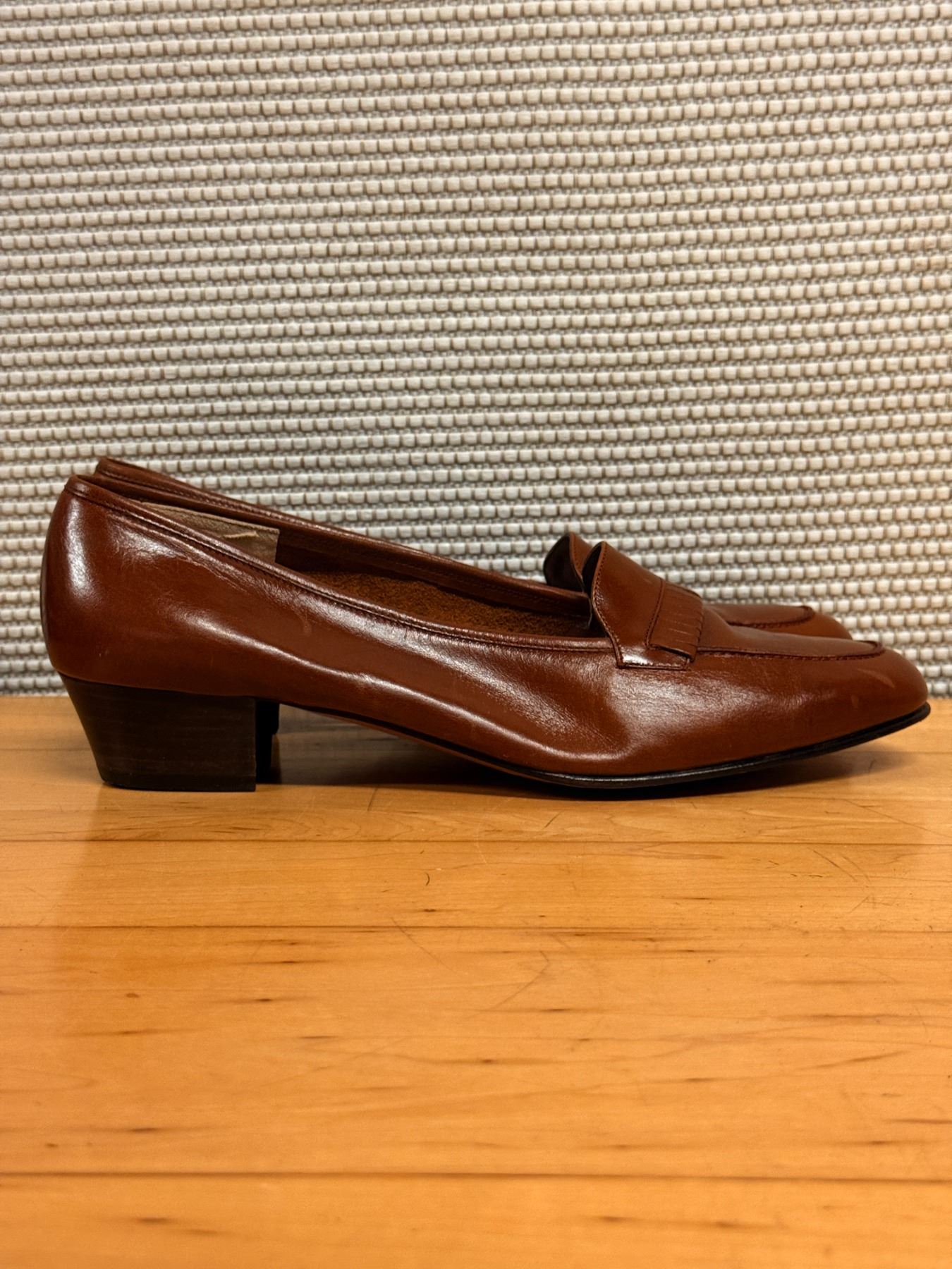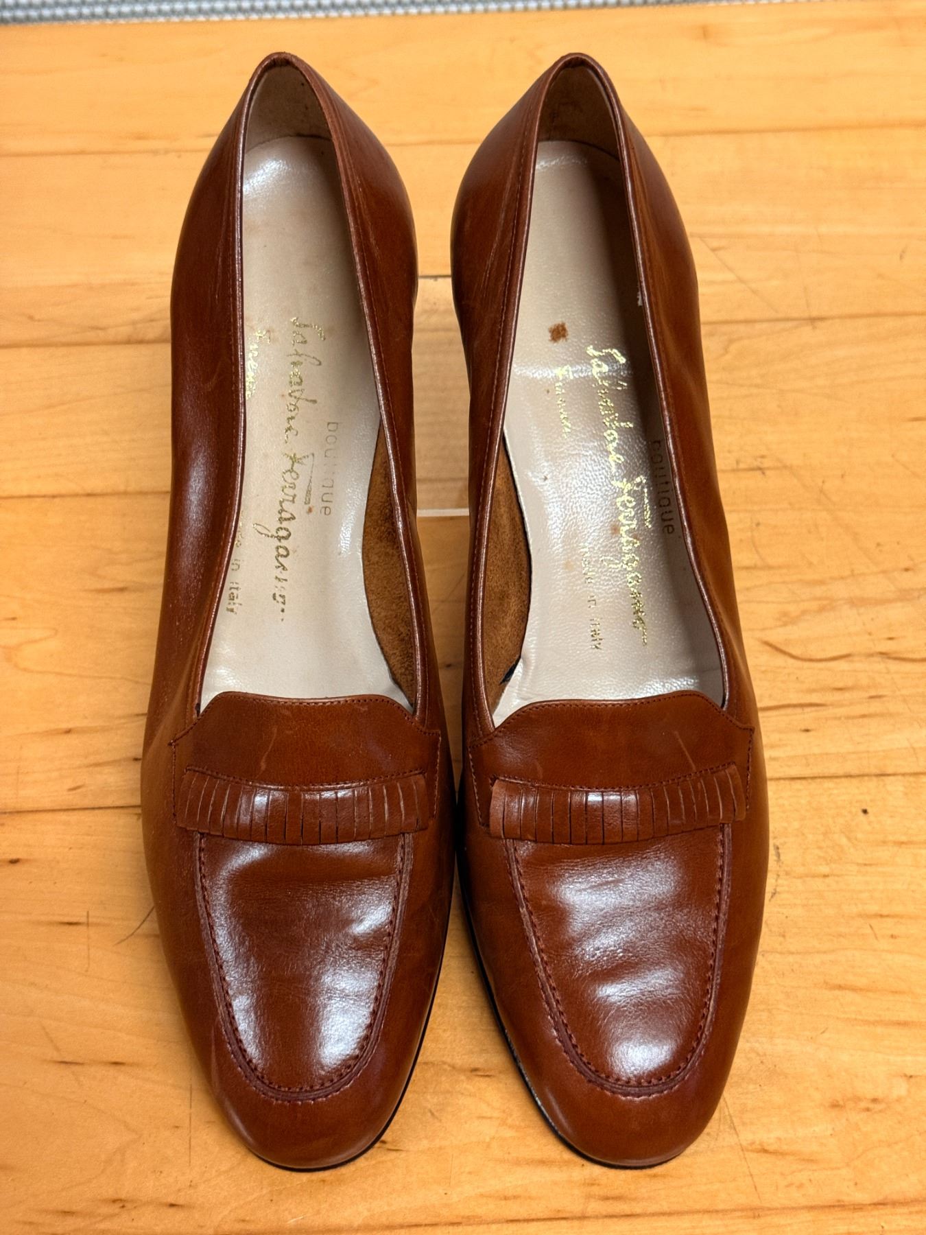 Classic Ferragamo loafers in smooth caramel leather with a refined penny-style vamp. Clean, structured shape with Italian craftsmanship. Light wear from storage; beautiful overall condition.