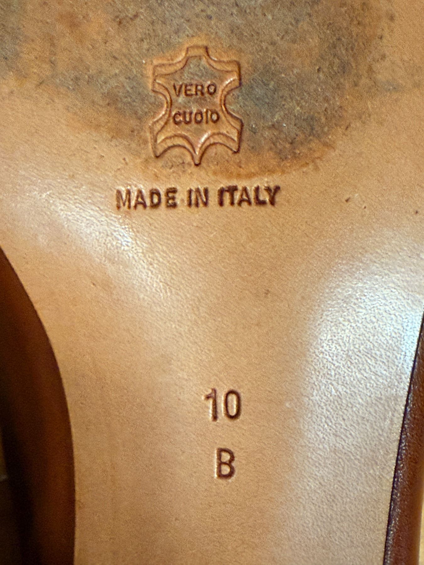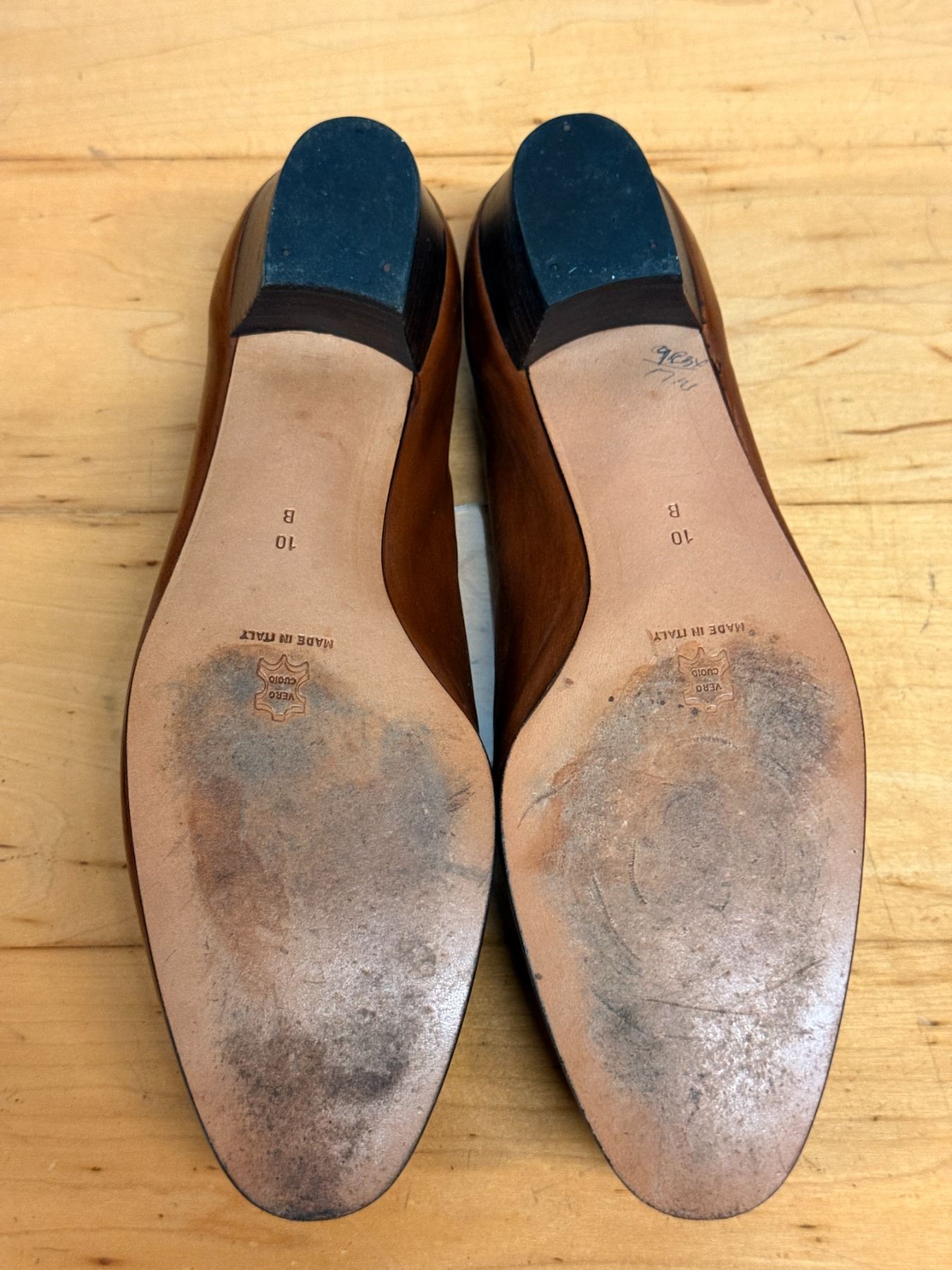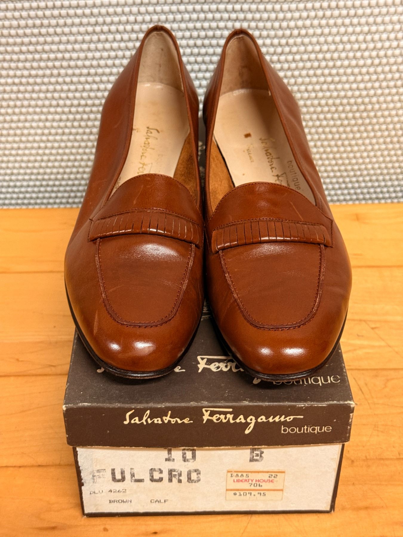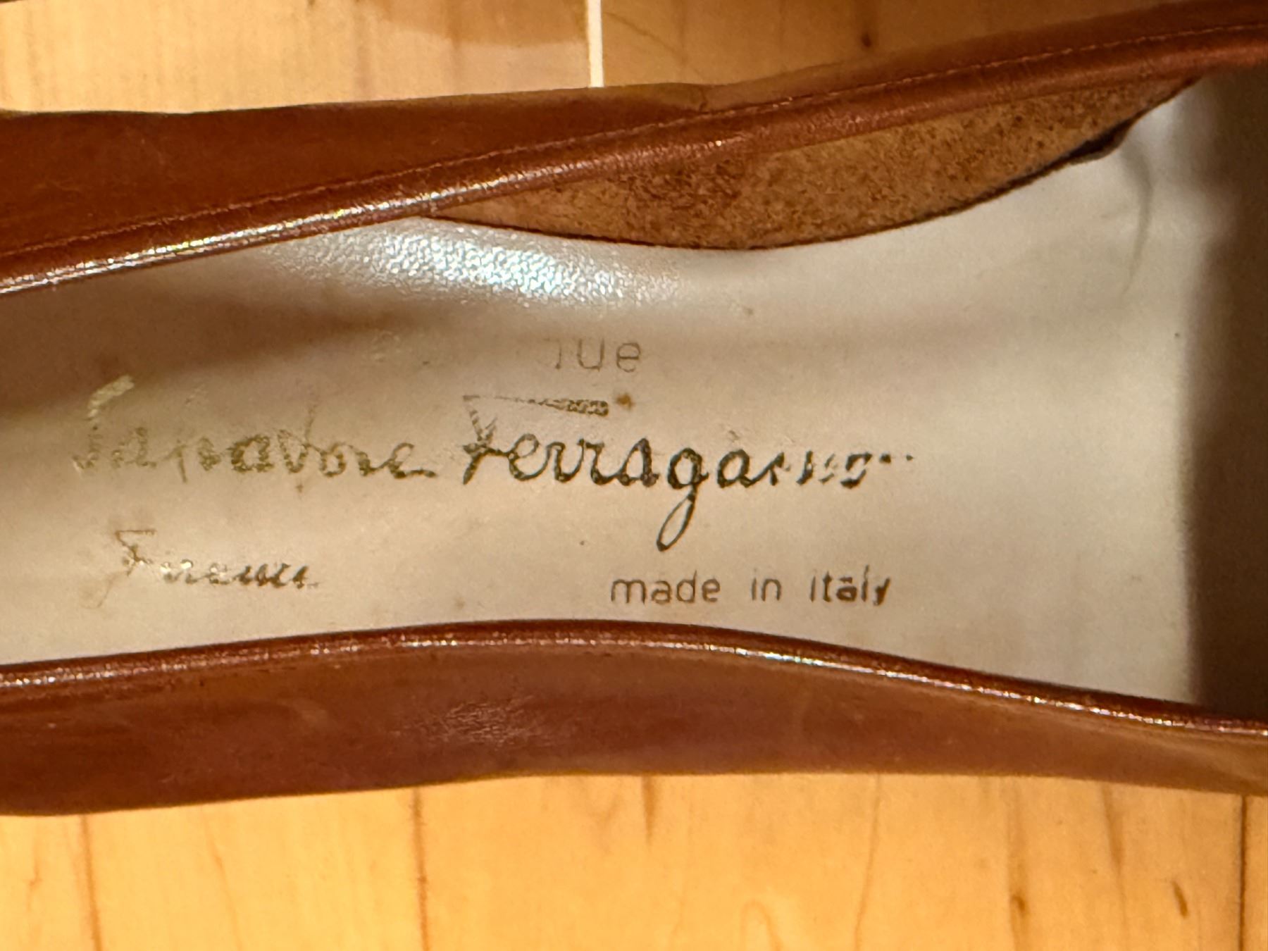 Classic Ferragamo loafers in smooth caramel leather with a refined penny-style vamp. Clean, structured shape with Italian craftsmanship. Light wear from storage; beautiful overall condition.
