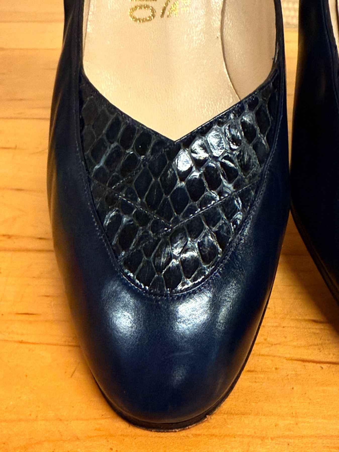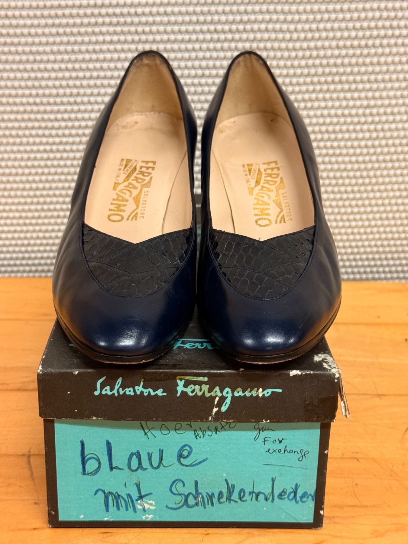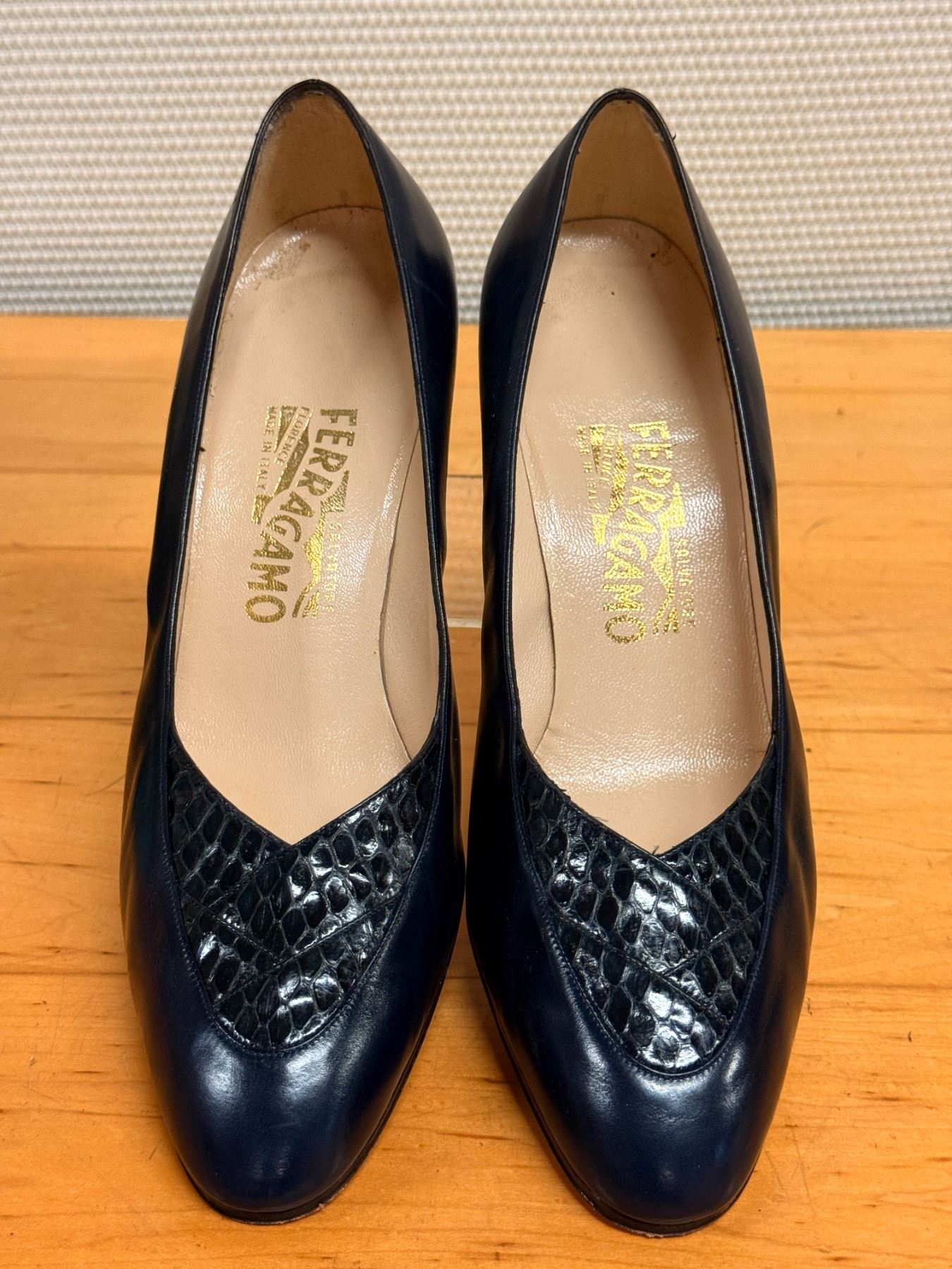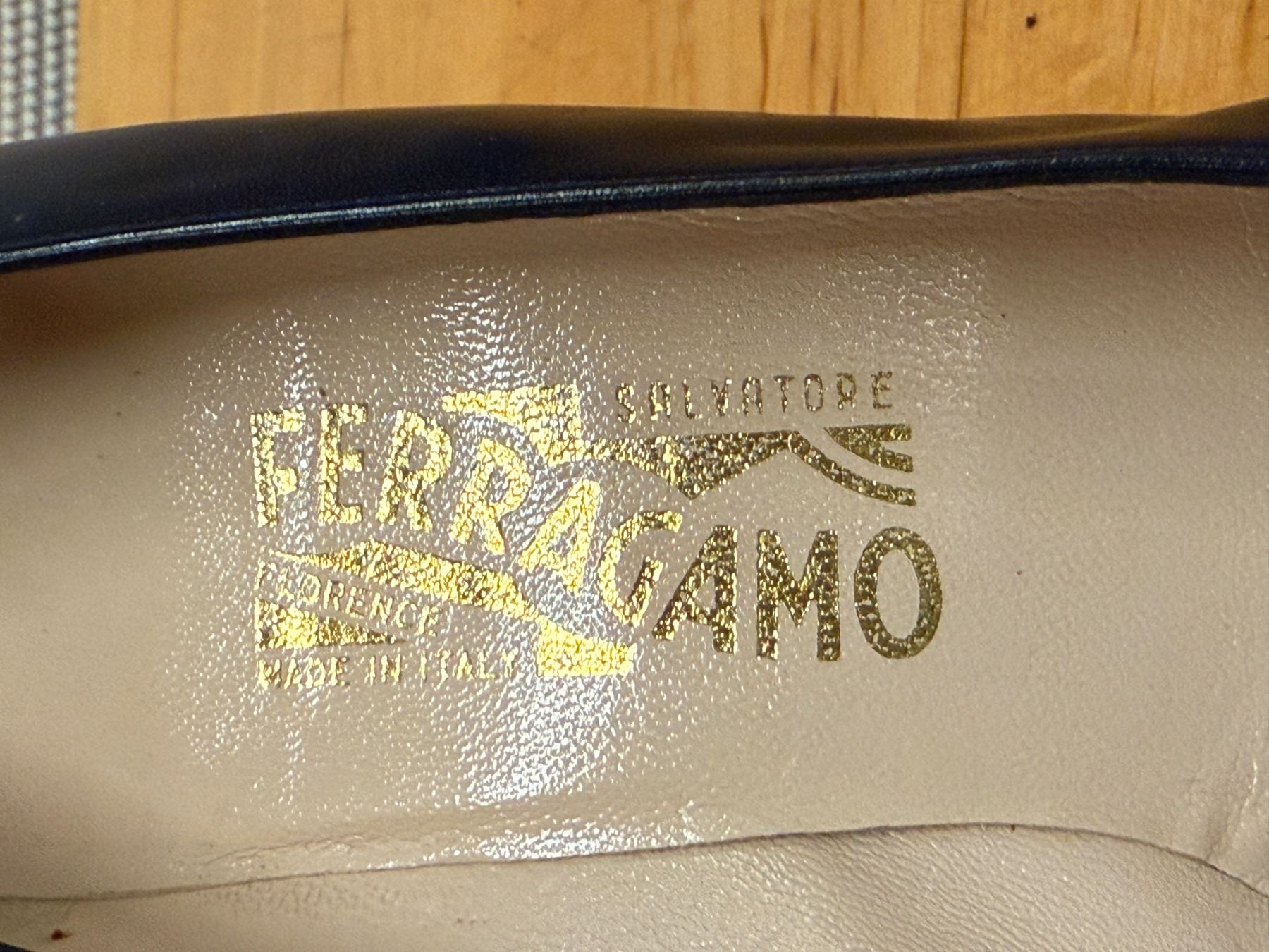 Classic Ferragamo pumps in rich navy calf leather featuring a subtle black embossed accent across the vamp. Rounded toe, smooth leather finish, and signature Italian craftsmanship. Light interior wear but overall well-kept. Elegant, understated, and perfect for both work and polished everyday outfits.