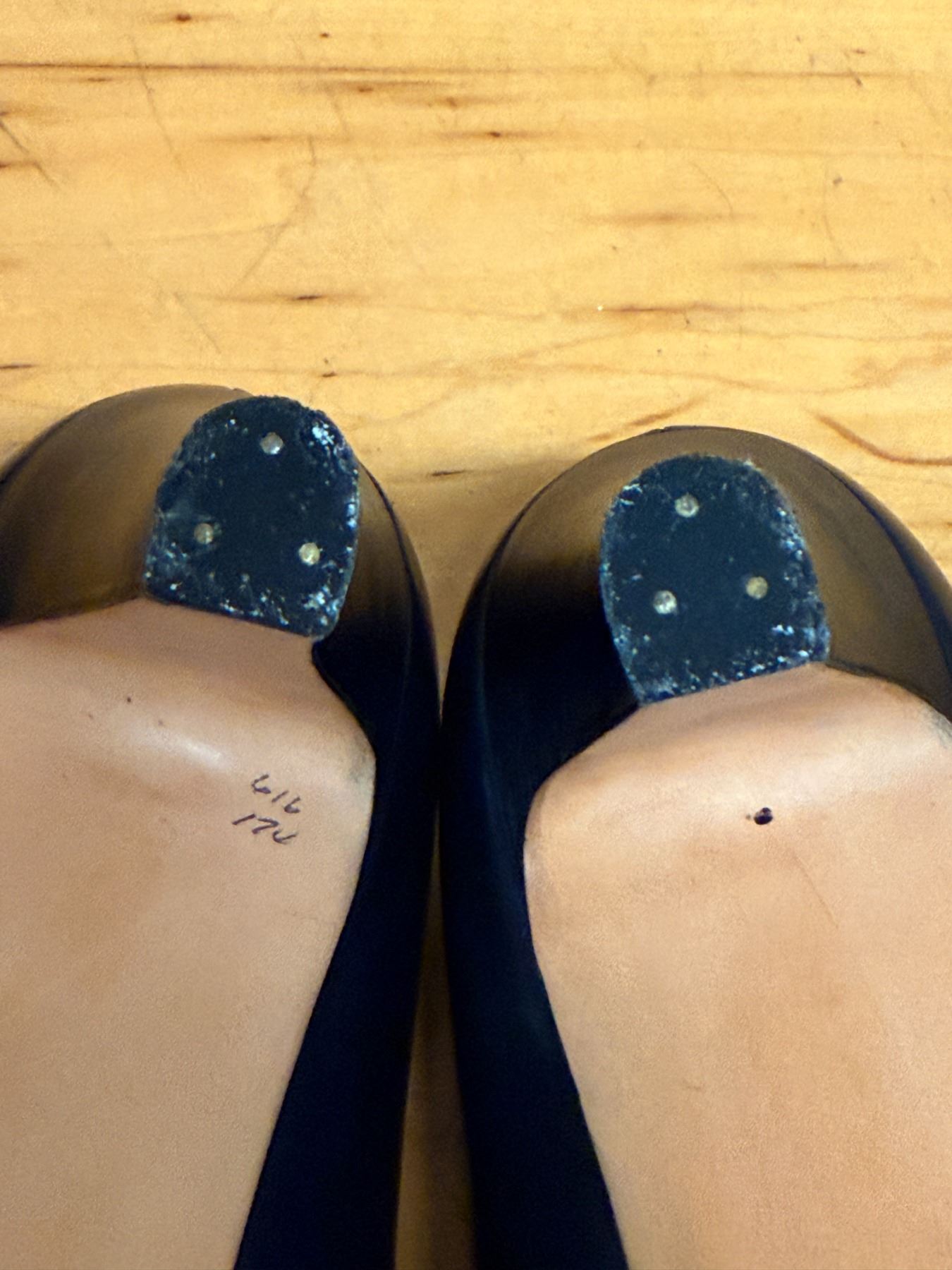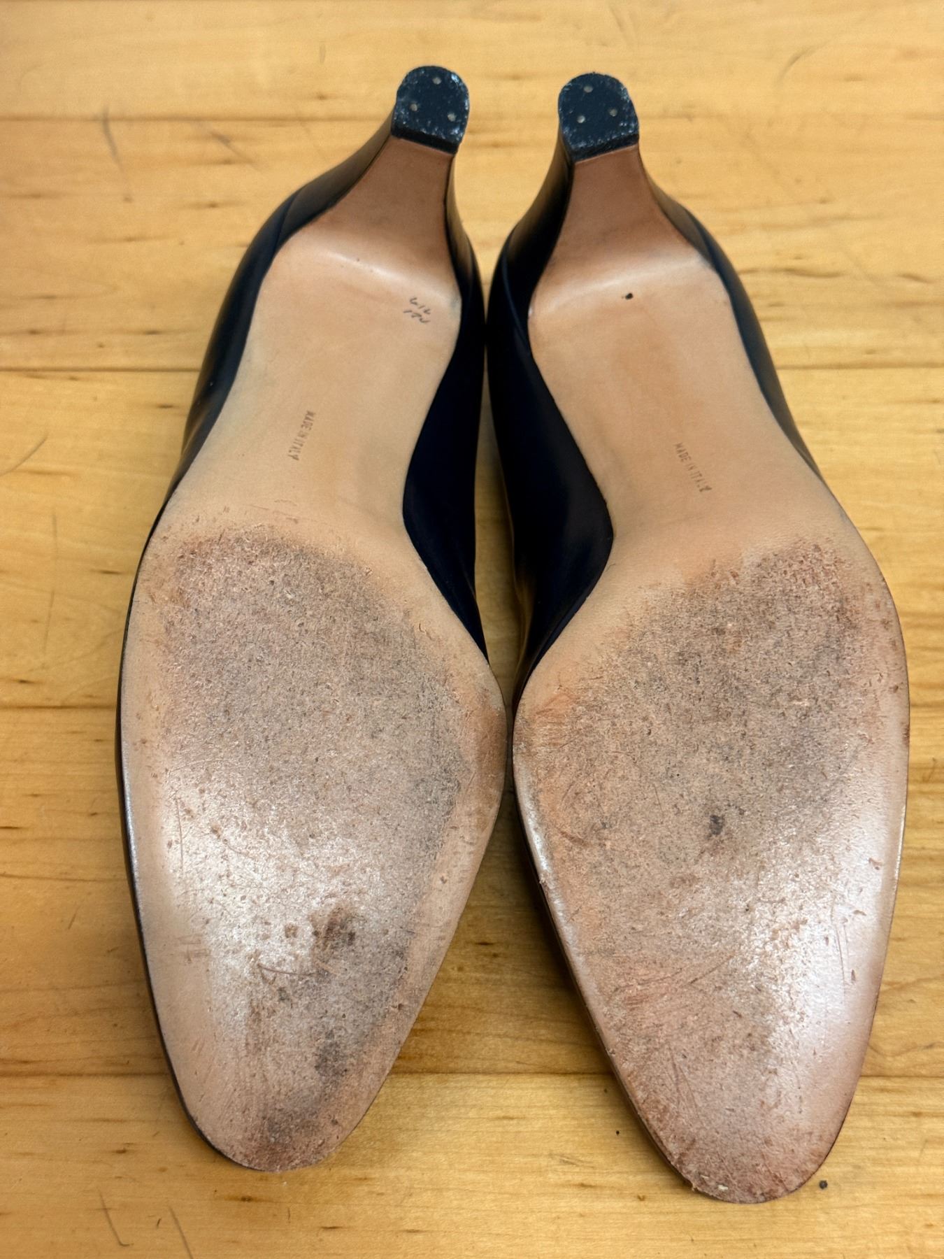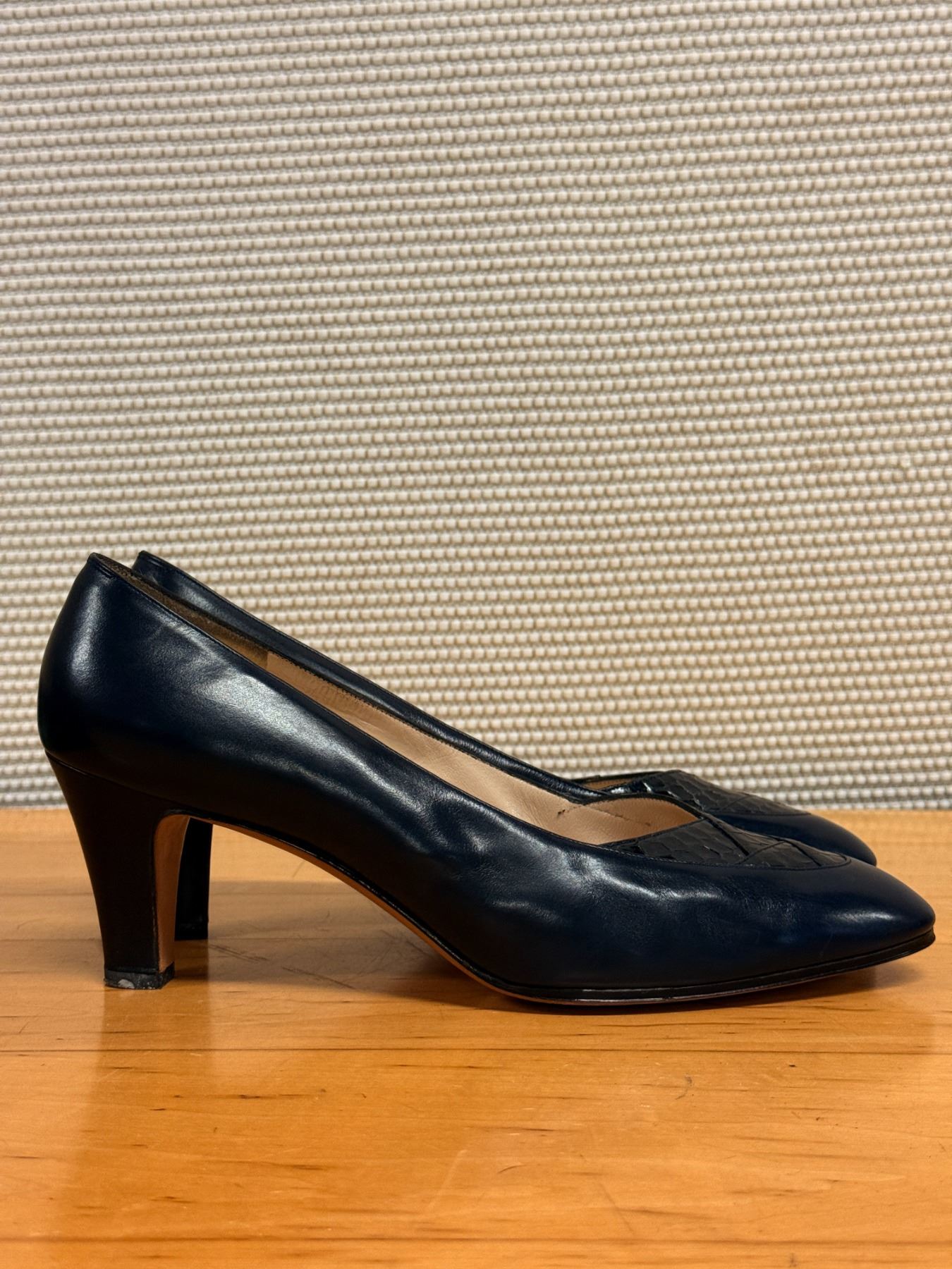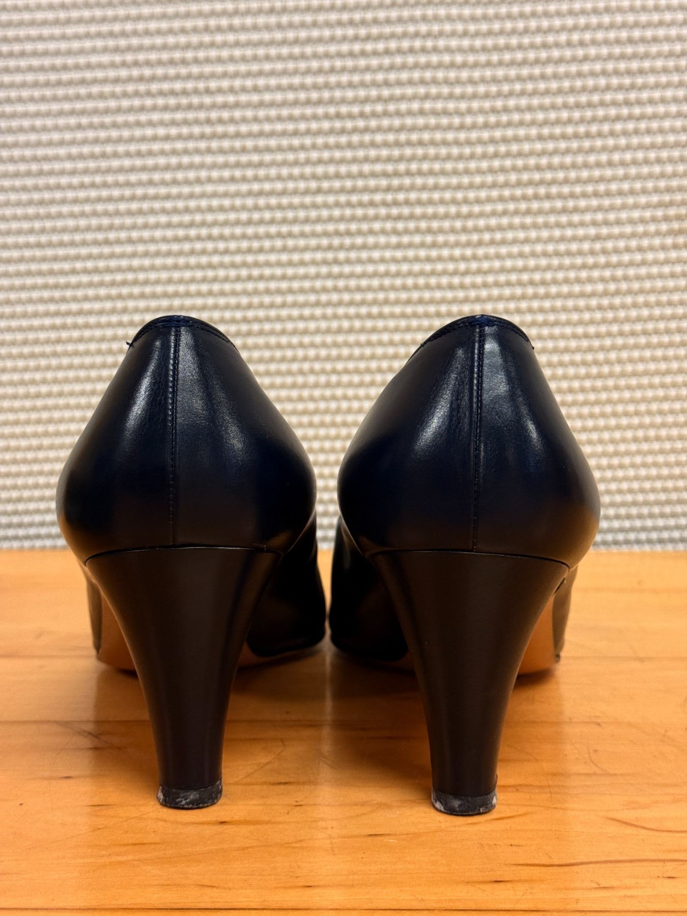 Classic Ferragamo pumps in rich navy calf leather featuring a subtle black embossed accent across the vamp. Rounded toe, smooth leather finish, and signature Italian craftsmanship. Light interior wear but overall well-kept. Elegant, understated, and perfect for both work and polished everyday outfits.