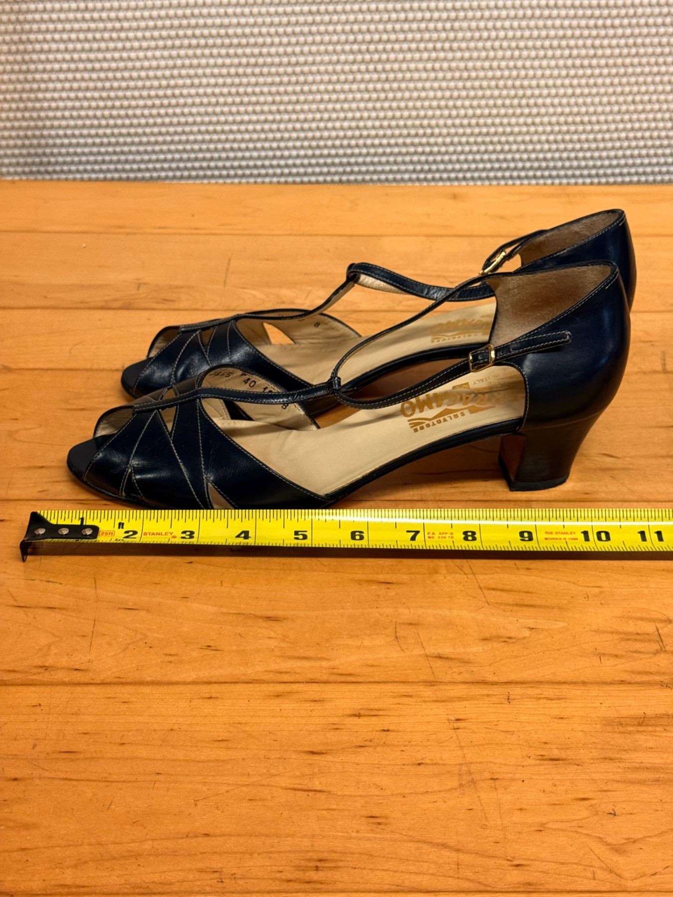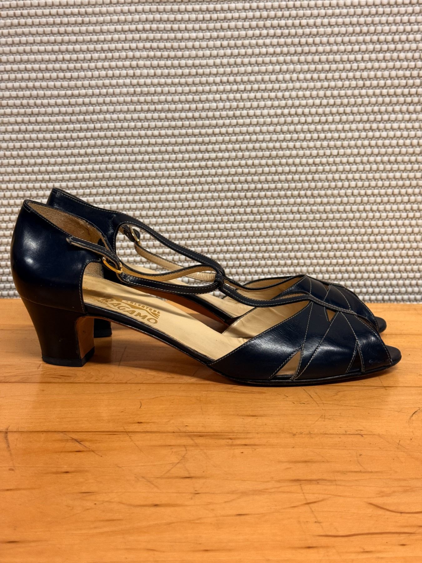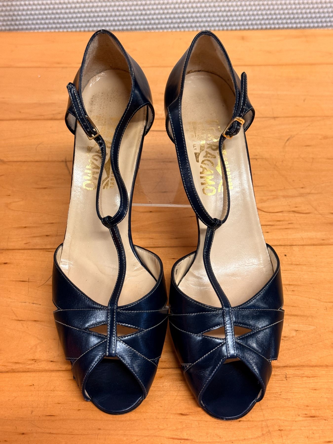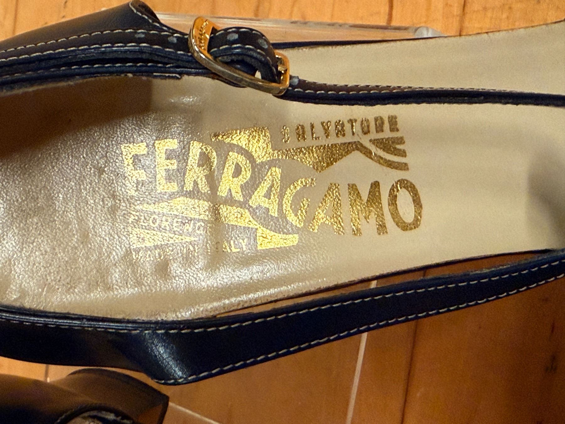 Classic Ferragamo slingbacks in deep navy leather with elegant cutout detailing and a slim gold buckle. Open-toe design adds a polished, feminine touch. Ideal for dressy or workwear looks.