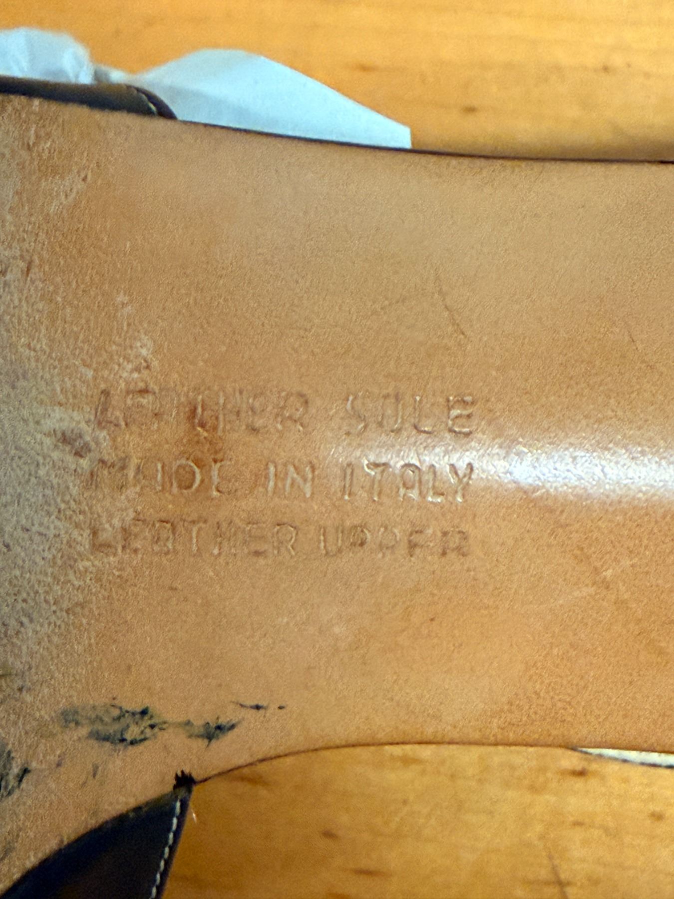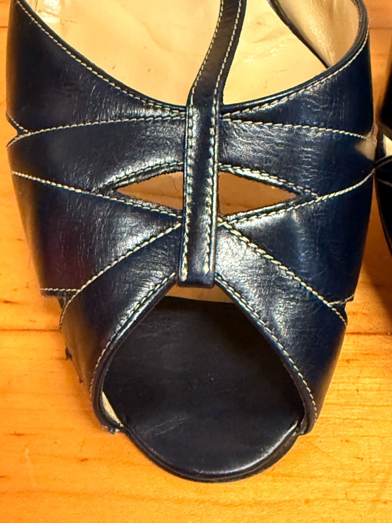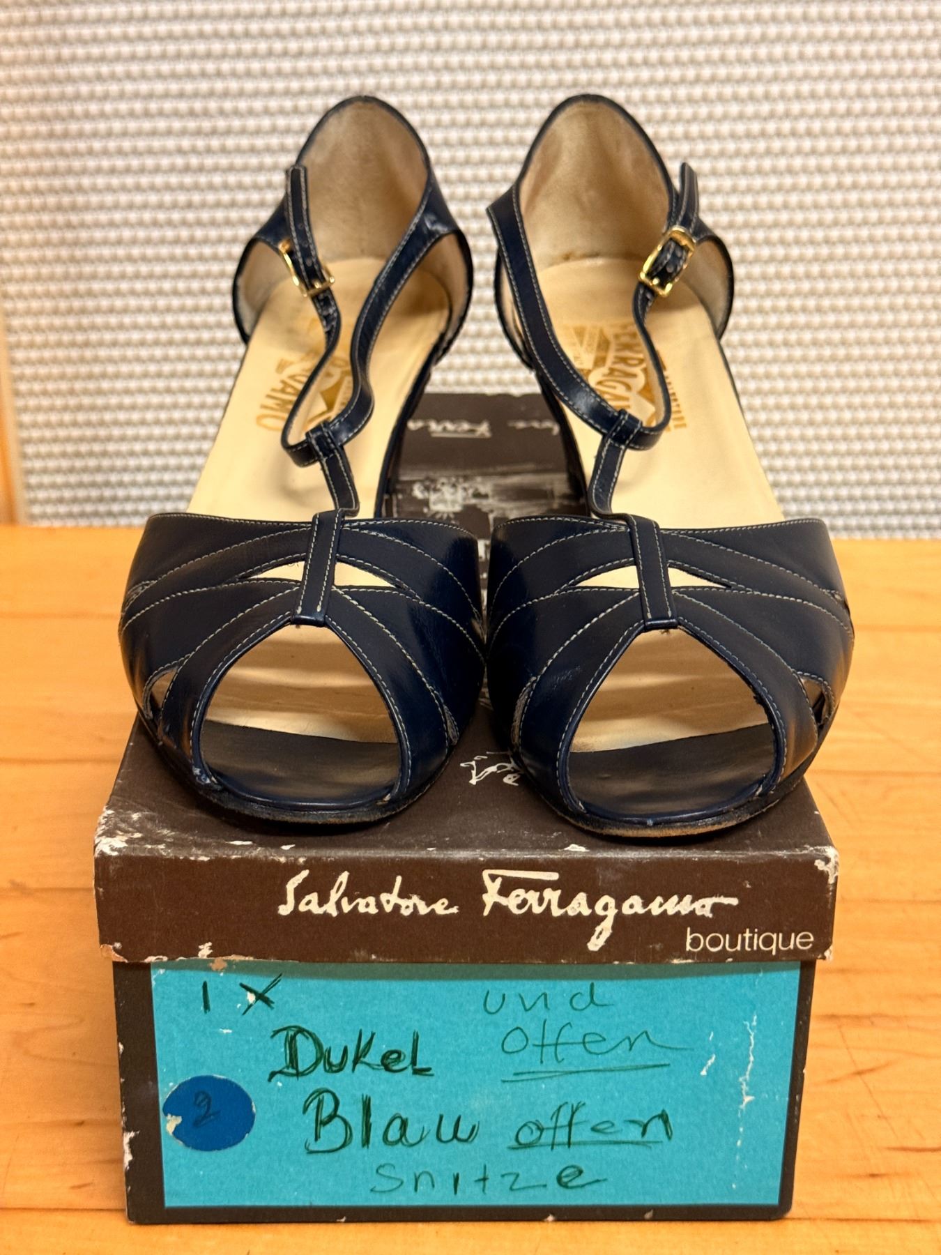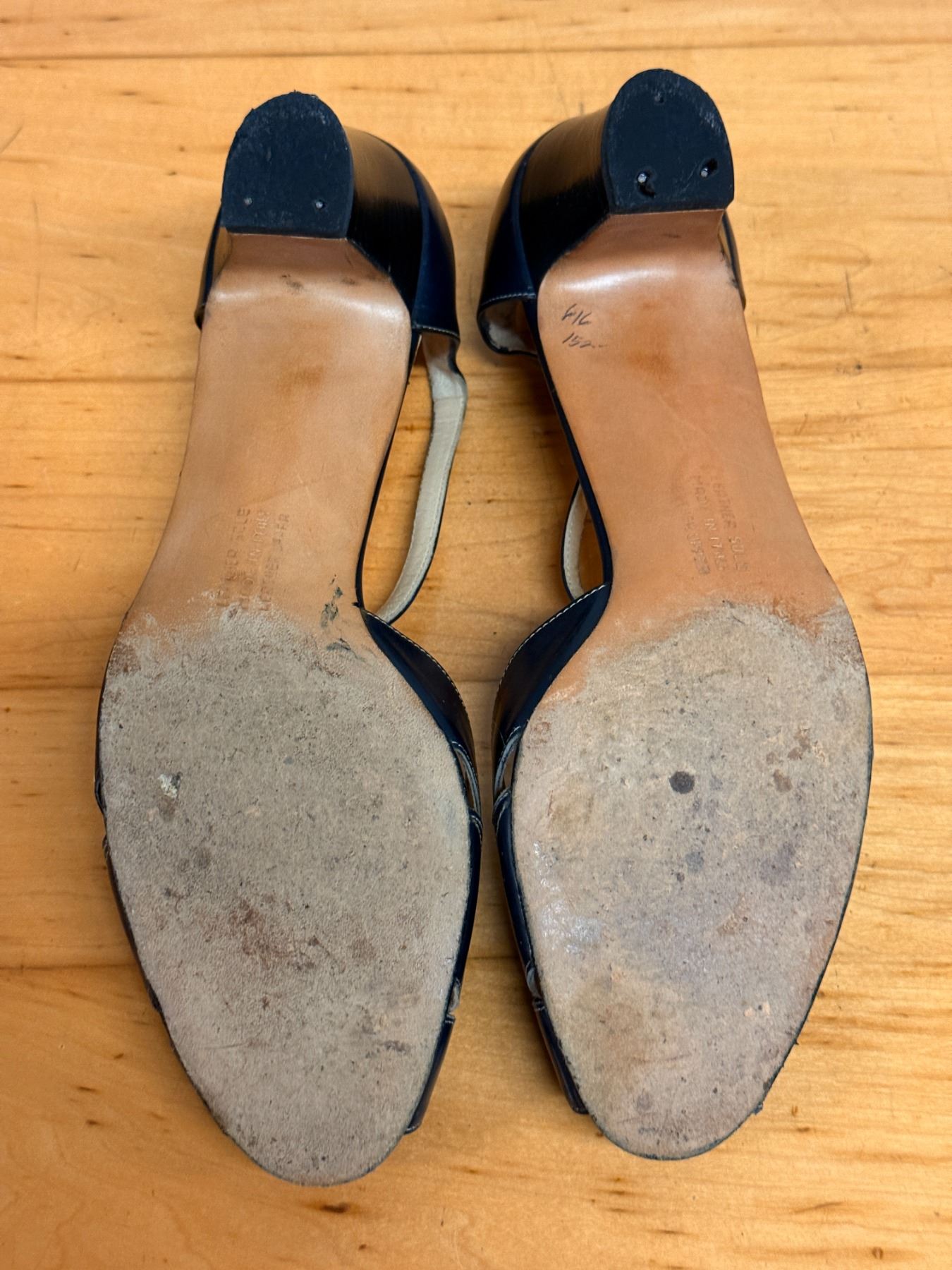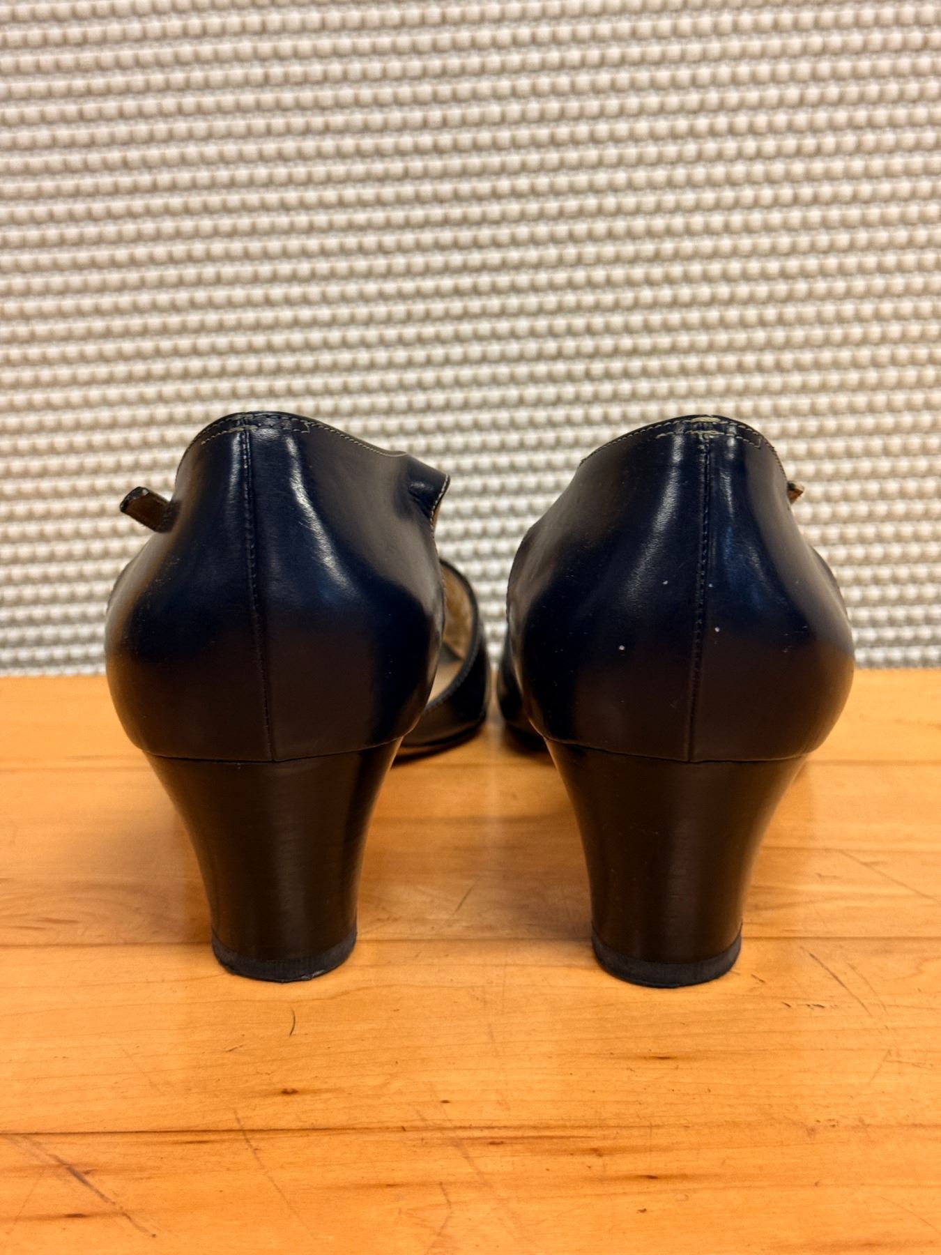 Classic Ferragamo slingbacks in deep navy leather with elegant cutout detailing and a slim gold buckle. Open-toe design adds a polished, feminine touch. Ideal for dressy or workwear looks.