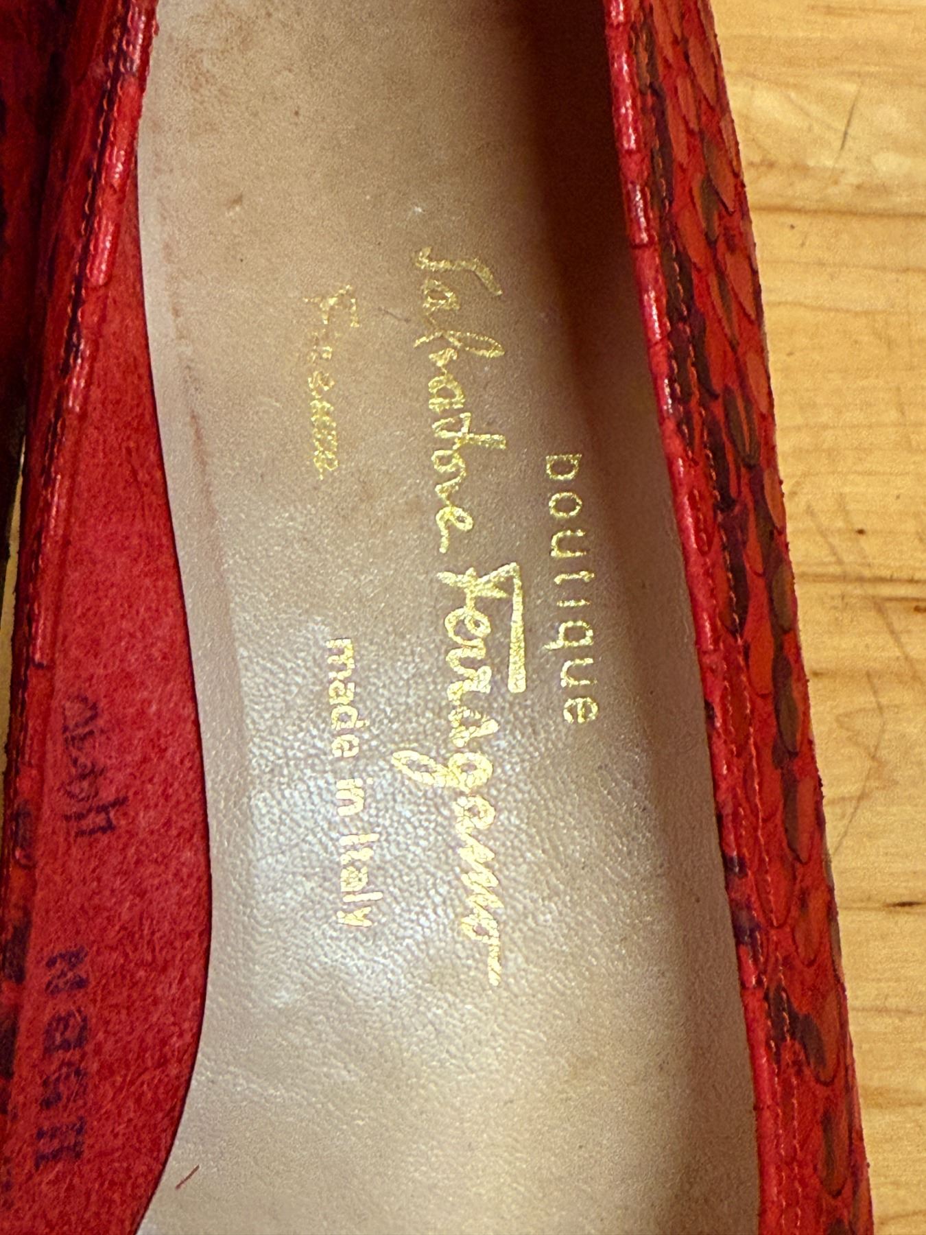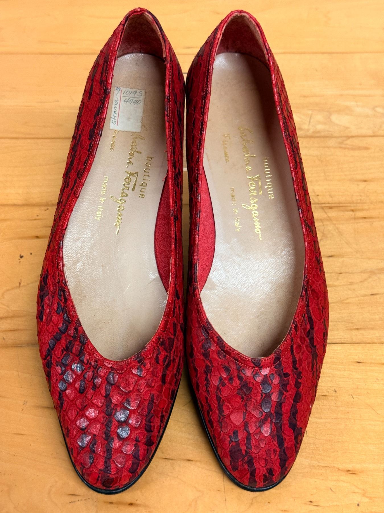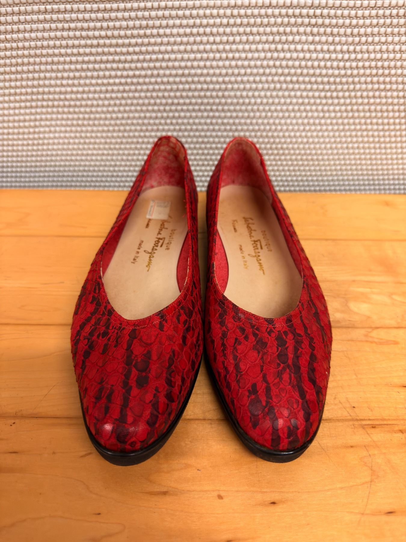 Striking Ferragamo flats in bold red snake-embossed leather. Features a classic rounded toe, smooth leather lining, and signature Italian craftsmanship. Chic, lightweight, and perfect for adding a pop of color to any outfit. Light wear from age but beautifully preserved.