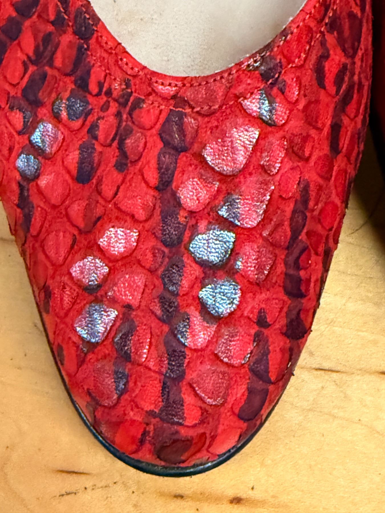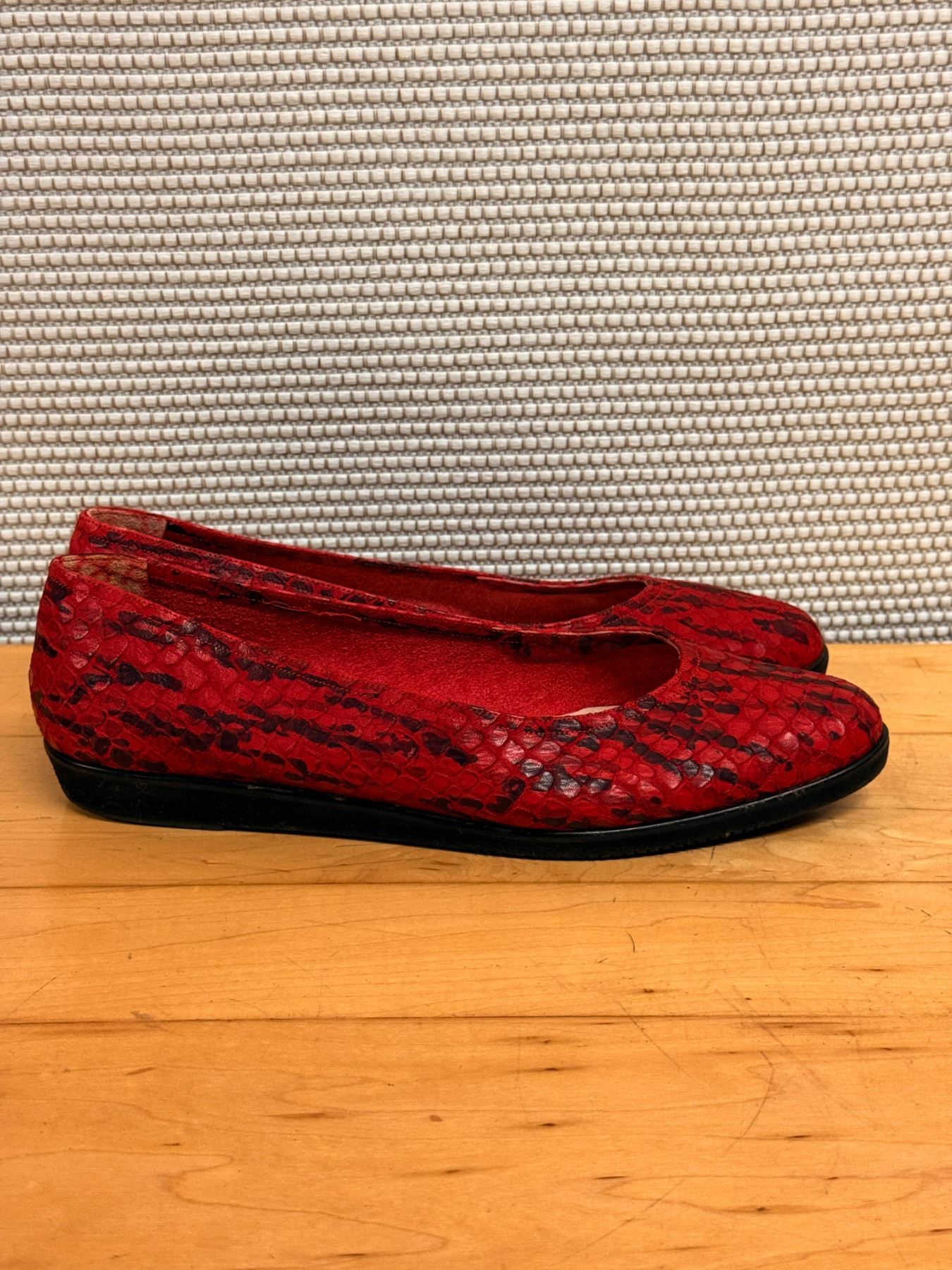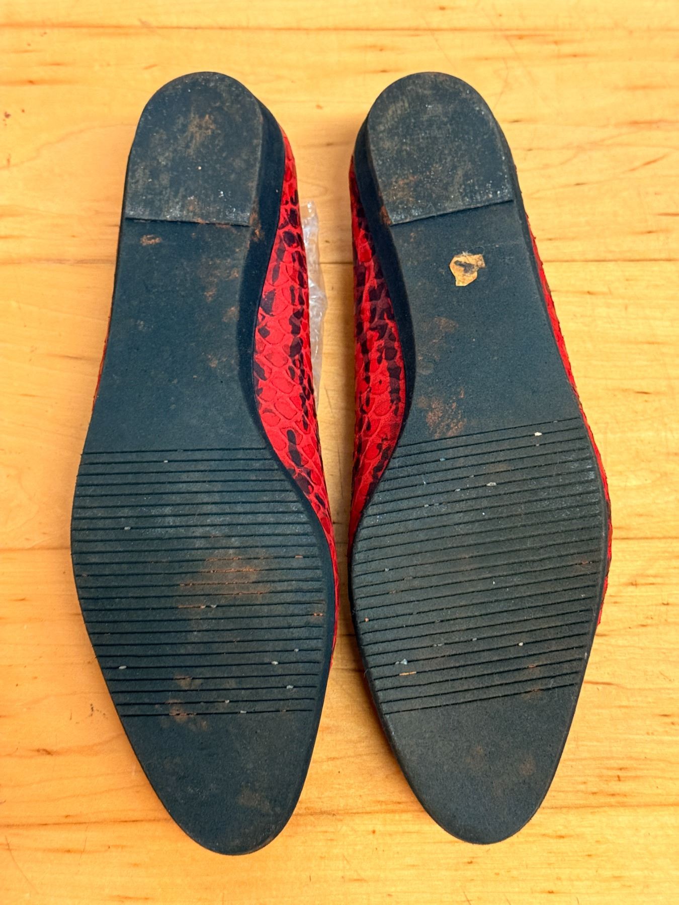 Striking Ferragamo flats in bold red snake-embossed leather. Features a classic rounded toe, smooth leather lining, and signature Italian craftsmanship. Chic, lightweight, and perfect for adding a pop of color to any outfit. Light wear from age but beautifully preserved.