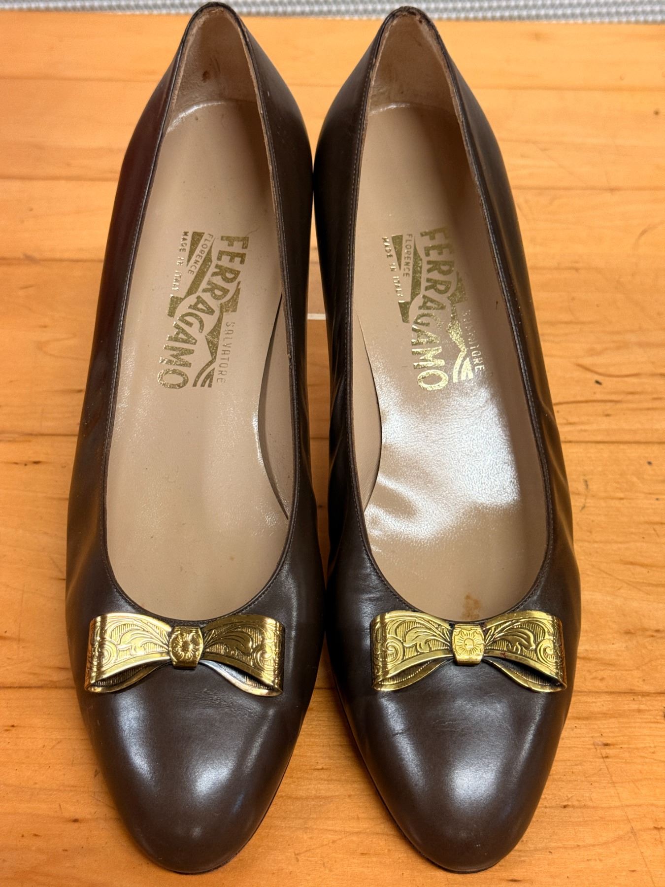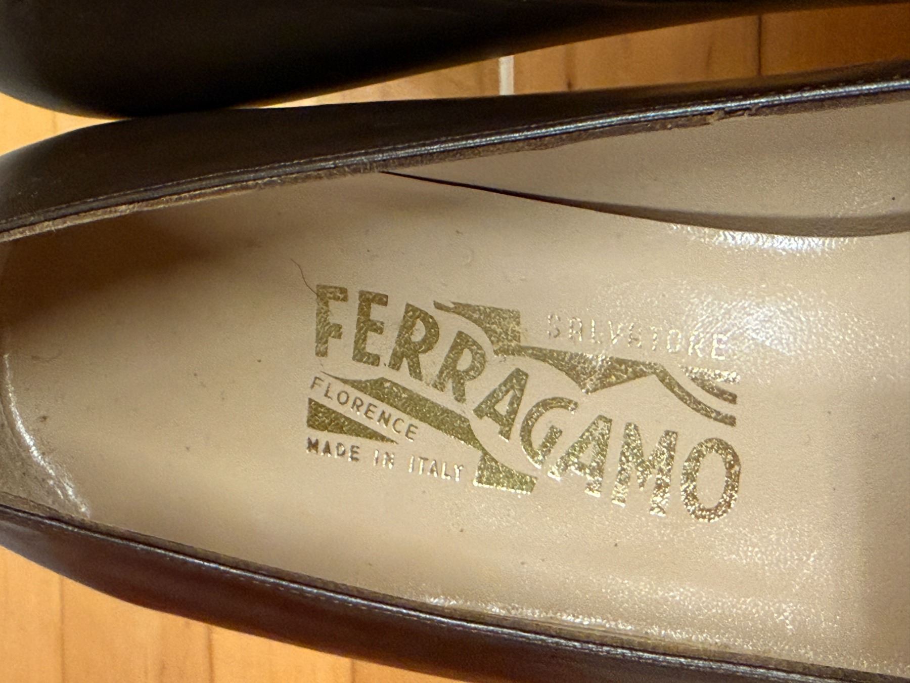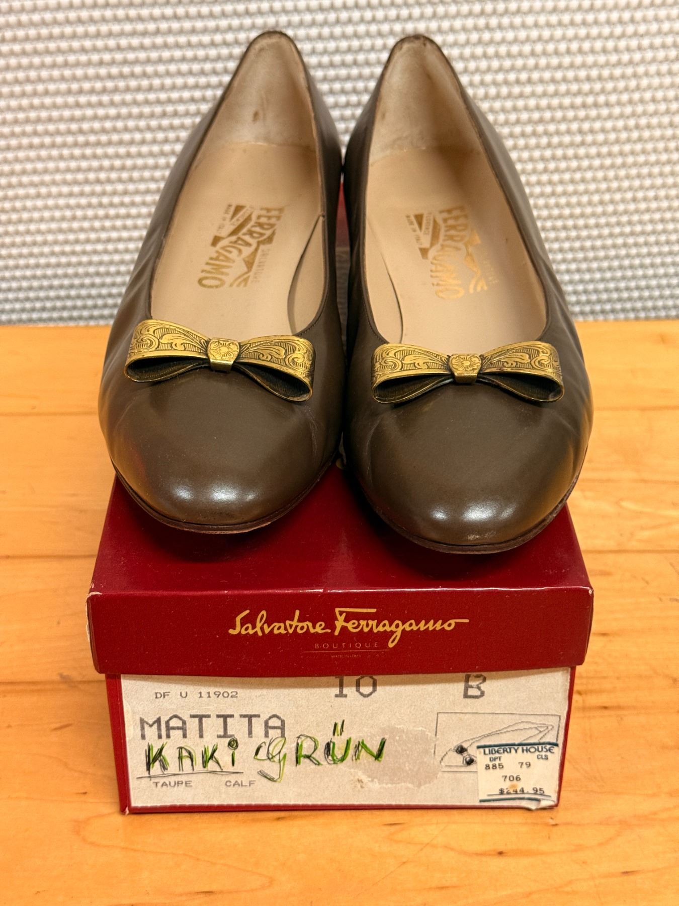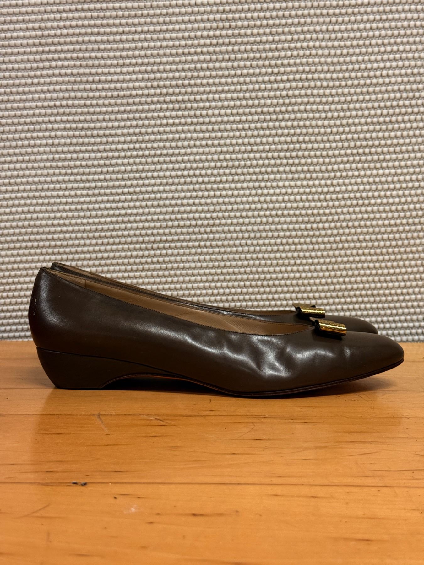 Classic Ferragamo flats in smooth taupe calfskin with signature gold engraved bow hardware. Features a rounded toe, leather lining, and timeless Italian craftsmanship. Elegant, understated, and perfect for everyday or office wear. Vintage with light wear.