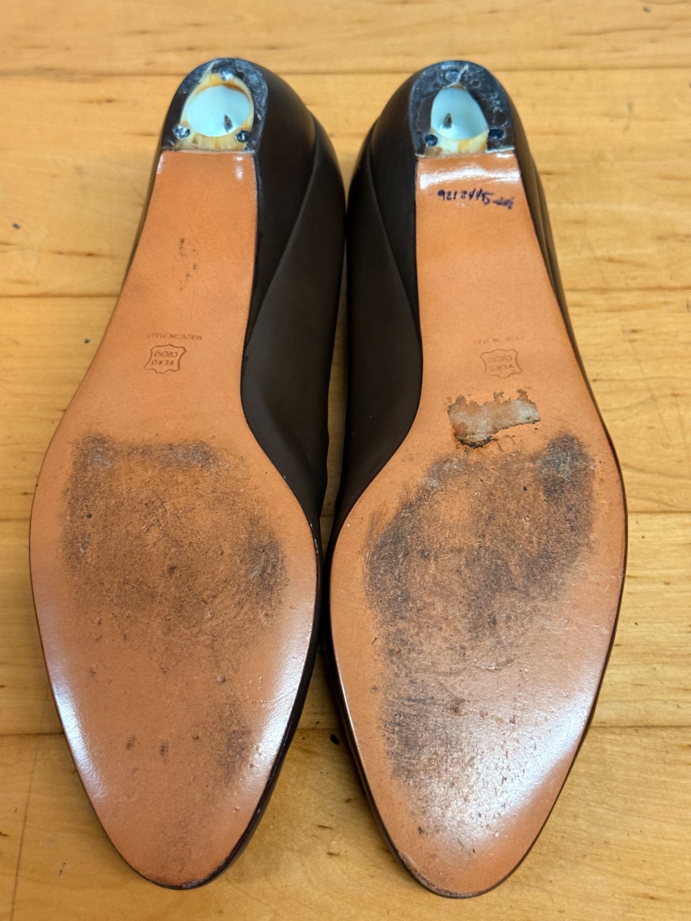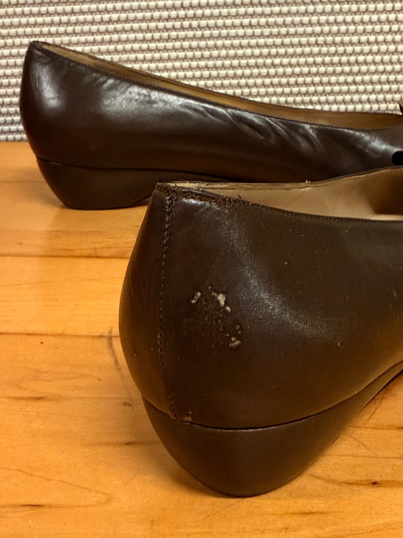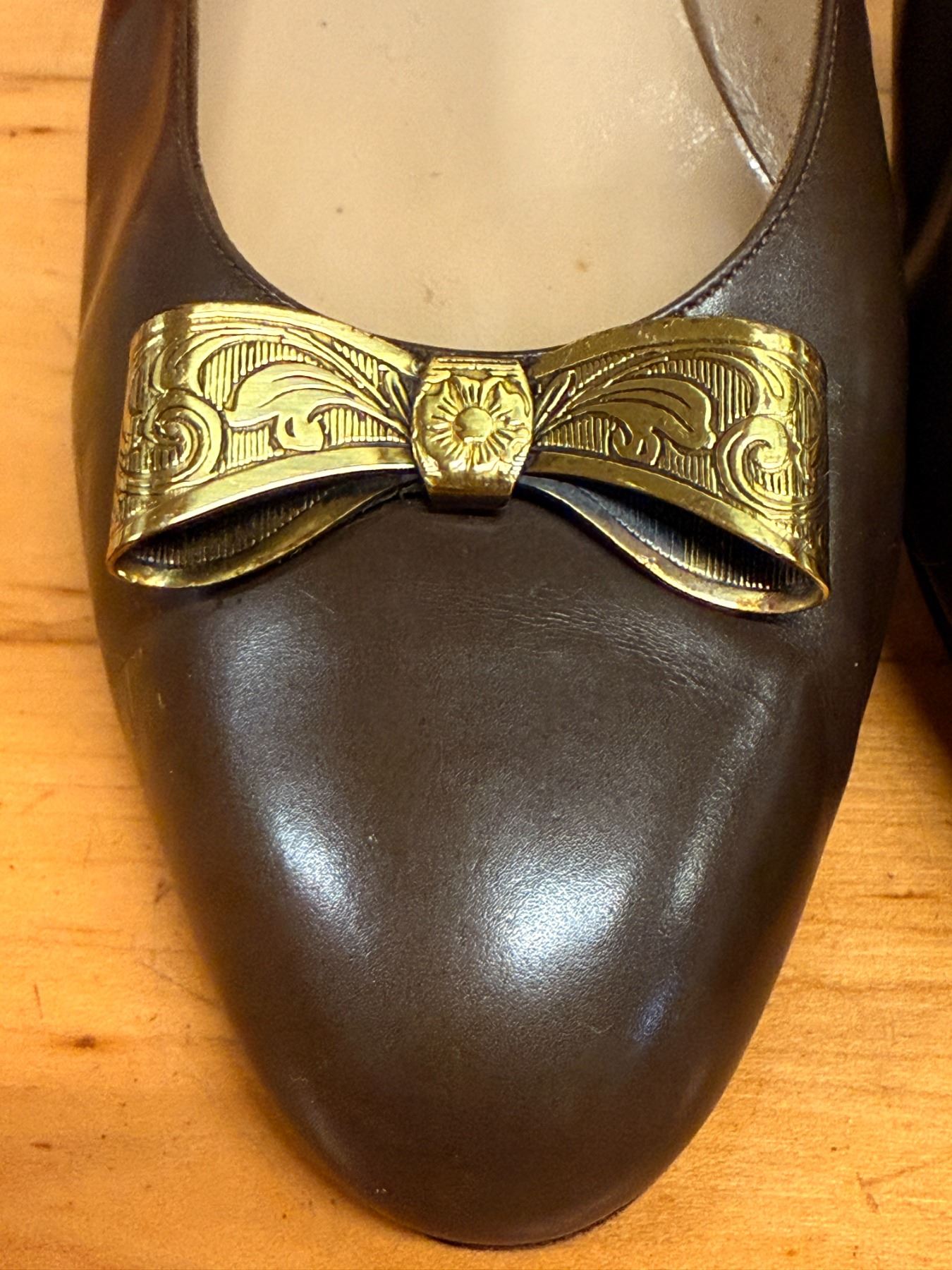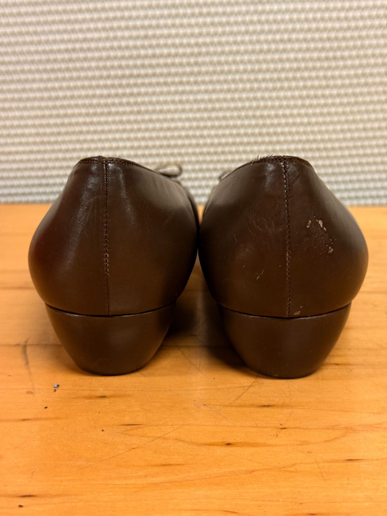 Classic Ferragamo flats in smooth taupe calfskin with signature gold engraved bow hardware. Features a rounded toe, leather lining, and timeless Italian craftsmanship. Elegant, understated, and perfect for everyday or office wear. Vintage with light wear.