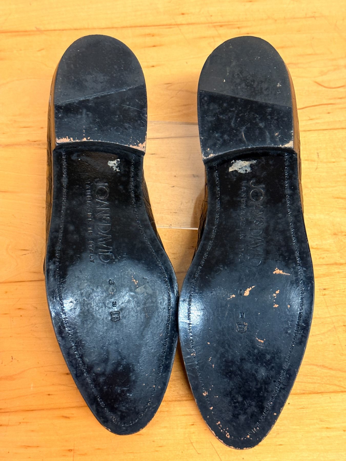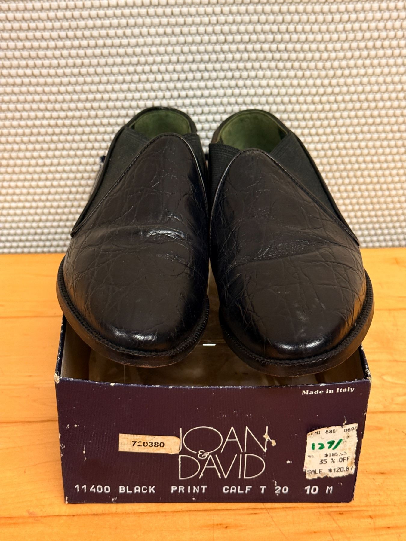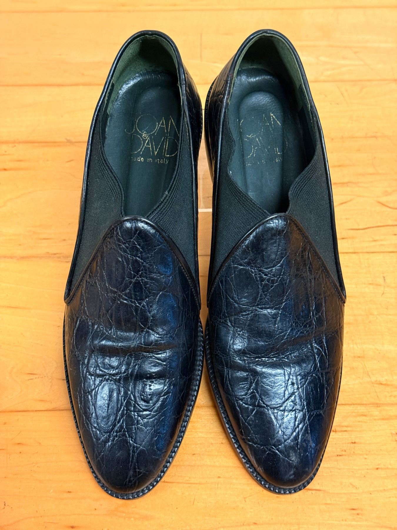 Classic Joan & David loafers crafted in black print-calf leather with a soft, textured finish. Features an easy slip-on design with stretchy side panels, cushioned interior, and timeless Italian craftsmanship. A comfortable, versatile everyday style.