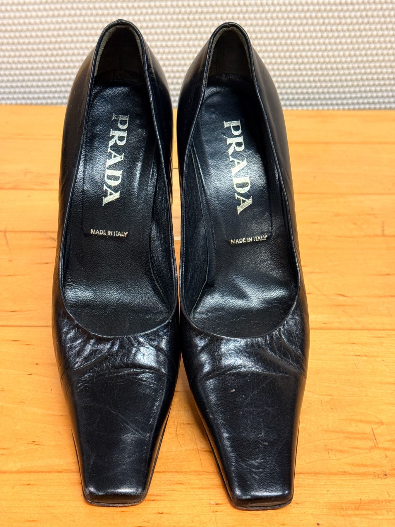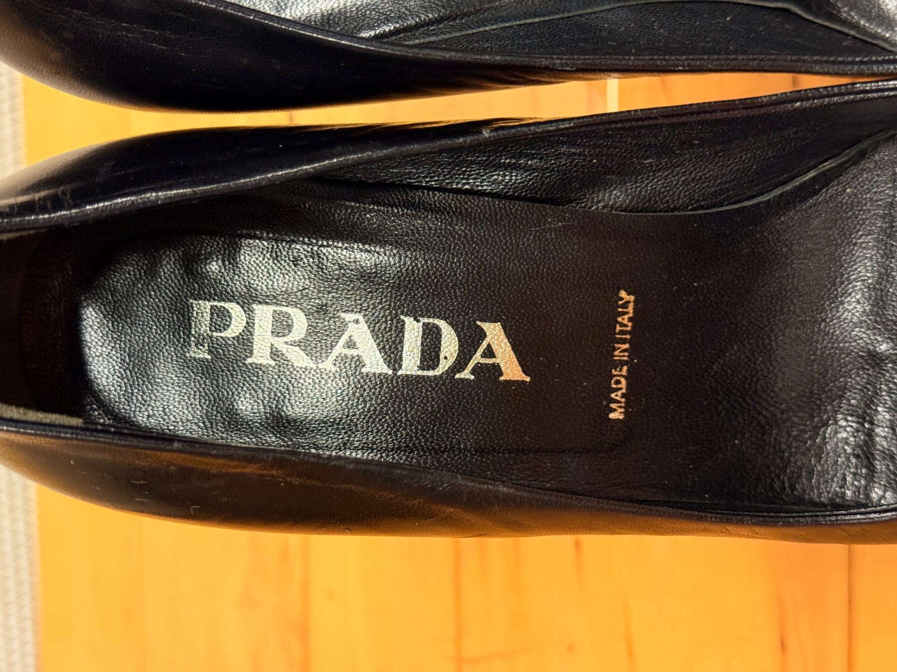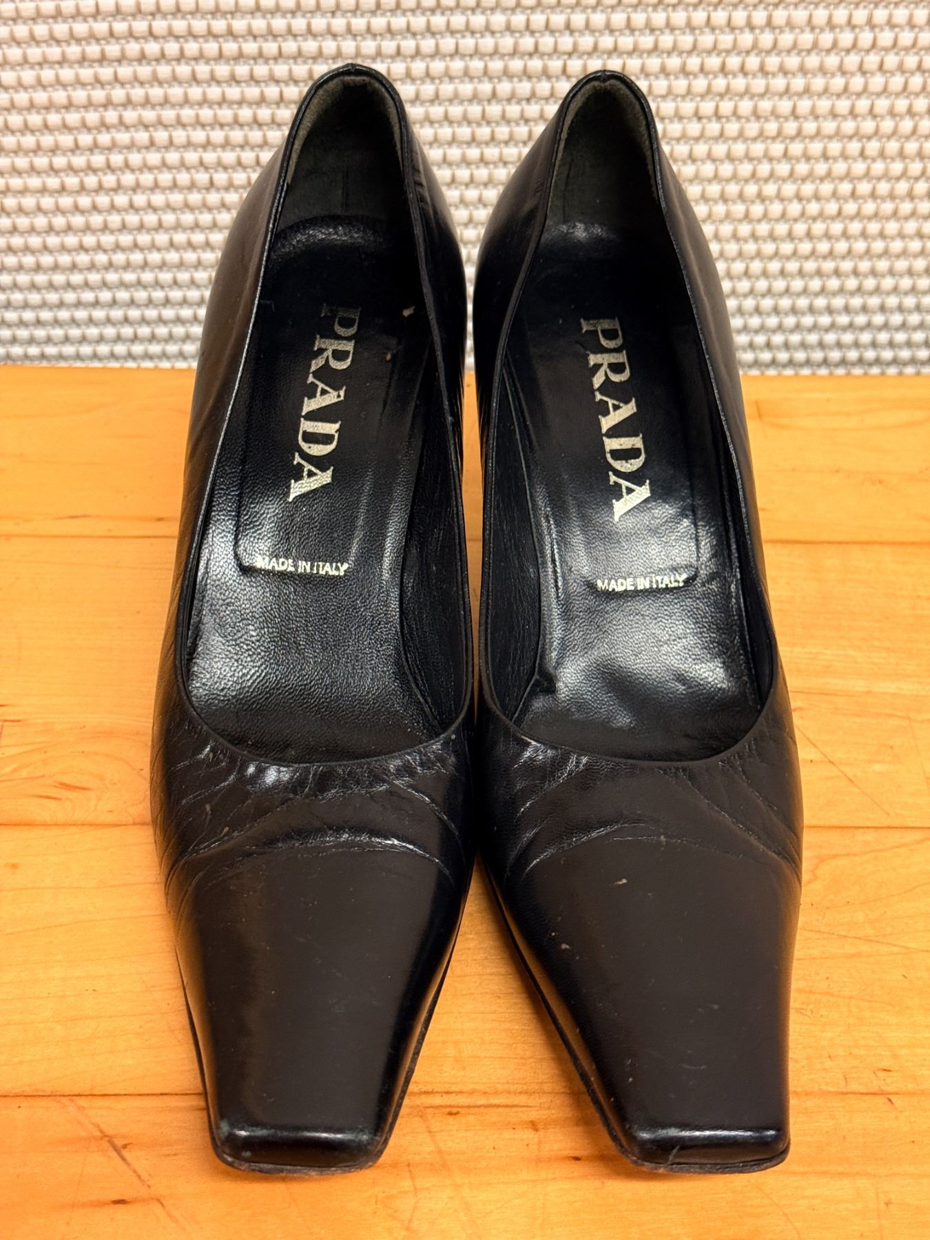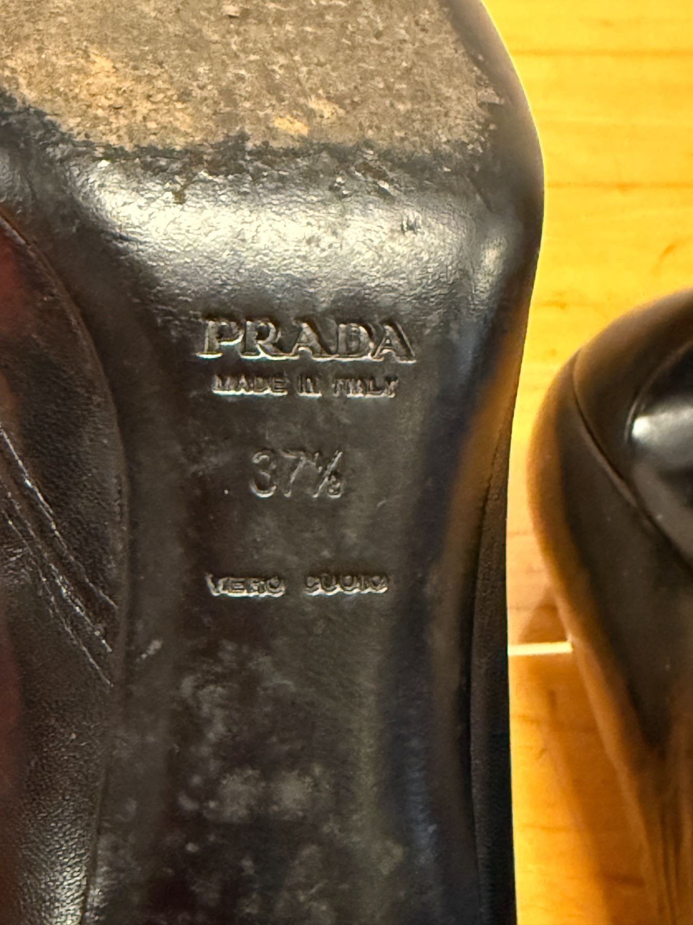 Prada black leather square-toe pumps in size 37 1/2 (equivalent to approximately US women's size 7 to 7.5) are elegant and sophisticated shoes crafted from high-quality leather, often featuring classic design elements. Signs of wear in pictures
