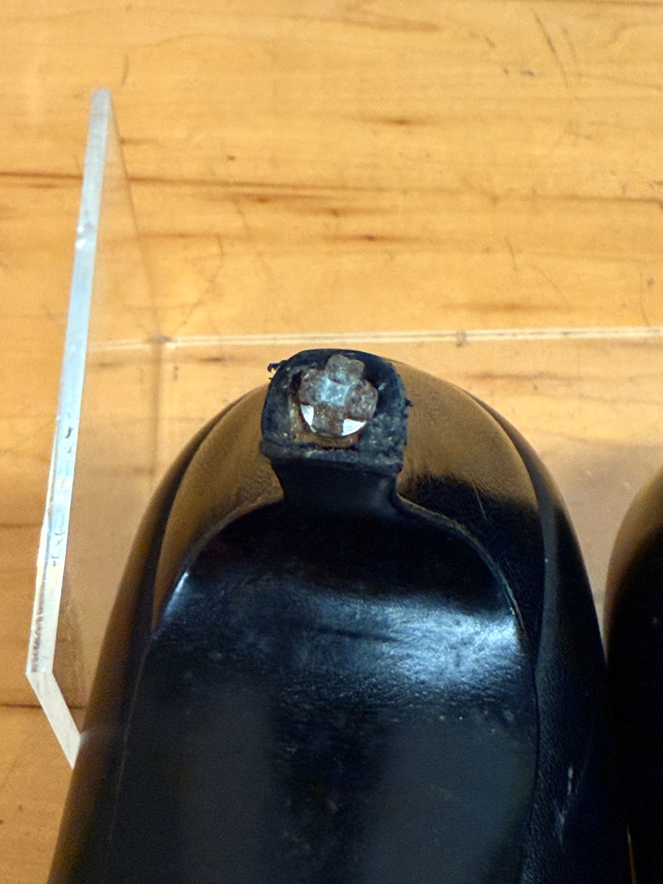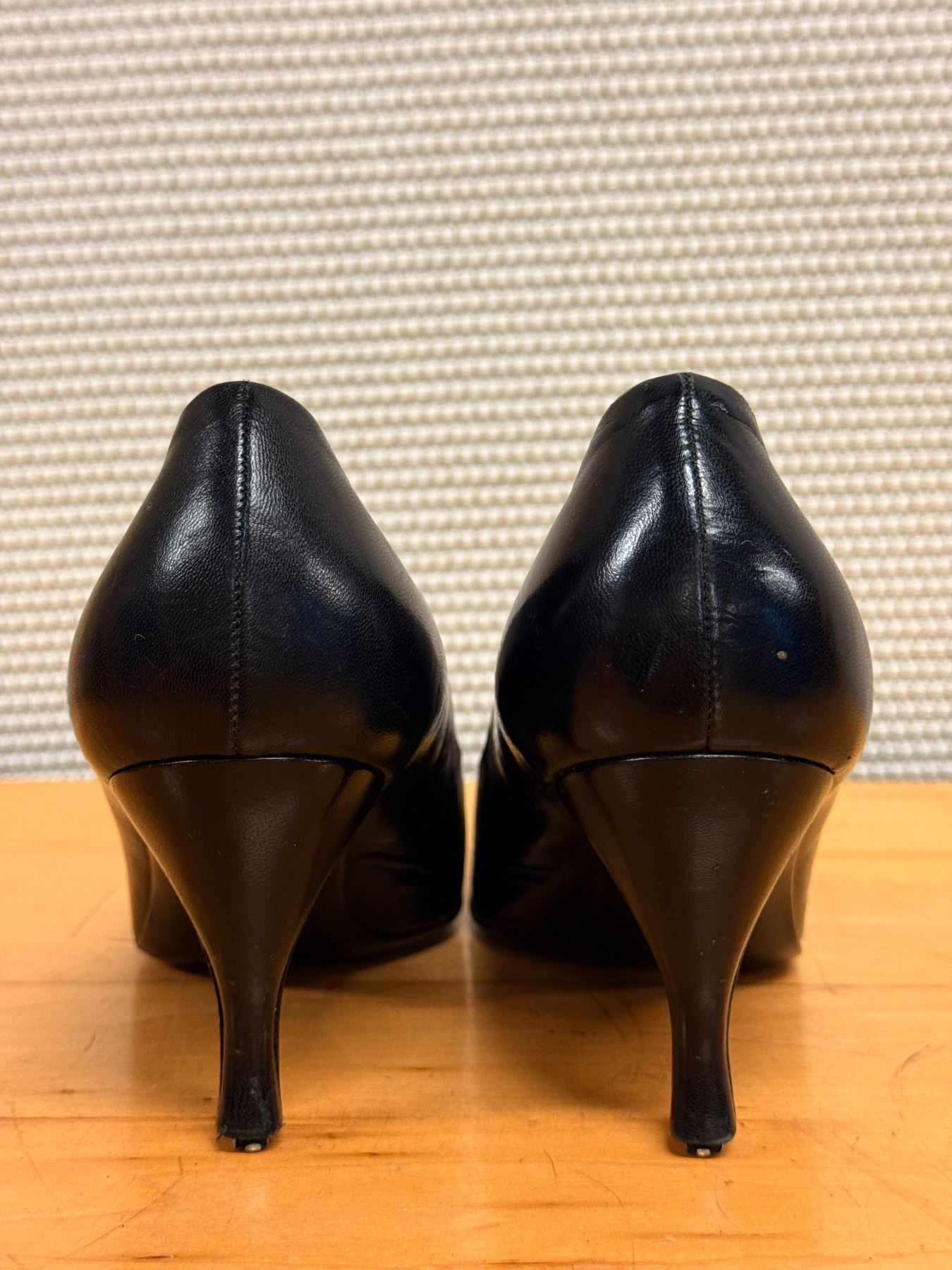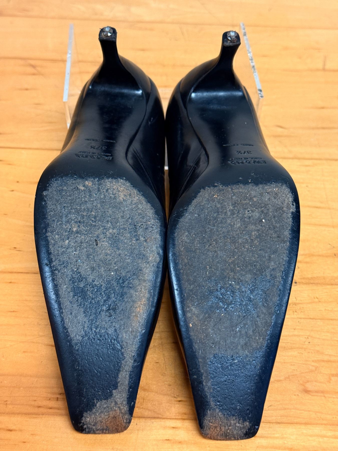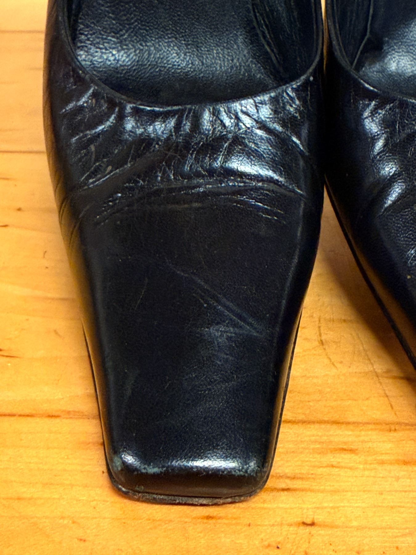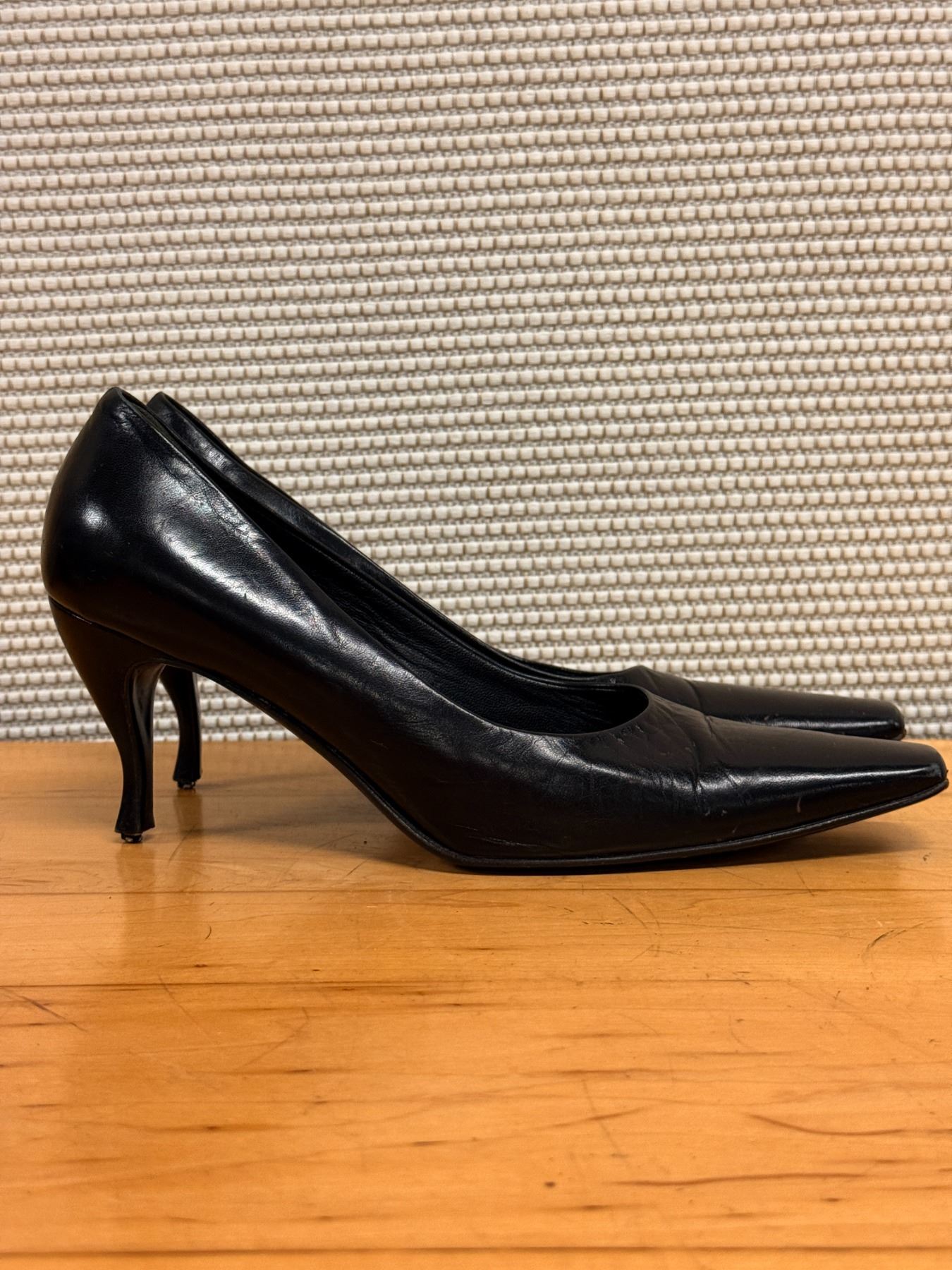 Prada black leather square-toe pumps in size 37 1/2 (equivalent to approximately US women's size 7 to 7.5) are elegant and sophisticated shoes crafted from high-quality leather, often featuring classic design elements. Signs of wear in pictures