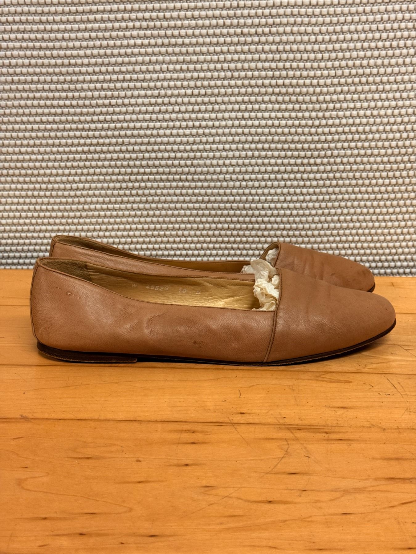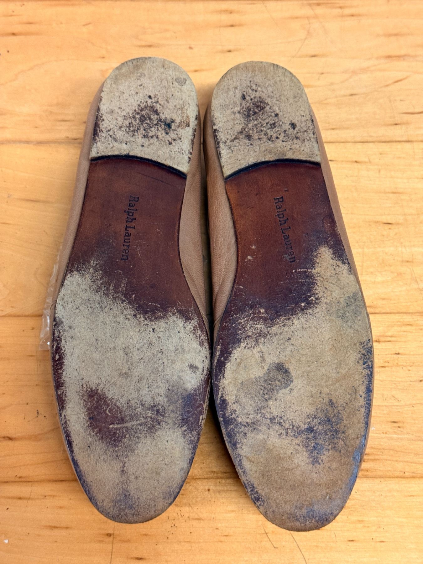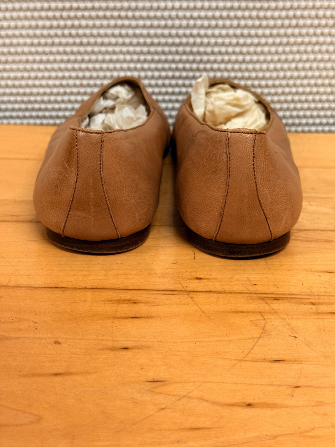 Soft tan nubuck flats by Ralph Lauren with a minimal, classic silhouette. Features a smooth rounded toe, leather lining, and cushioned insole. Light wear and gentle creasing from storage. A timeless everyday style with premium materials.