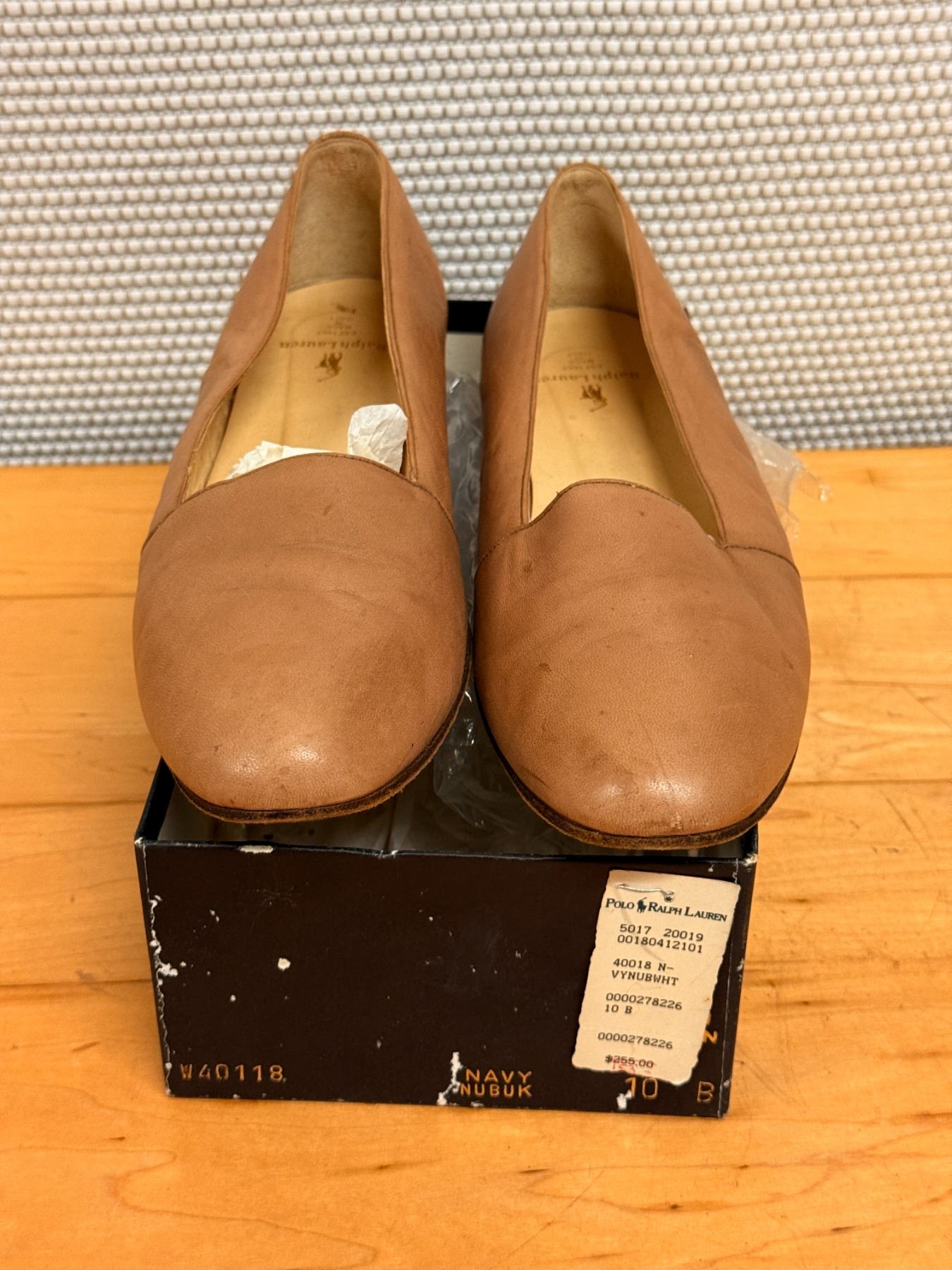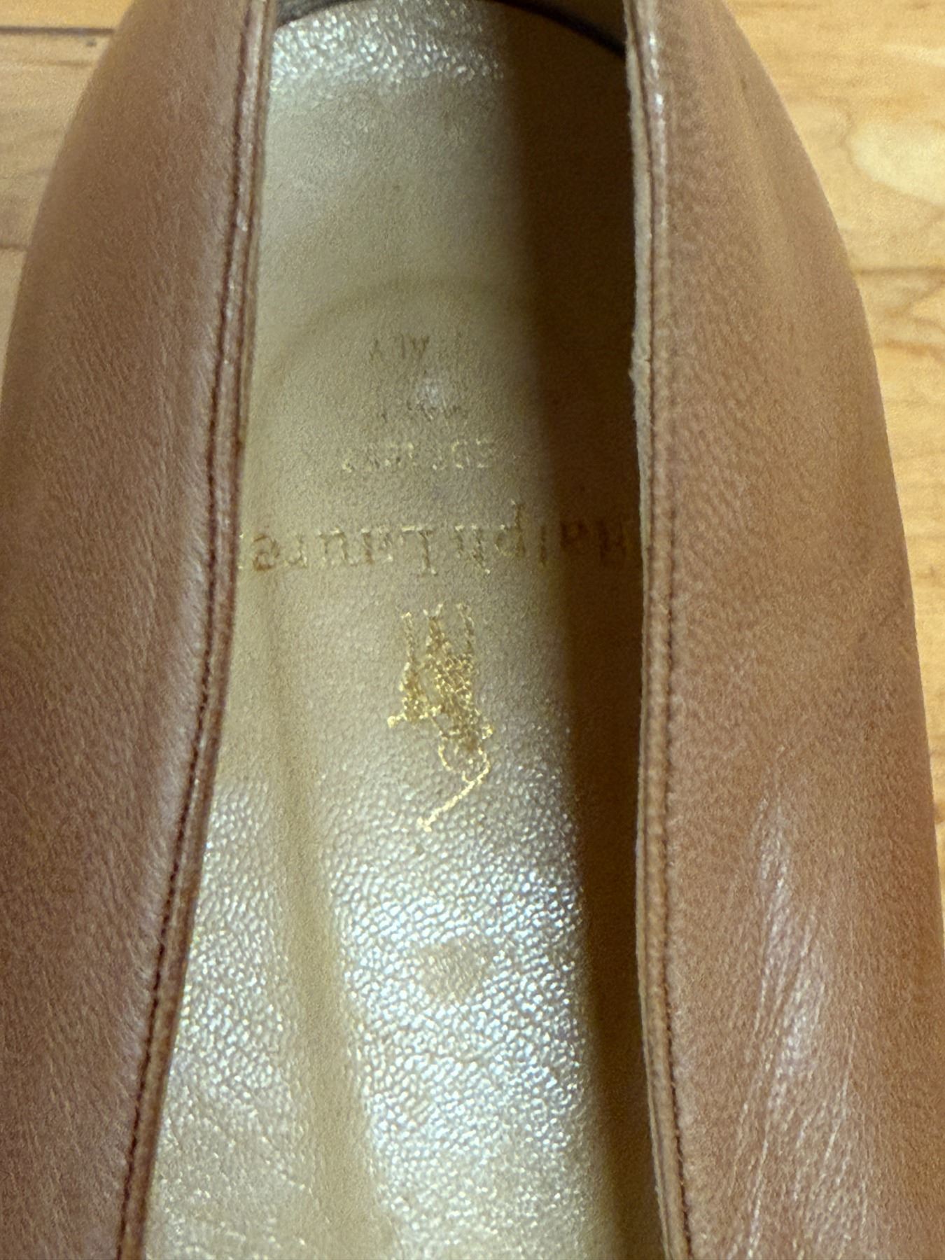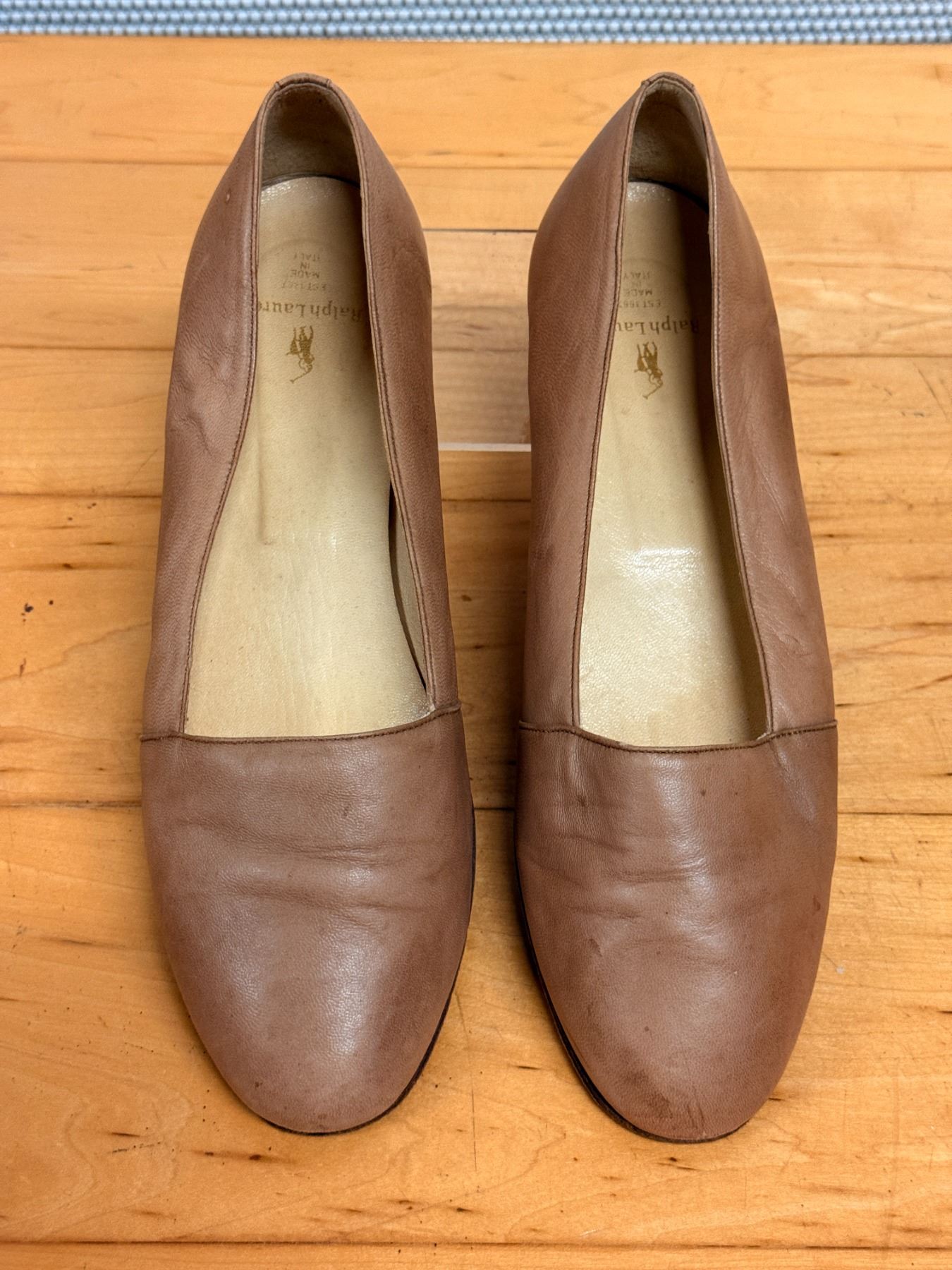 Soft tan nubuck flats by Ralph Lauren with a minimal, classic silhouette. Features a smooth rounded toe, leather lining, and cushioned insole. Light wear and gentle creasing from storage. A timeless everyday style with premium materials.