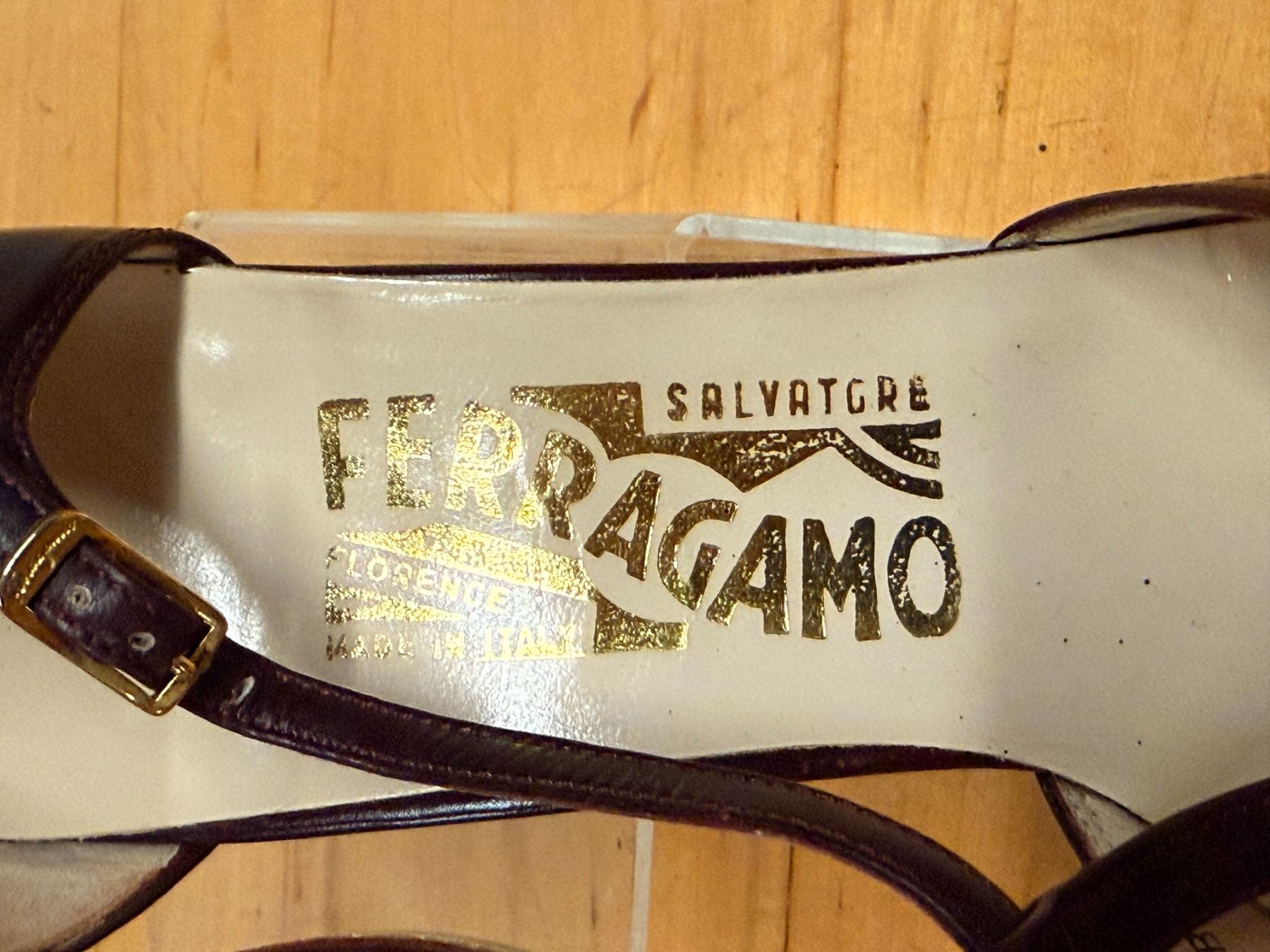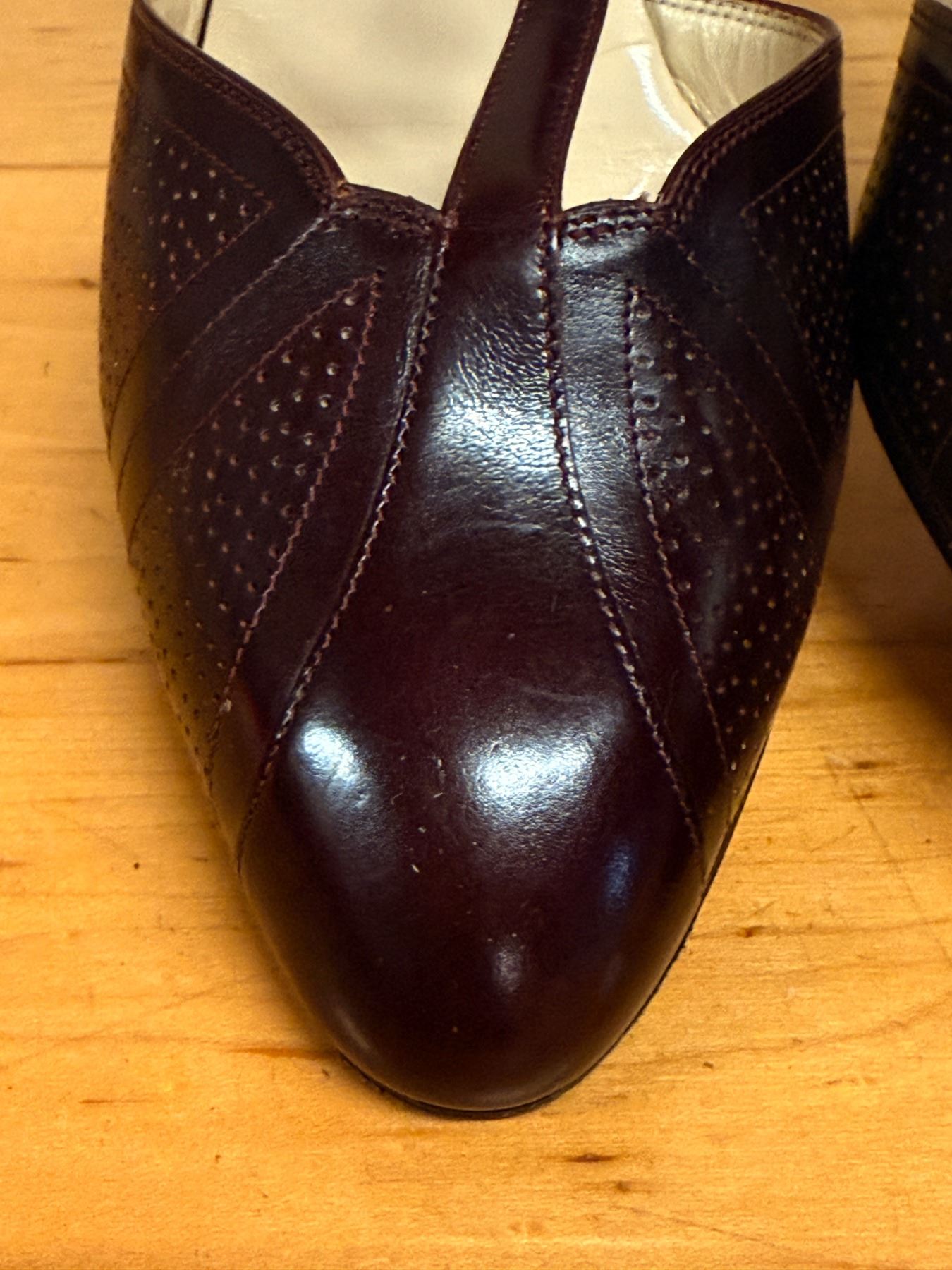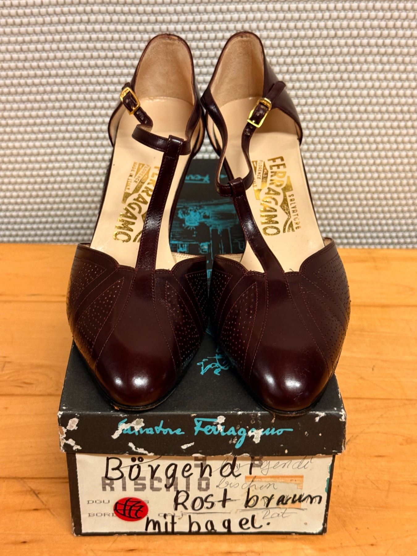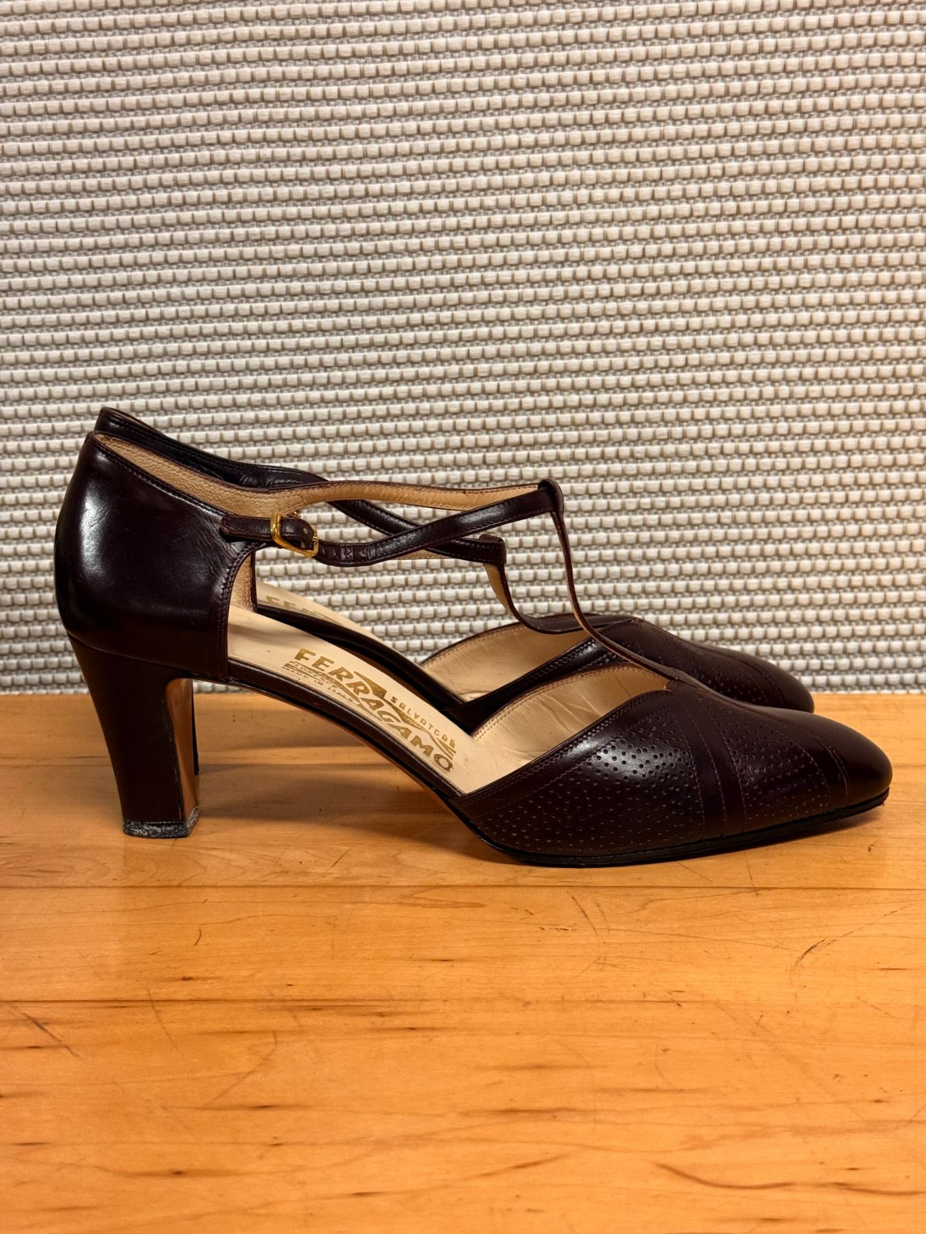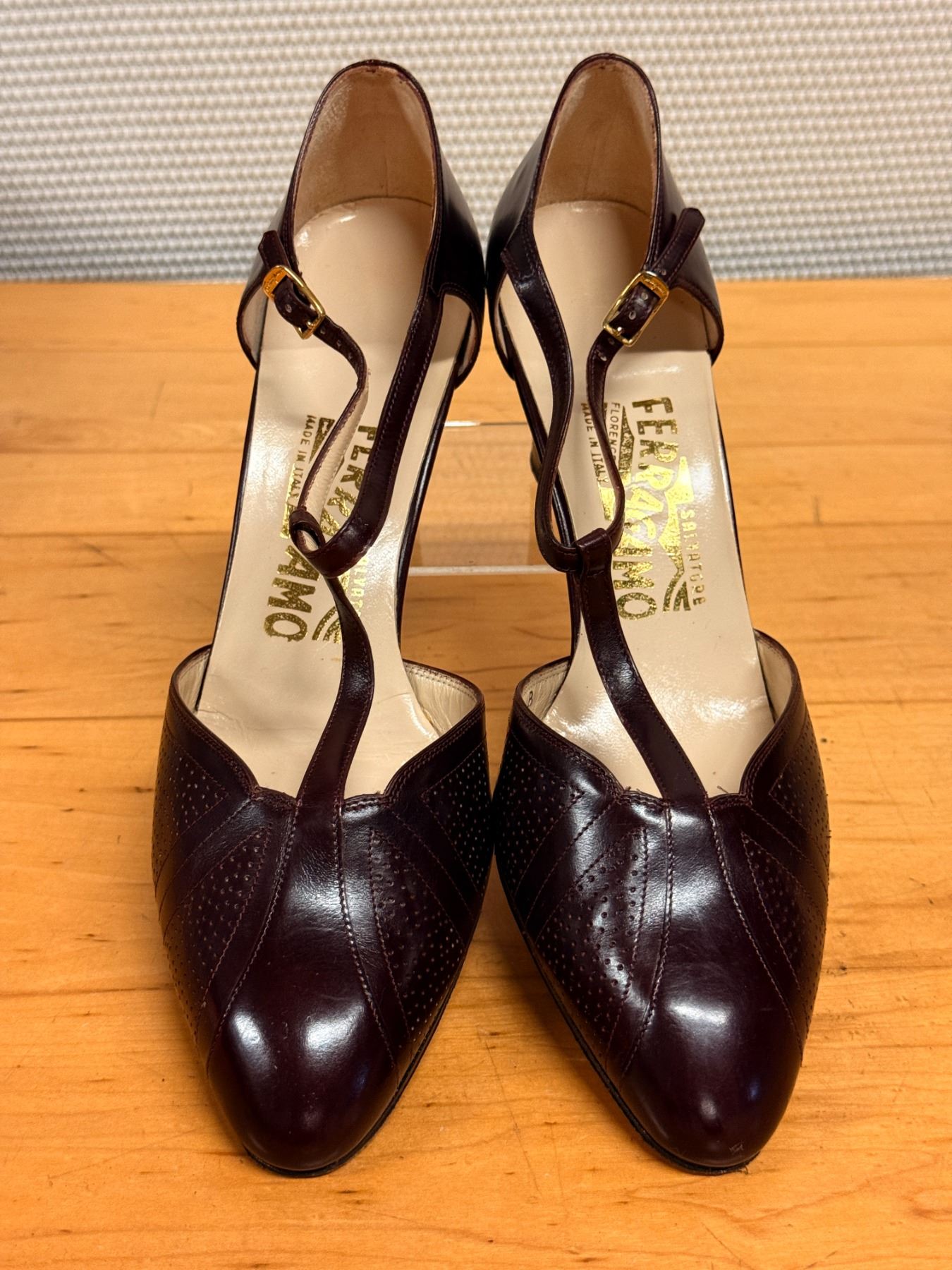Elegant burgundy Ferragamo T-strap heels with perforated detailing and smooth calf leather. Classic gold buckle and refined shape perfect for dressy or office wear.