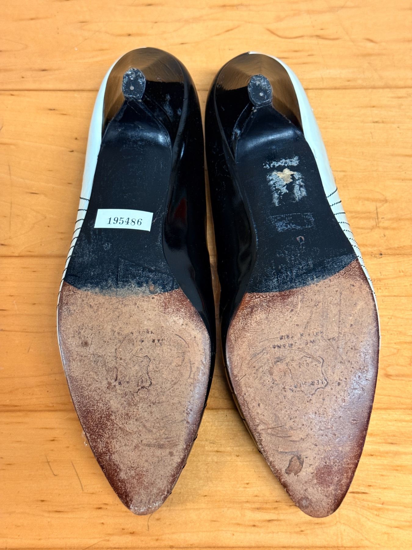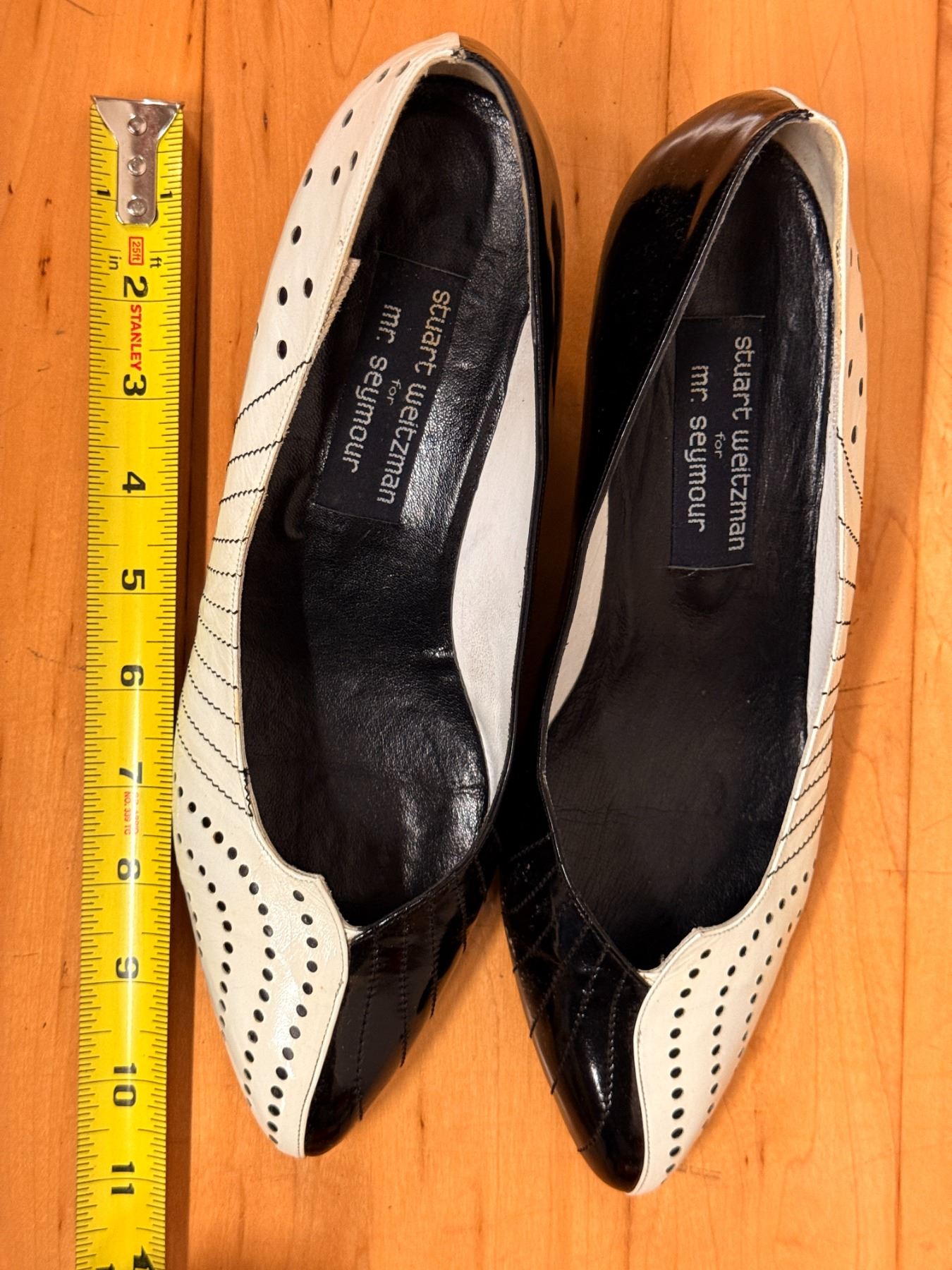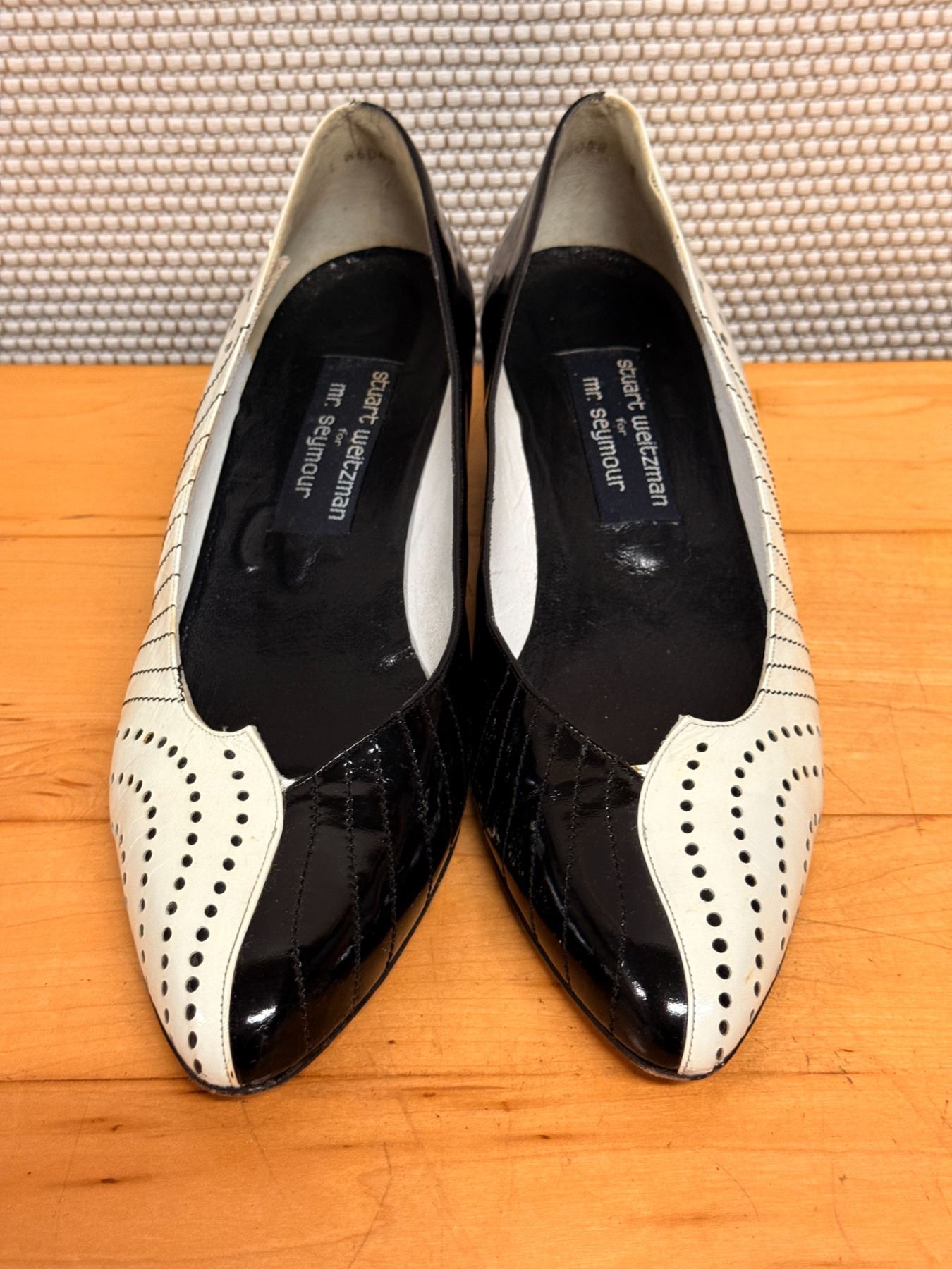Striking two-tone flats with a patent black body and white perforated wingtip design. Sharp, vintage, and full of character. Unique statement pair with classic Weitzman craftsmanship.