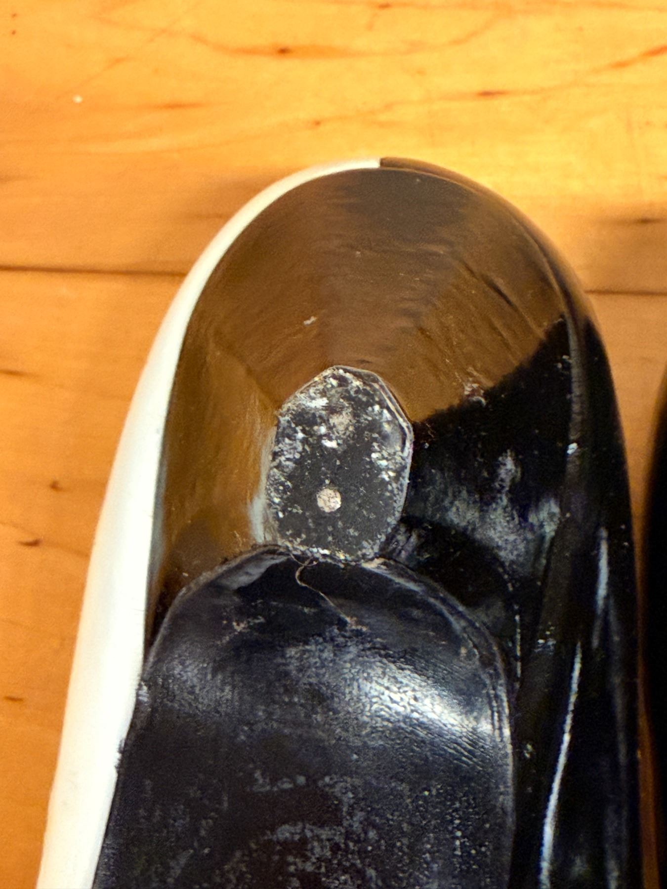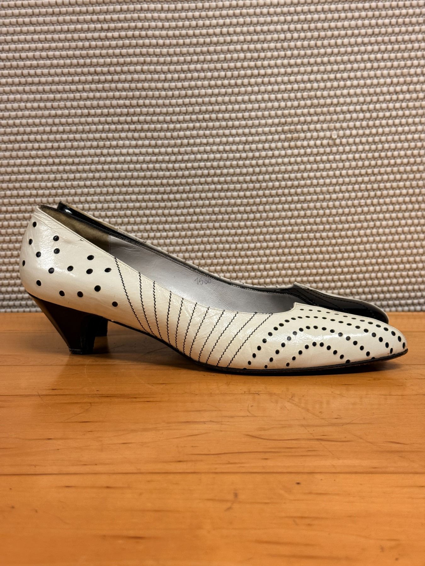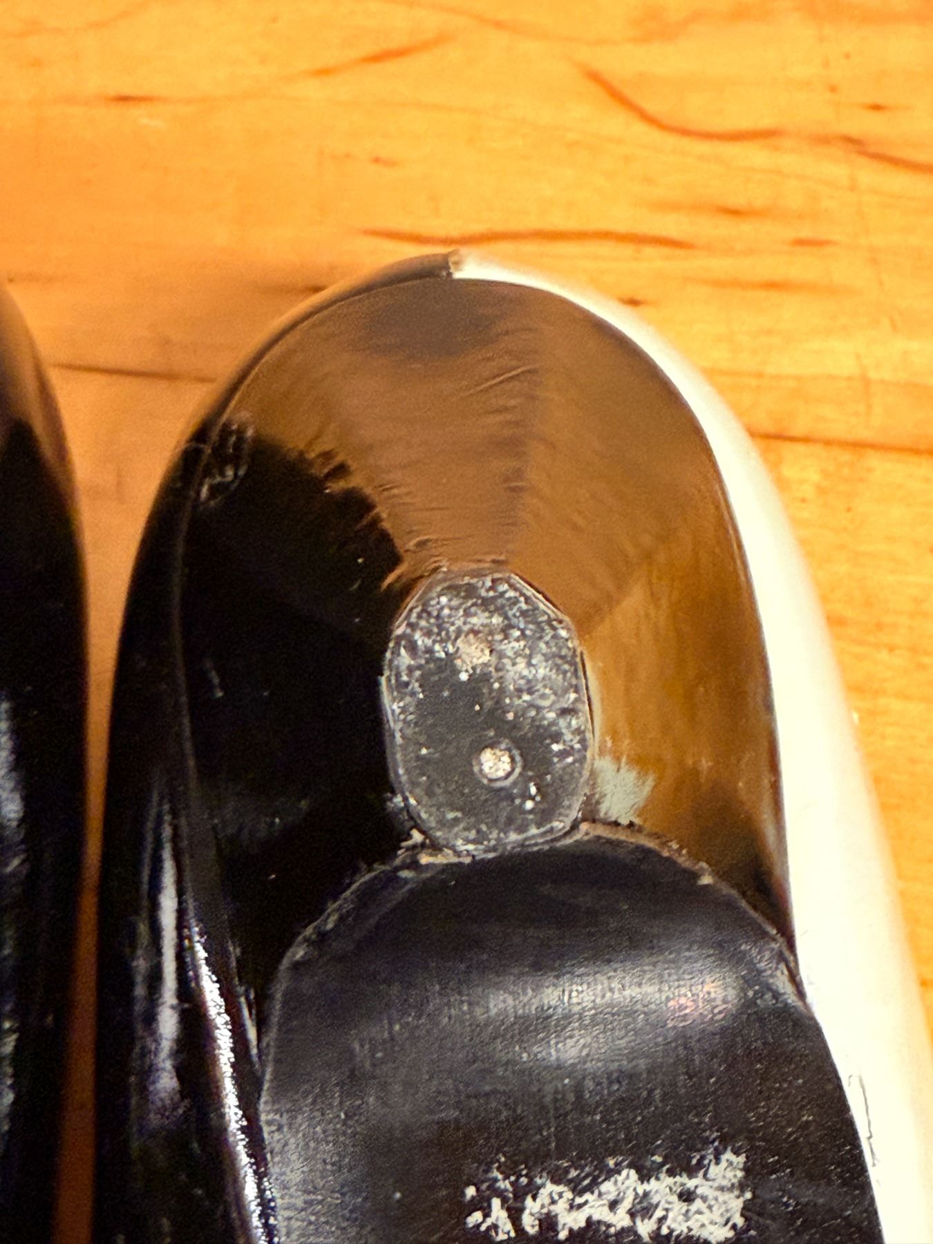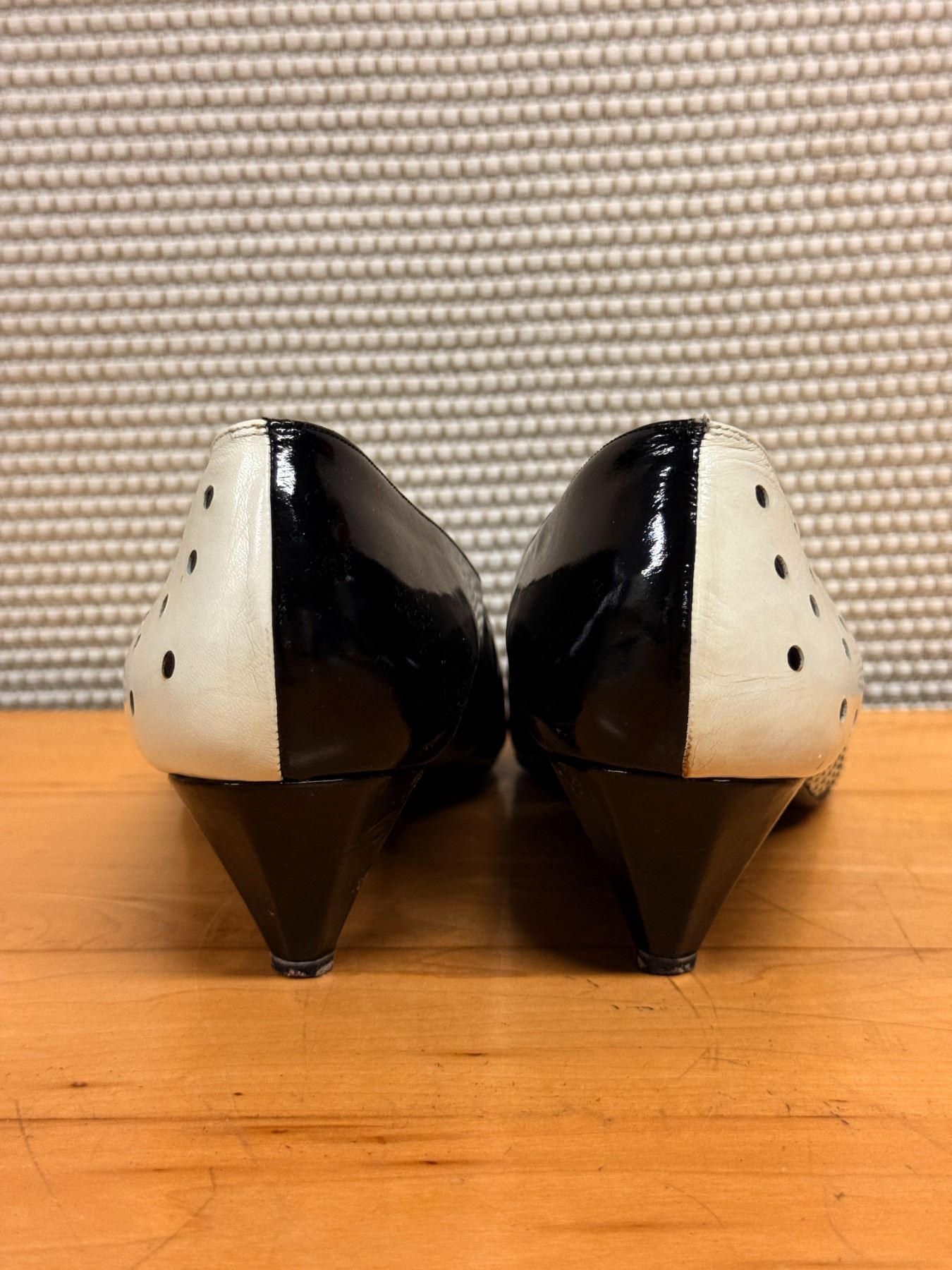 Striking two-tone flats with a patent black body and white perforated wingtip design. Sharp, vintage, and full of character. Unique statement pair with classic Weitzman craftsmanship.