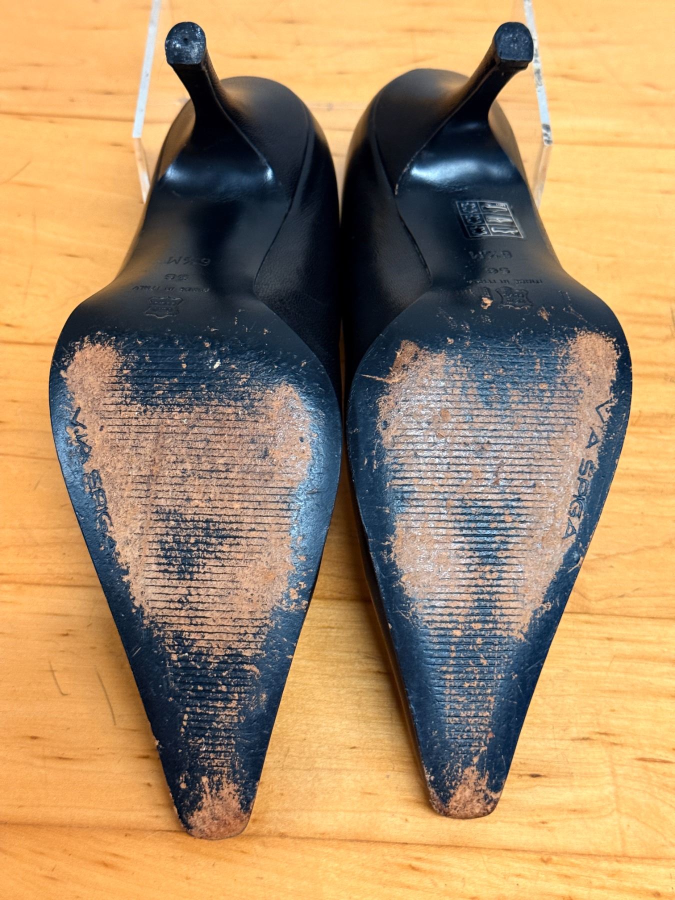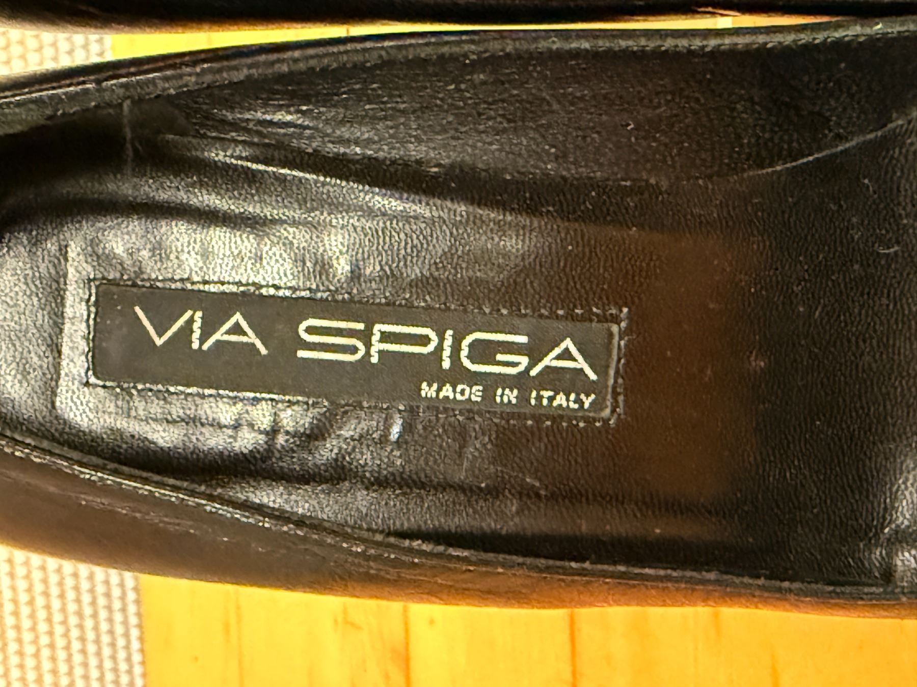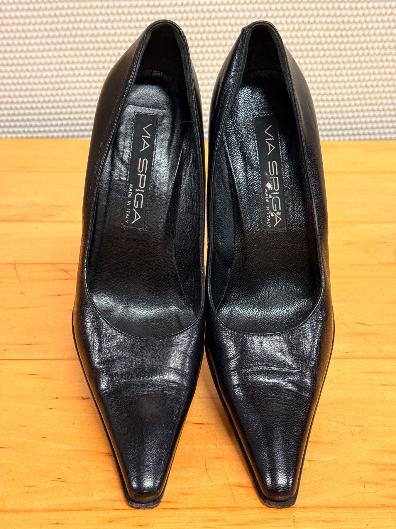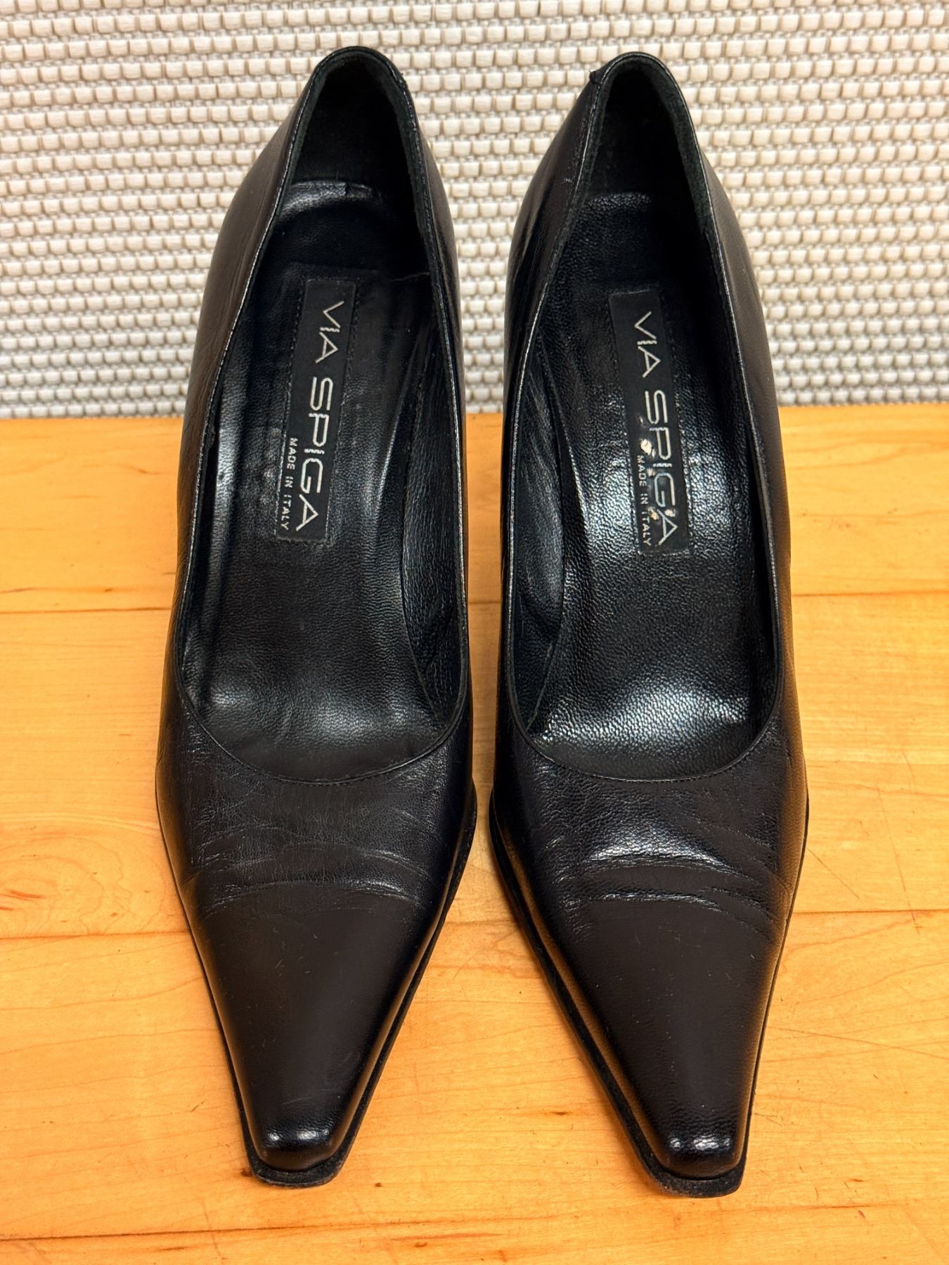 Via Spiga women's classic black leather pumps, crafted in Italy, are designed with a sleek pointed toe and typically feature a stiletto or slim heel. The brand is renowned for incorporating high-quality materials and fine Italian craftsmanship. Signs of wear in pictures