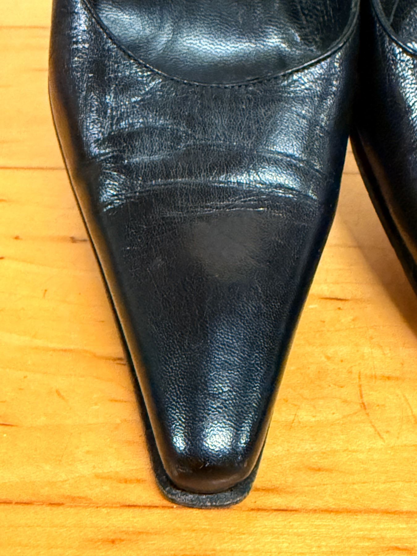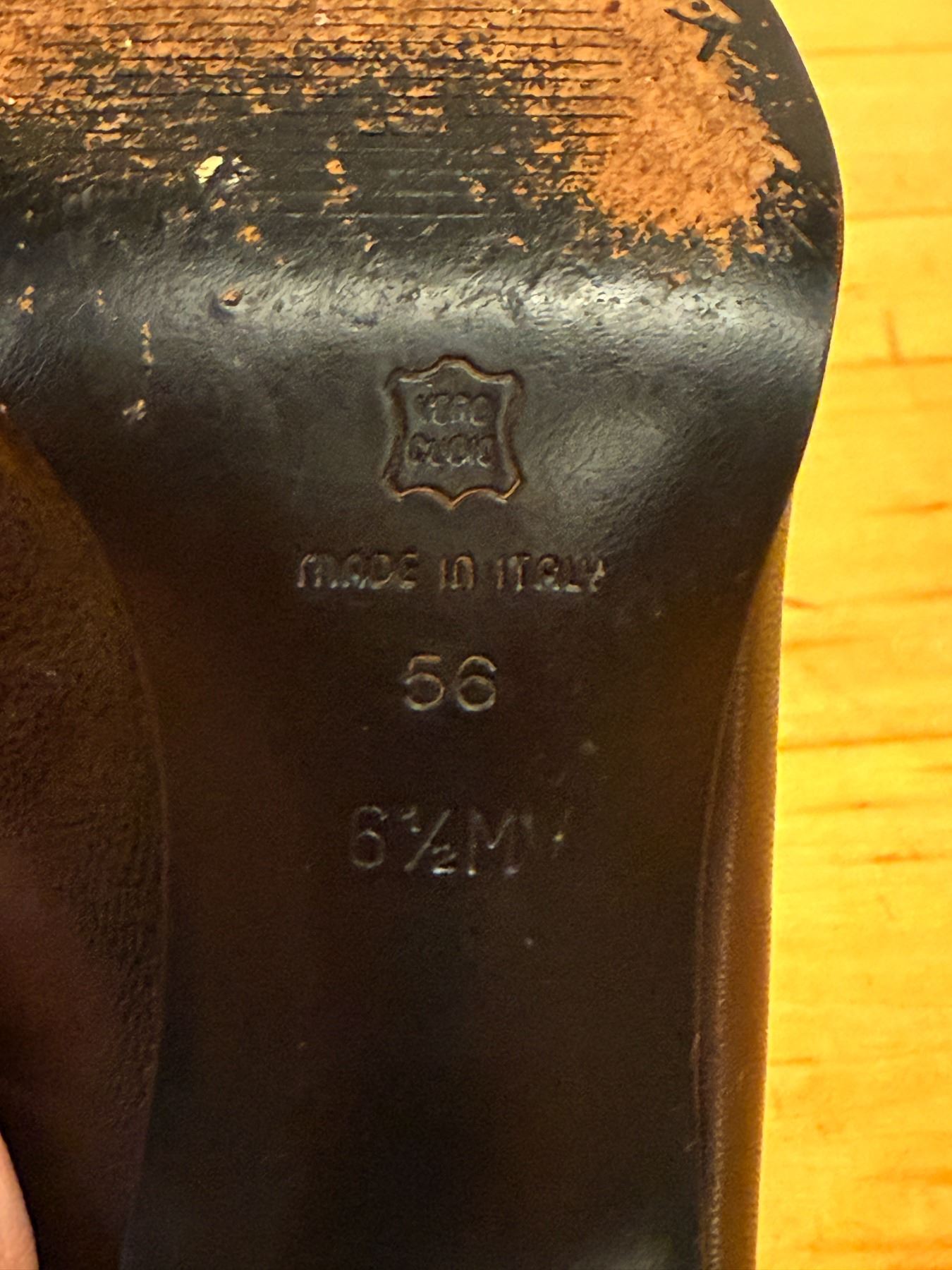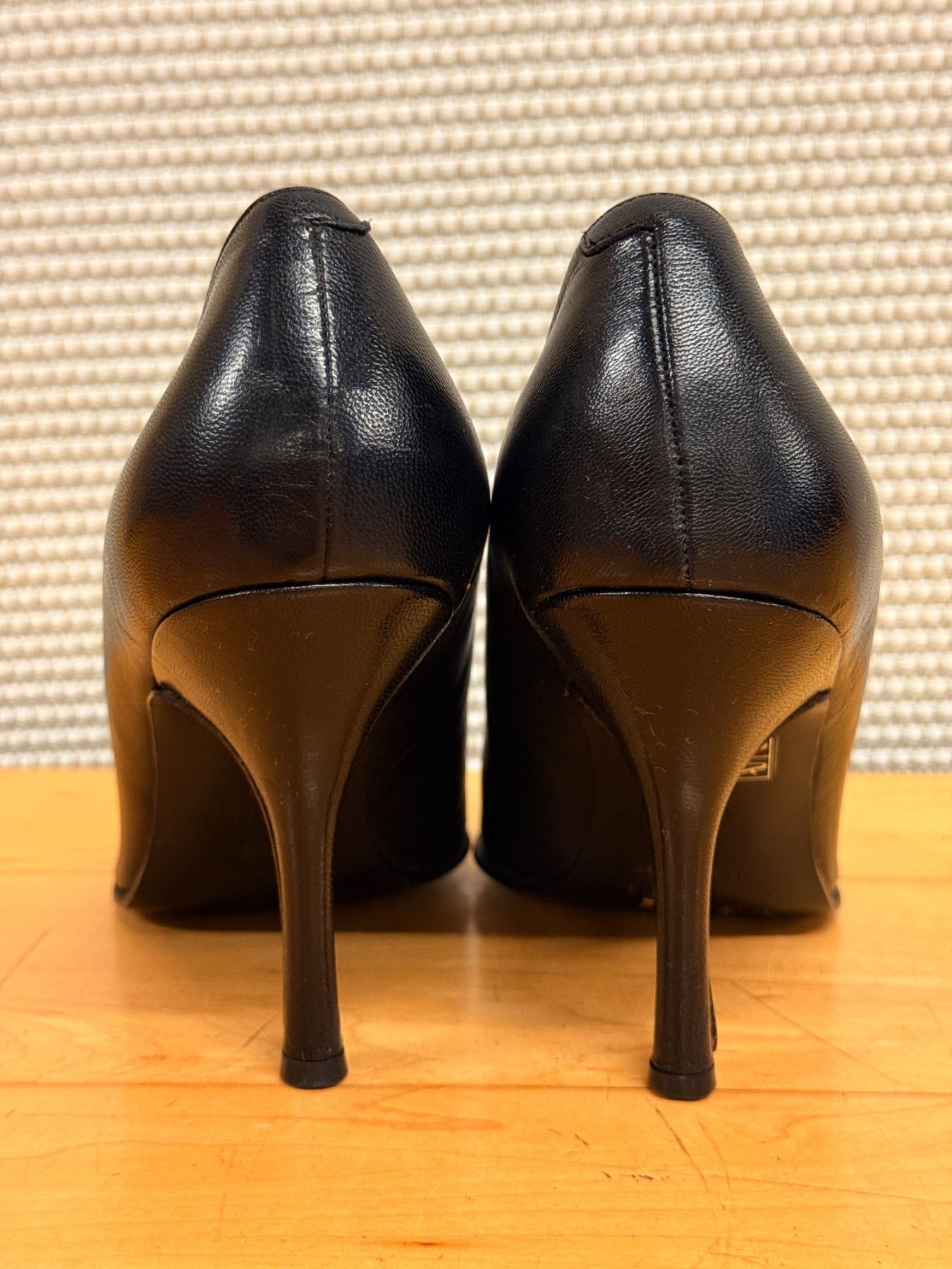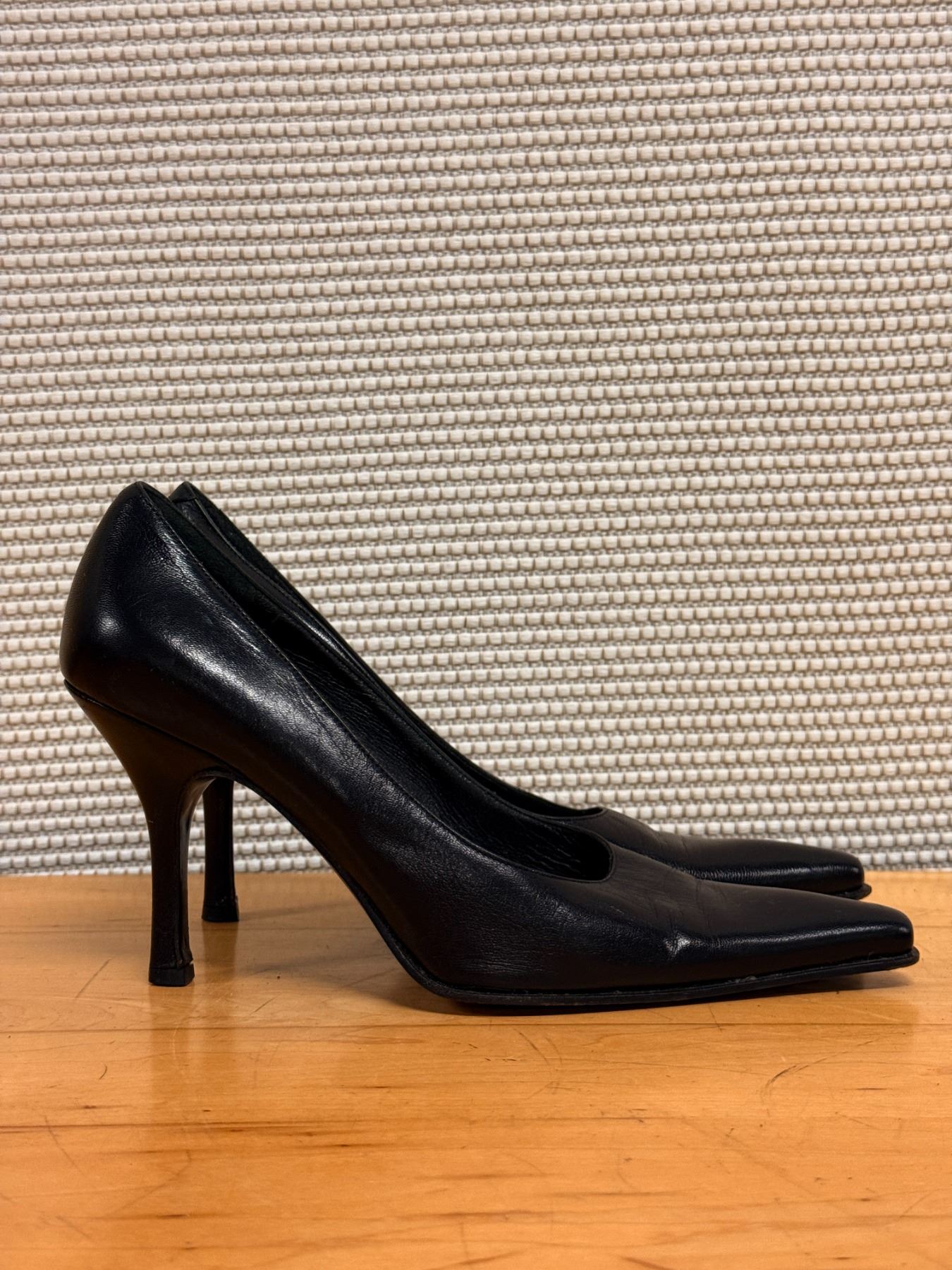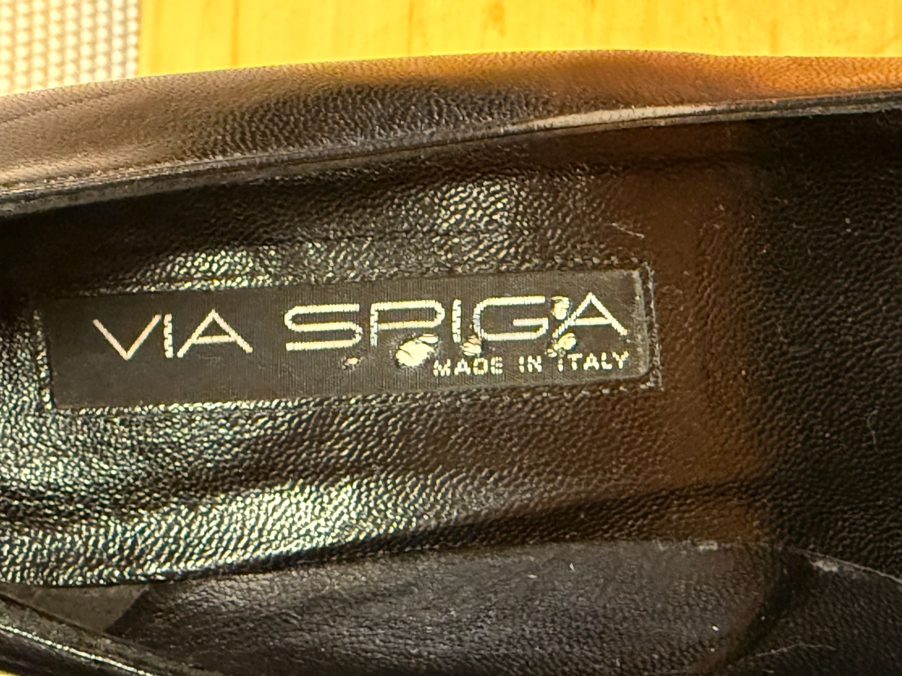 Via Spiga women's classic black leather pumps, crafted in Italy, are designed with a sleek pointed toe and typically feature a stiletto or slim heel. The brand is renowned for incorporating high-quality materials and fine Italian craftsmanship. Signs of wear in pictures