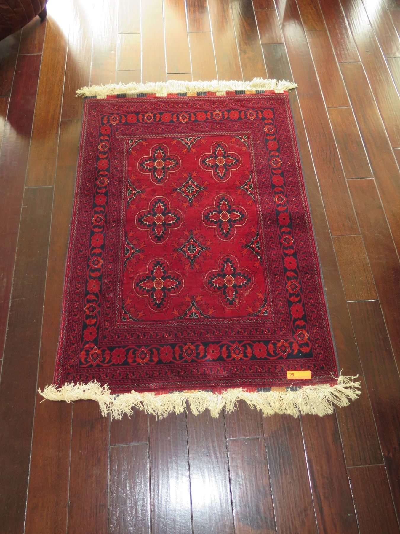 Vermillion Afghan Wool Carpet, 6 Medallions w/Floral & Leaf Motifs, 42" x 59", Fringed Borders