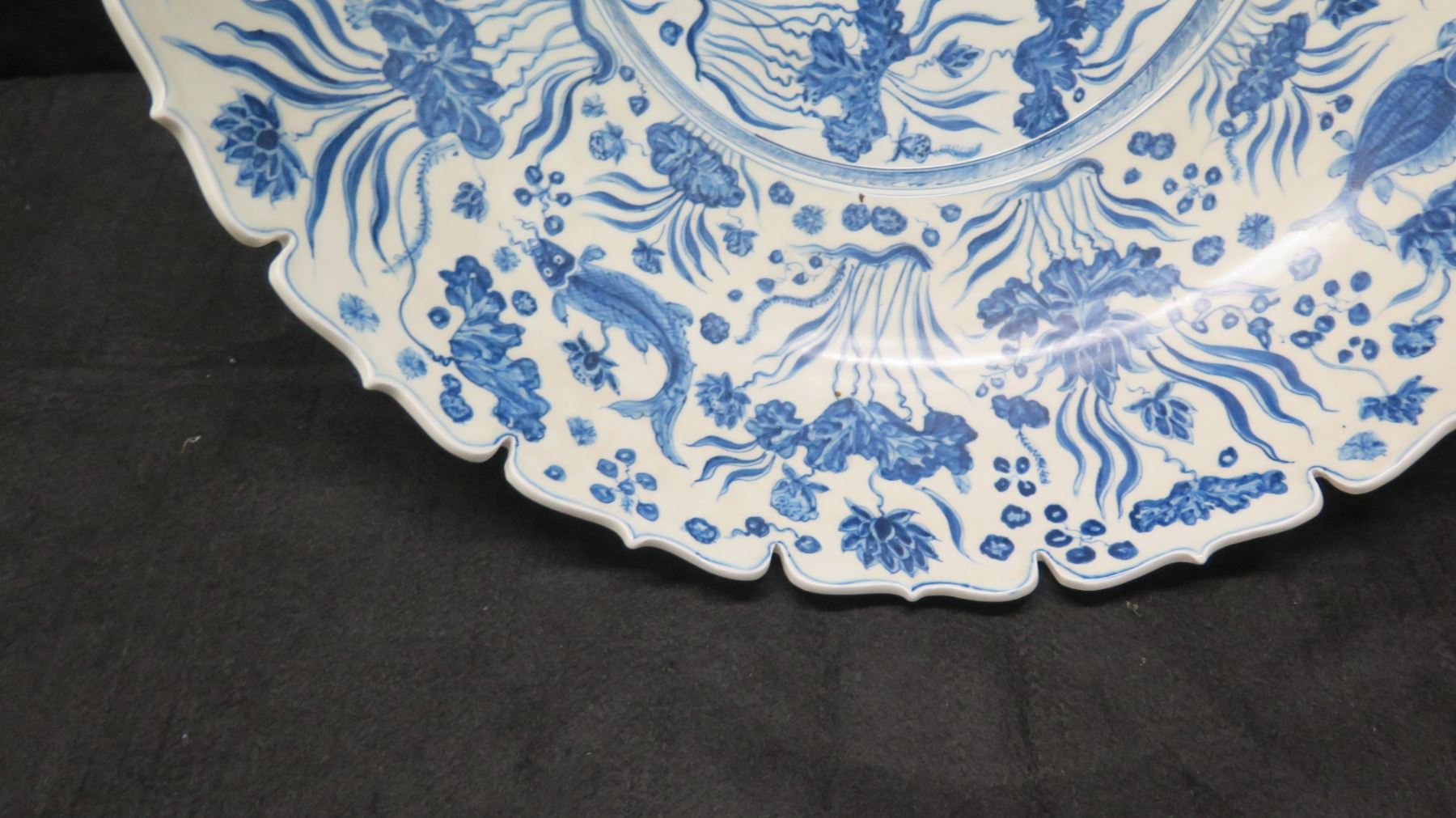 Very Large Glazed White w/ Blue Porcelain Bowl w/ Scalloped Edges & Oriental Characters 22" Dia