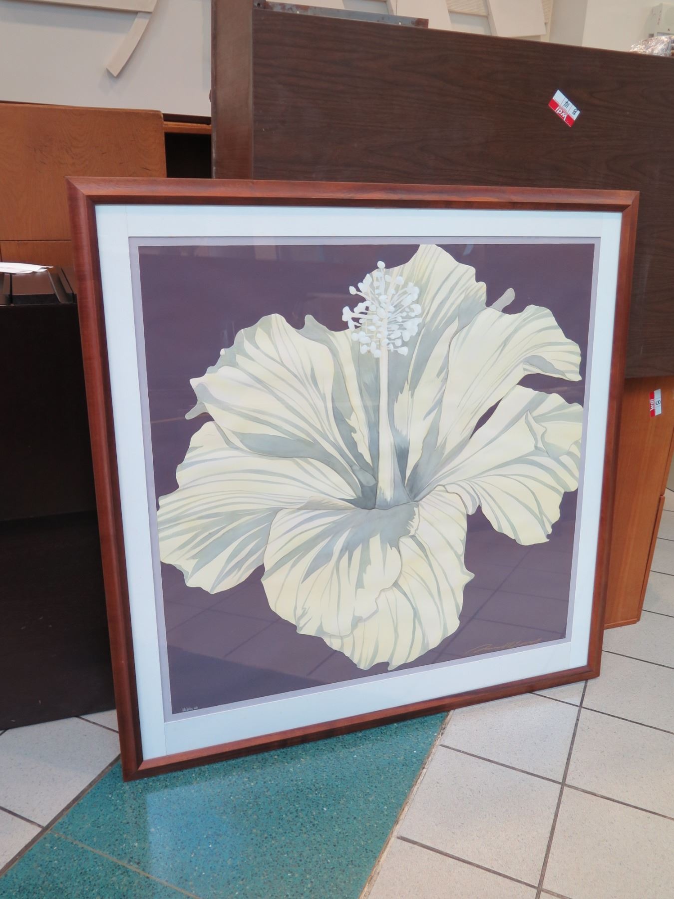 Very Large Original Watercolor "Hibiscus" Signed, Russell Lowery, Koa Frame 50"x50"