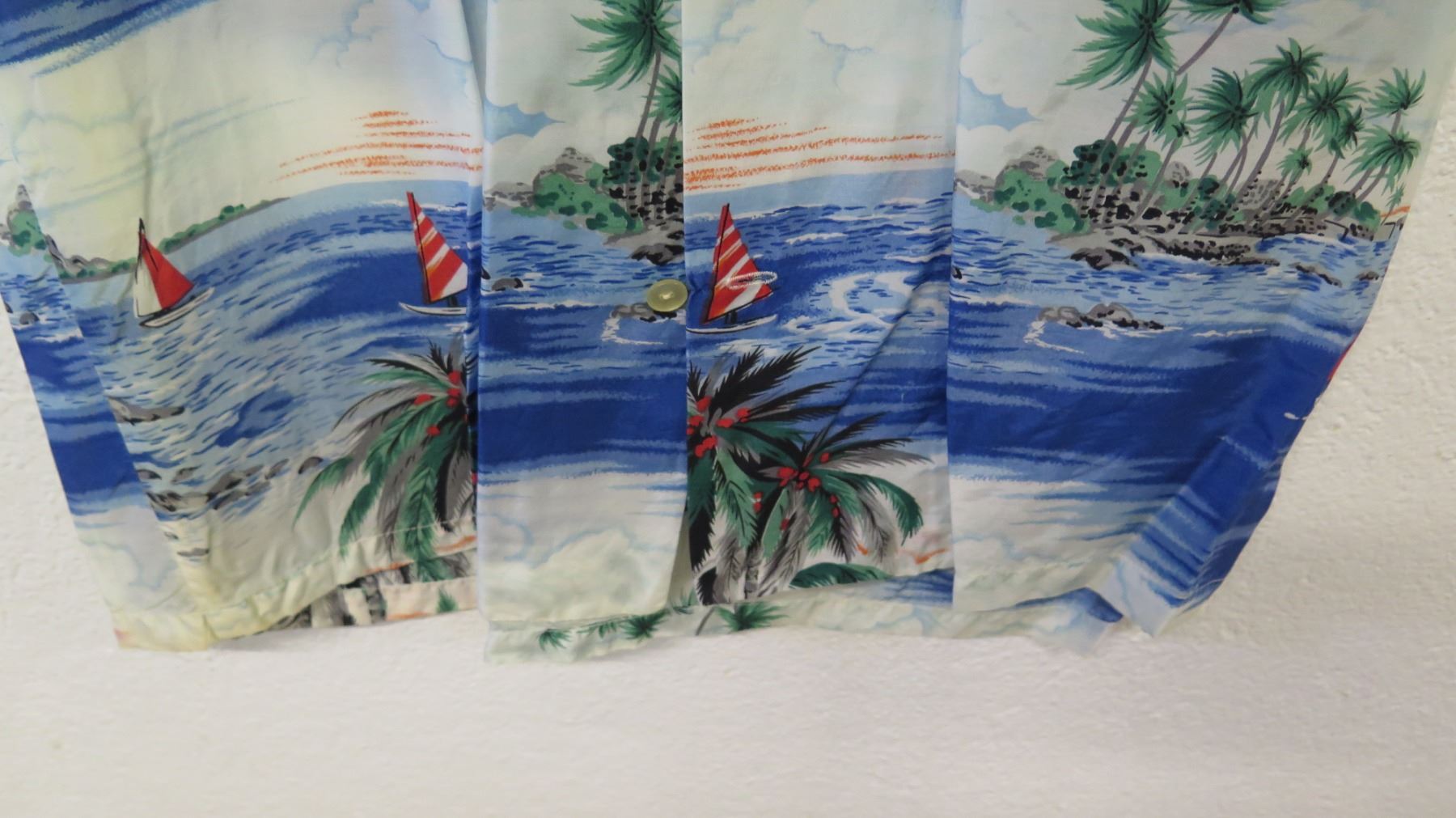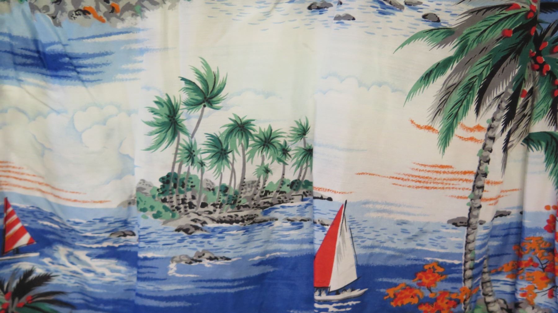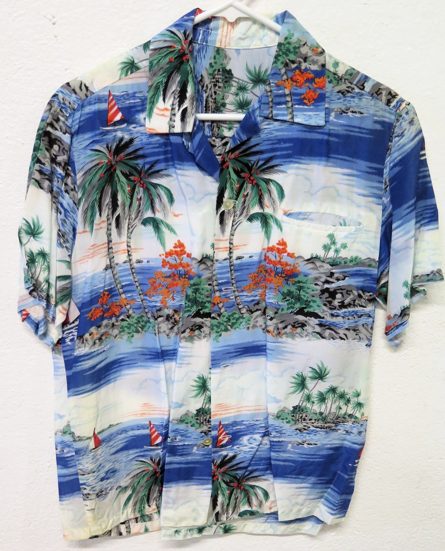 Vintage Aloha Shirt - Blue & Red Palm Tree/Sailing Motif, No Tags, Size Unknown