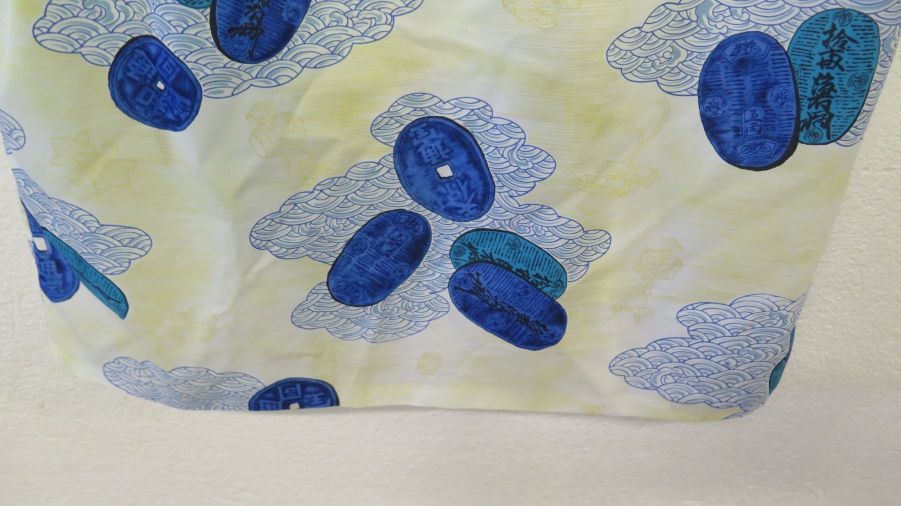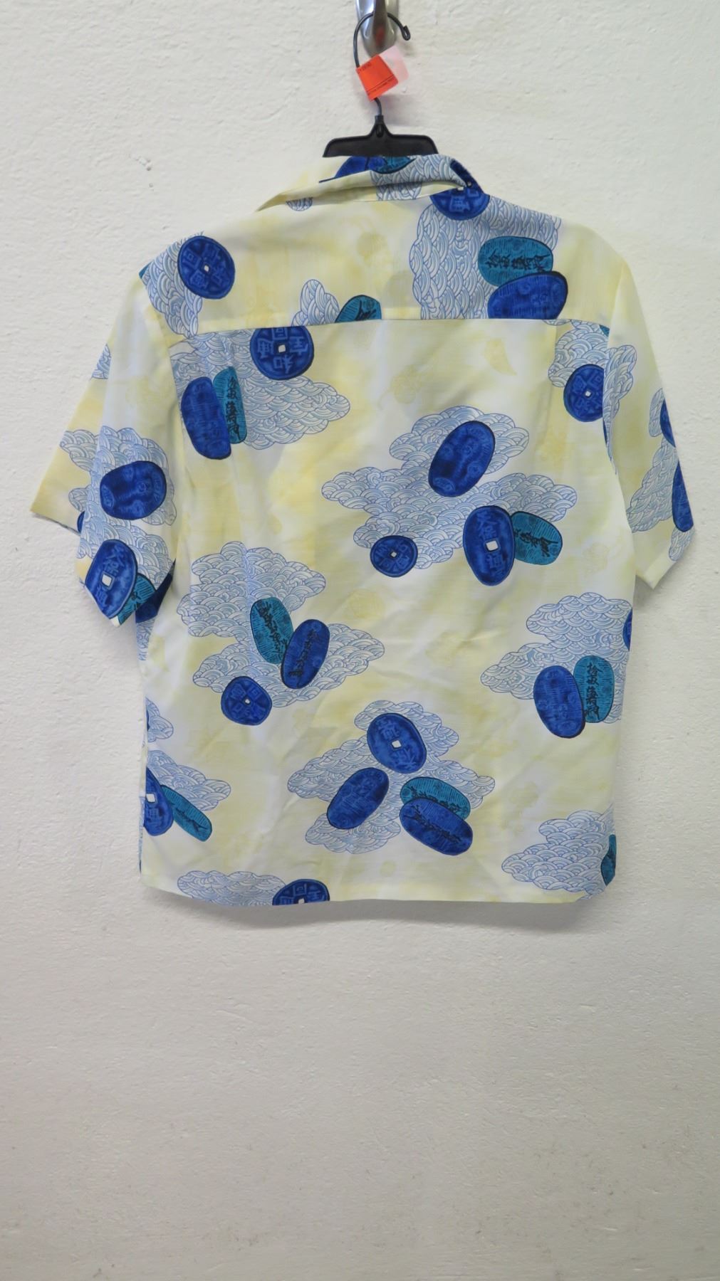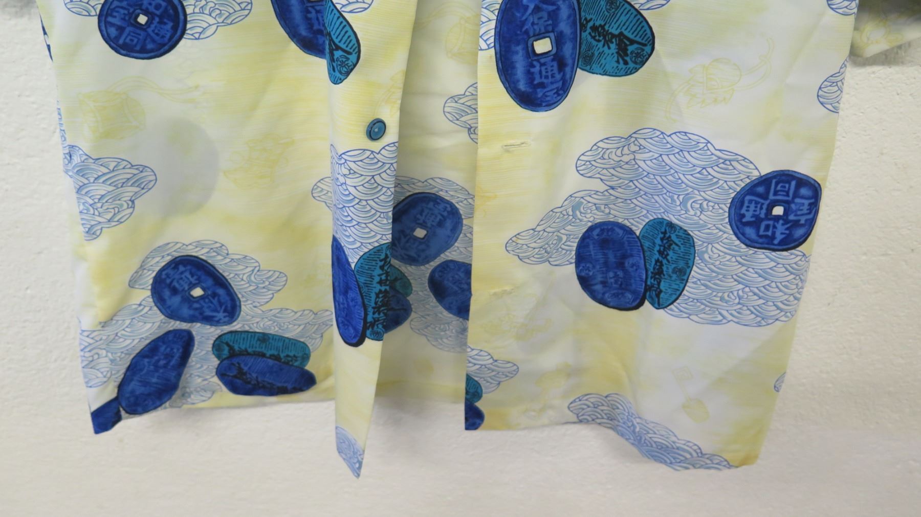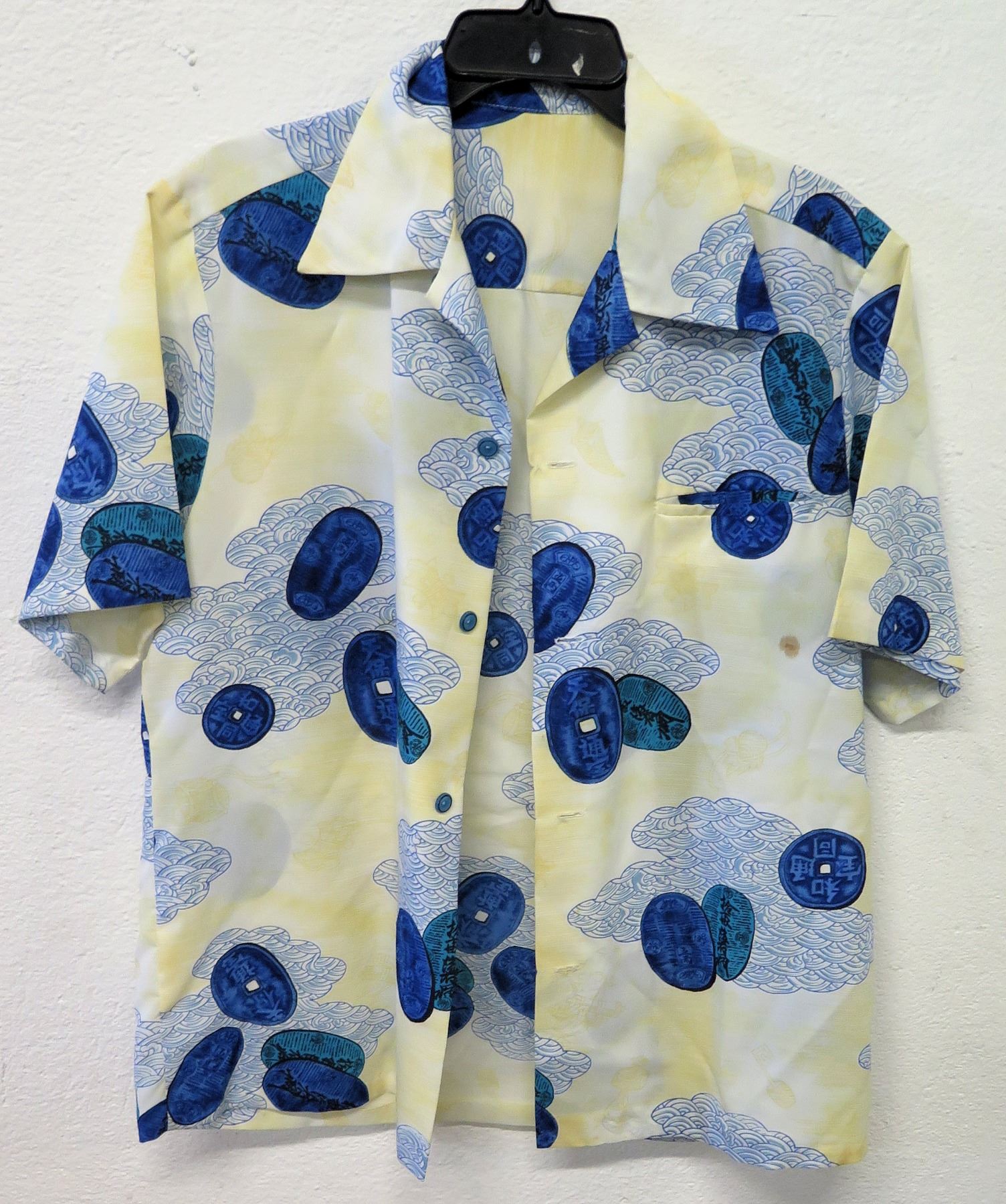Vintage Aloha Shirt - Chinese Coins/Asian Motif, Yellow Blue, No Tags, Size Unknown