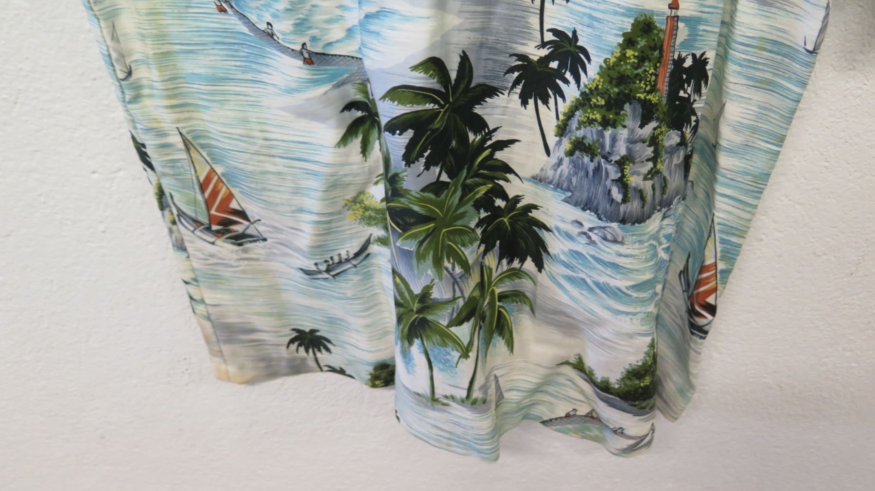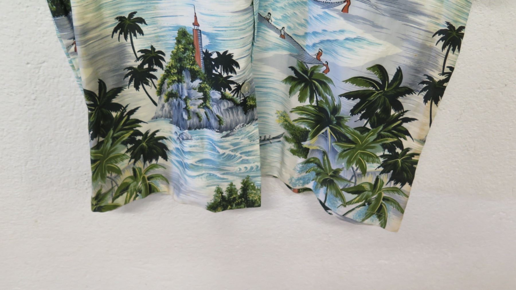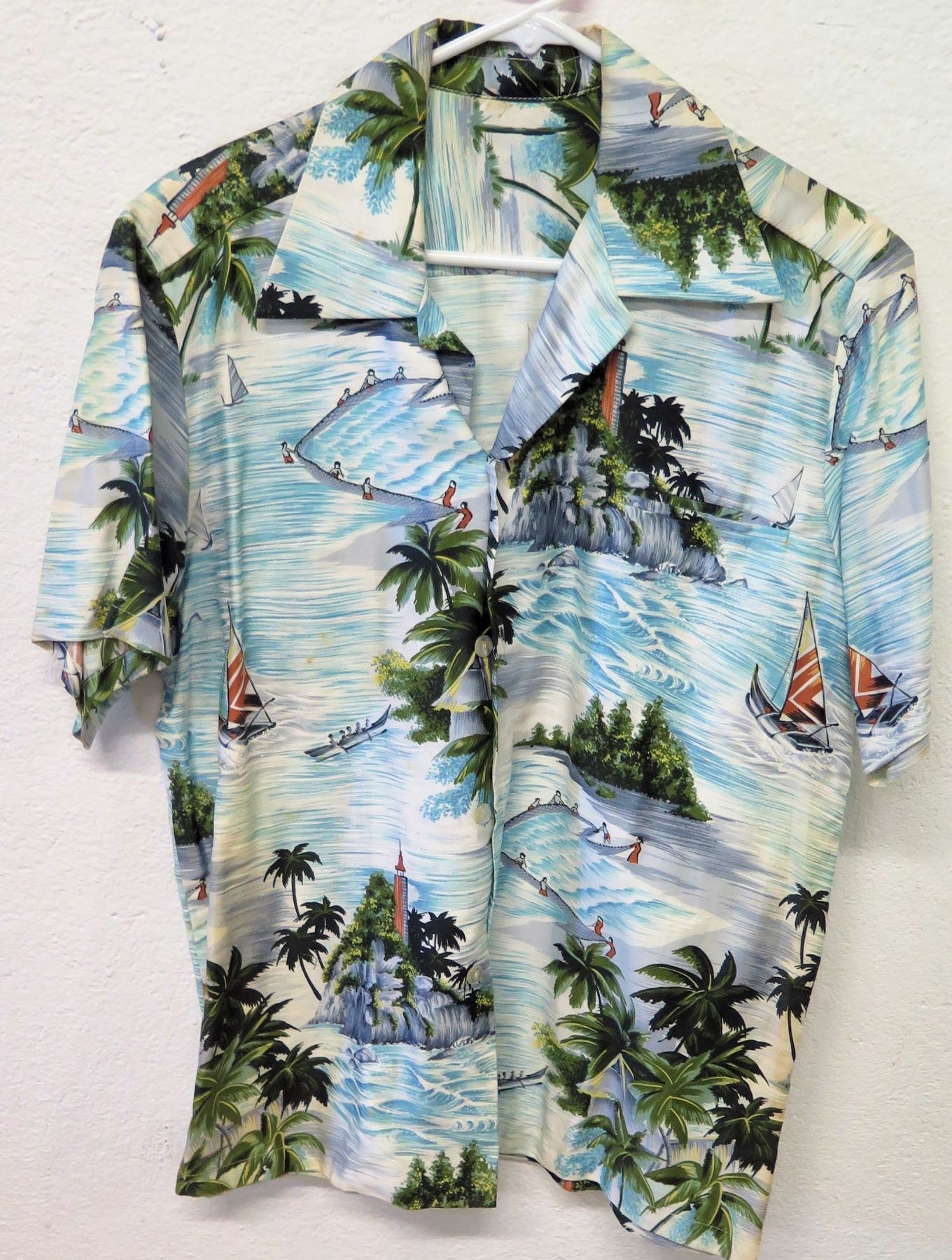 Vintage Aloha Shirt - White & Blue Palm Trees/Fishing Scenes, No Tags, Size Unknown