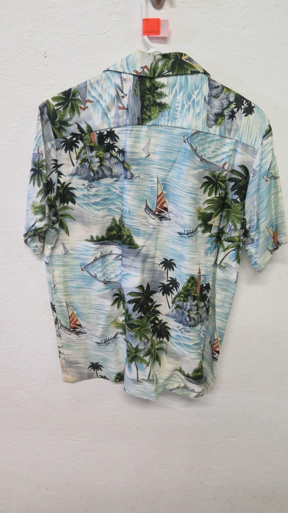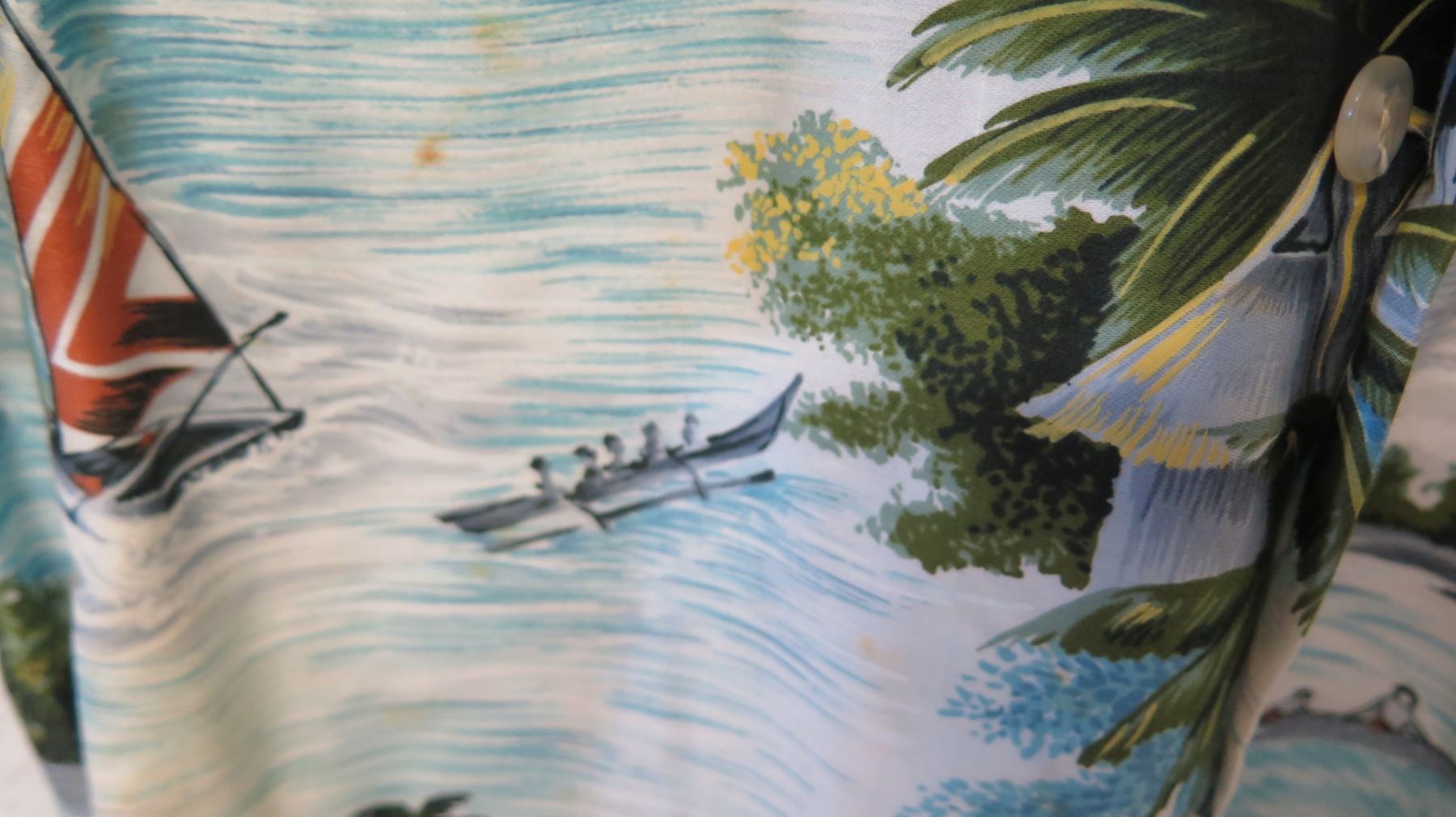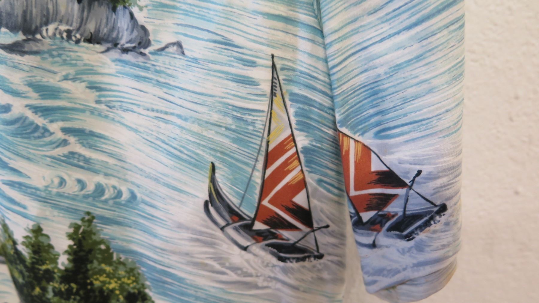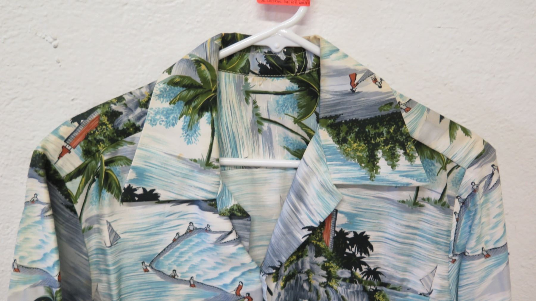 Vintage Aloha Shirt - White & Blue Palm Trees/Fishing Scenes, No Tags, Size Unknown