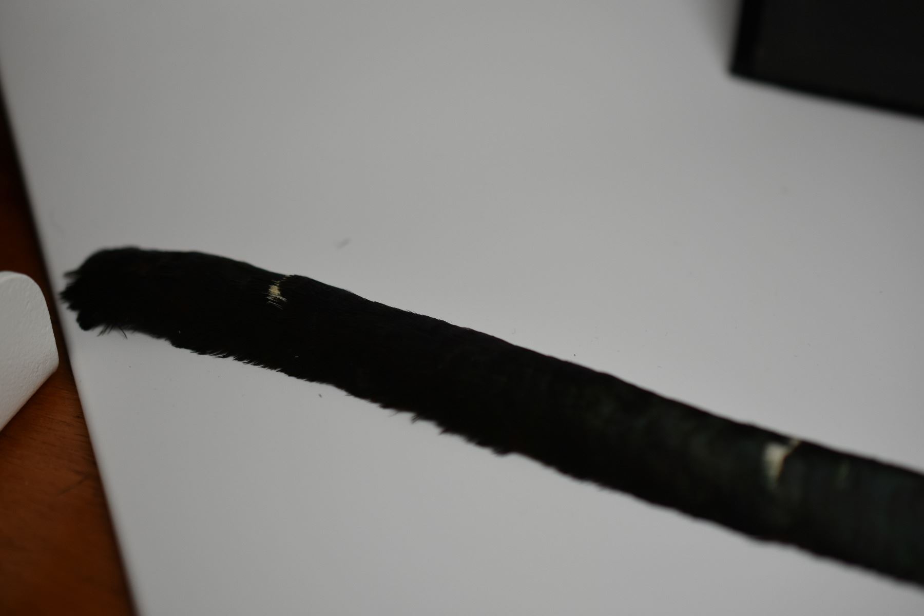 Vintage Black Irridescent Green Feather Hat Band - 1" Width, 6 Vertical White Bands, Good Cond.