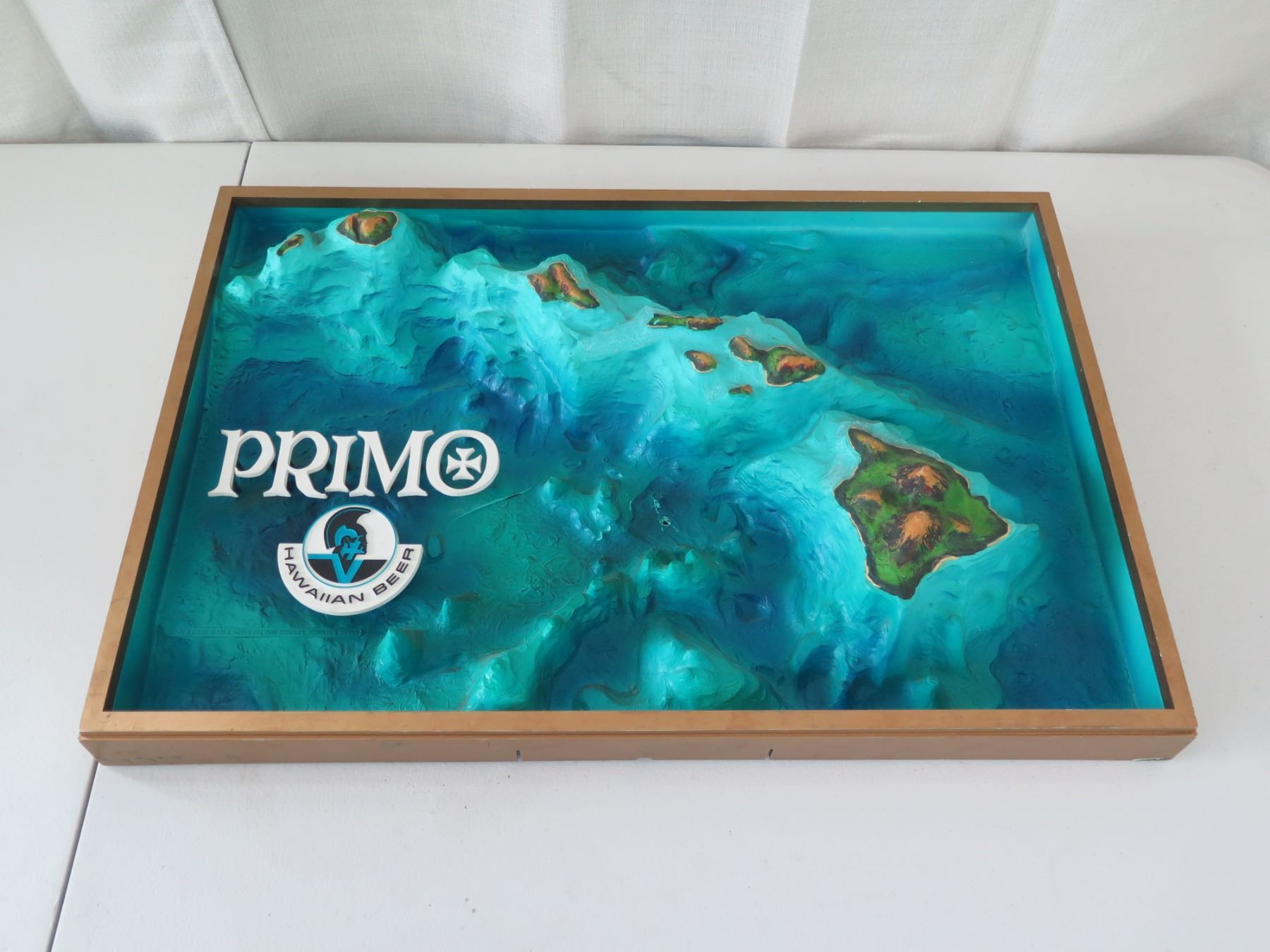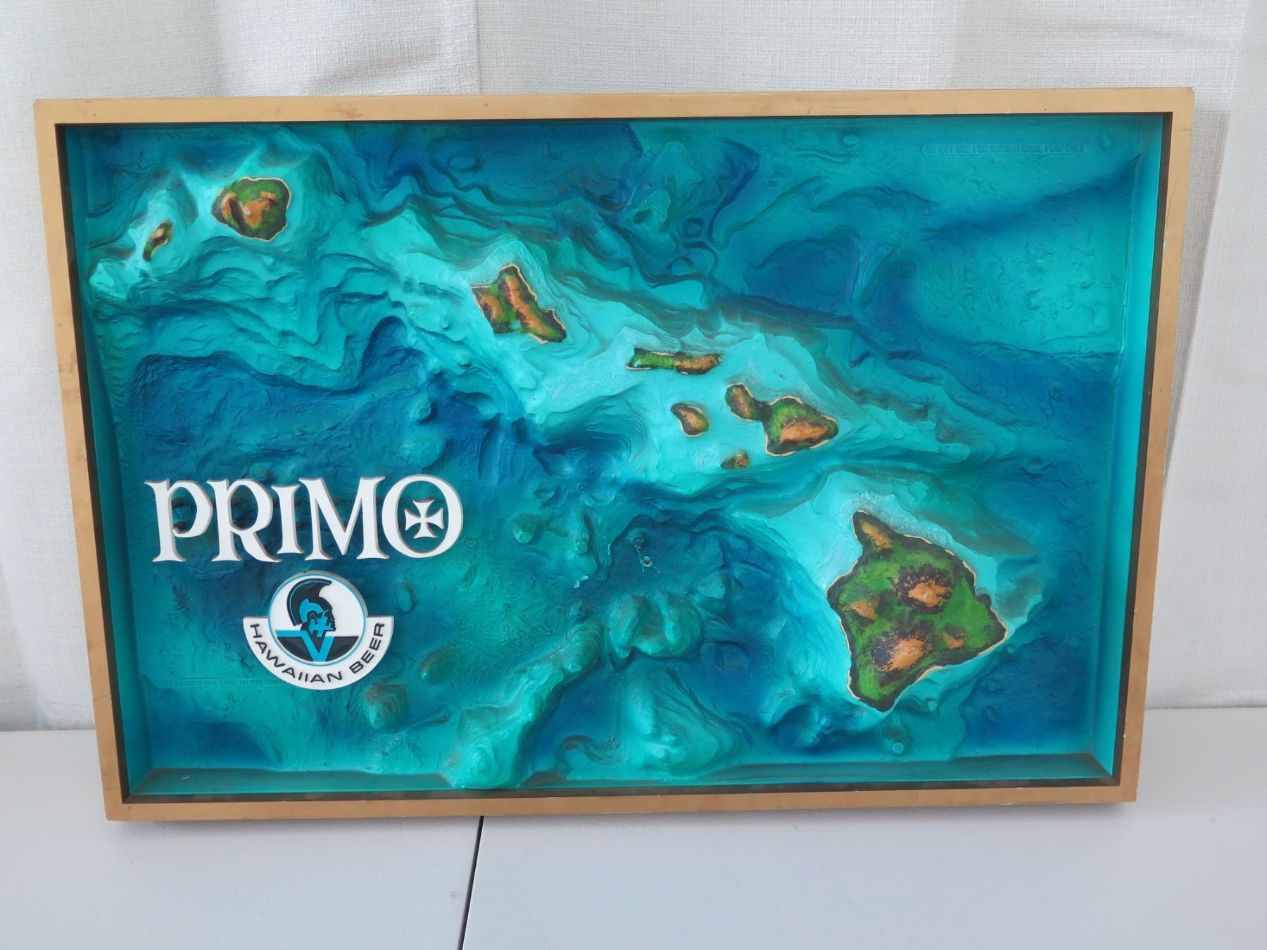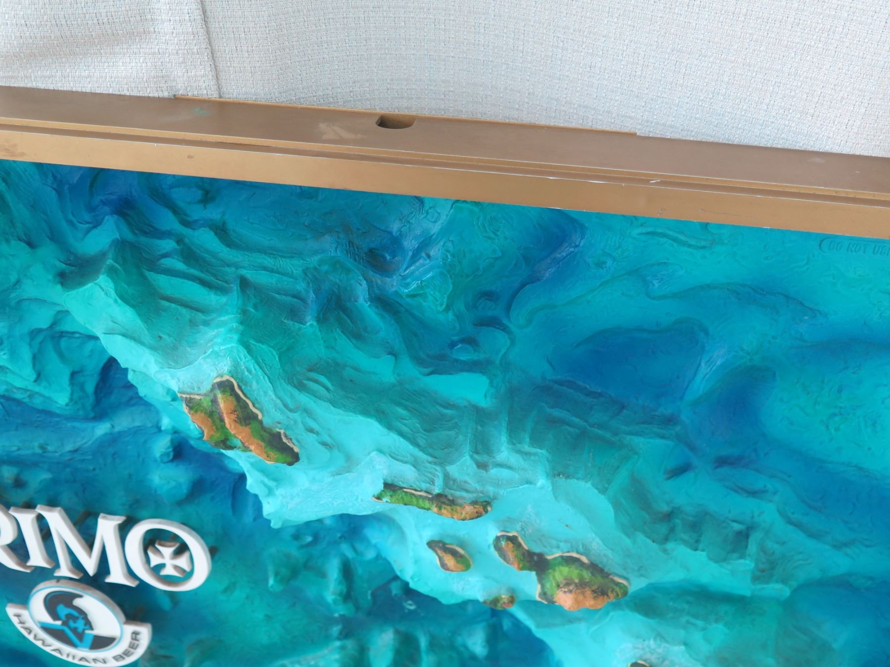 Vintage Primo Beer Framed Display, Raised Hawaiian Islands, 17"x26" (Minor Damage - one crack and one small hole)