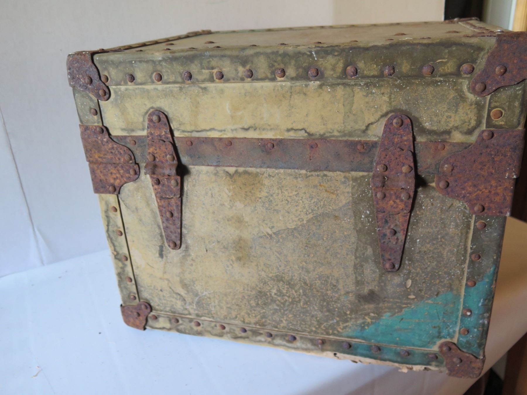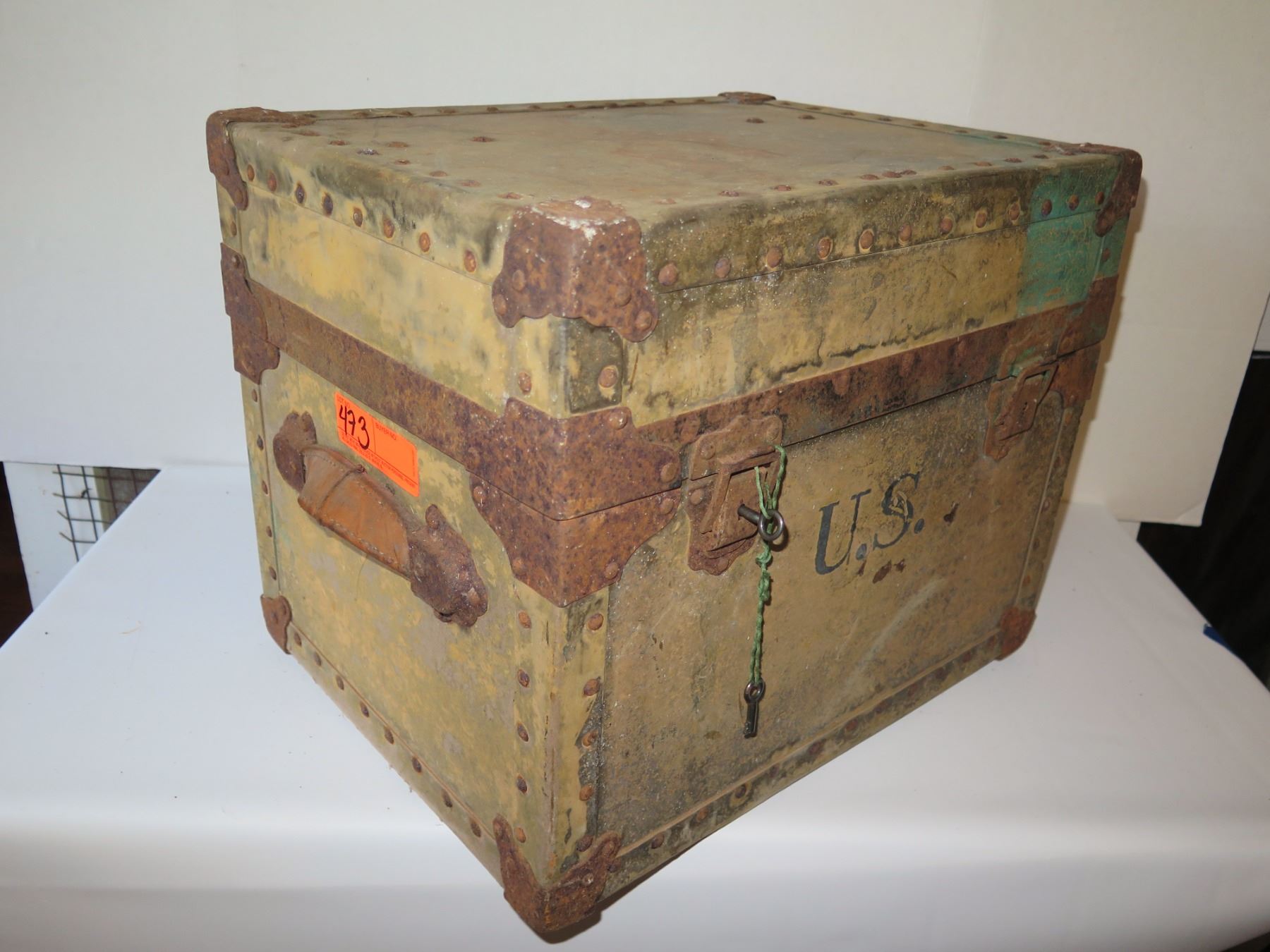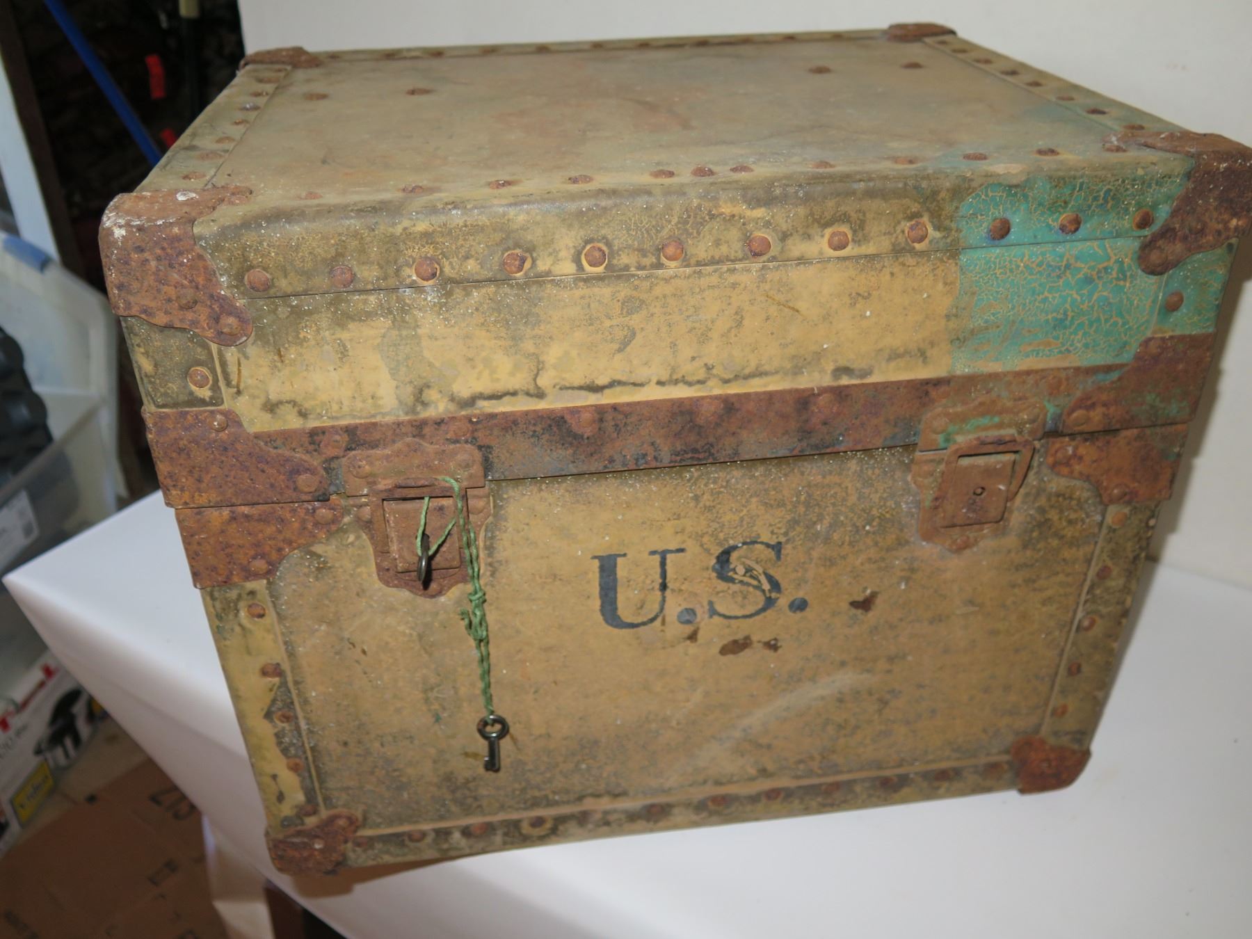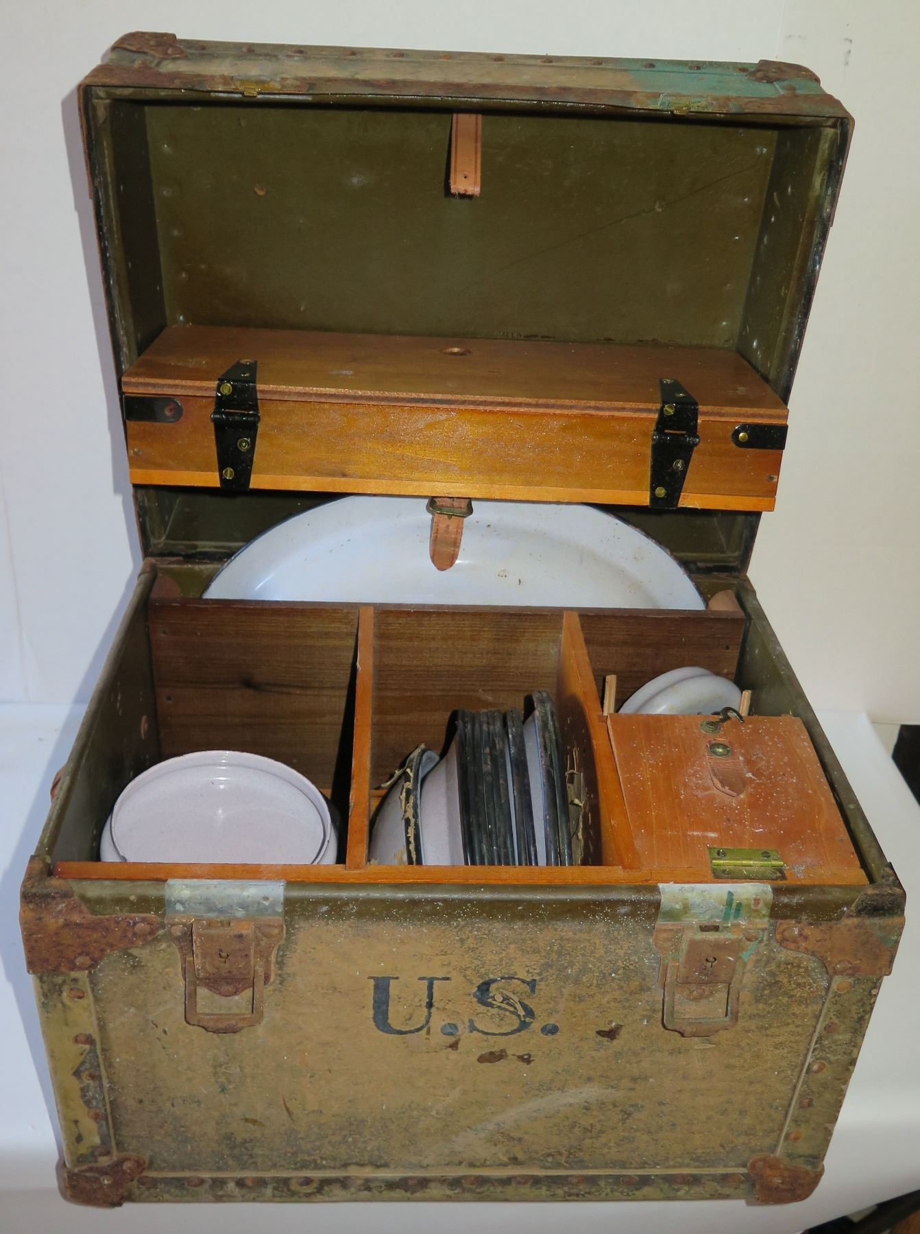 Vintage U.S. Trunk w/ Coffeepot, Dishes & Utensils 17.75"x 13.75"x 14.5"H