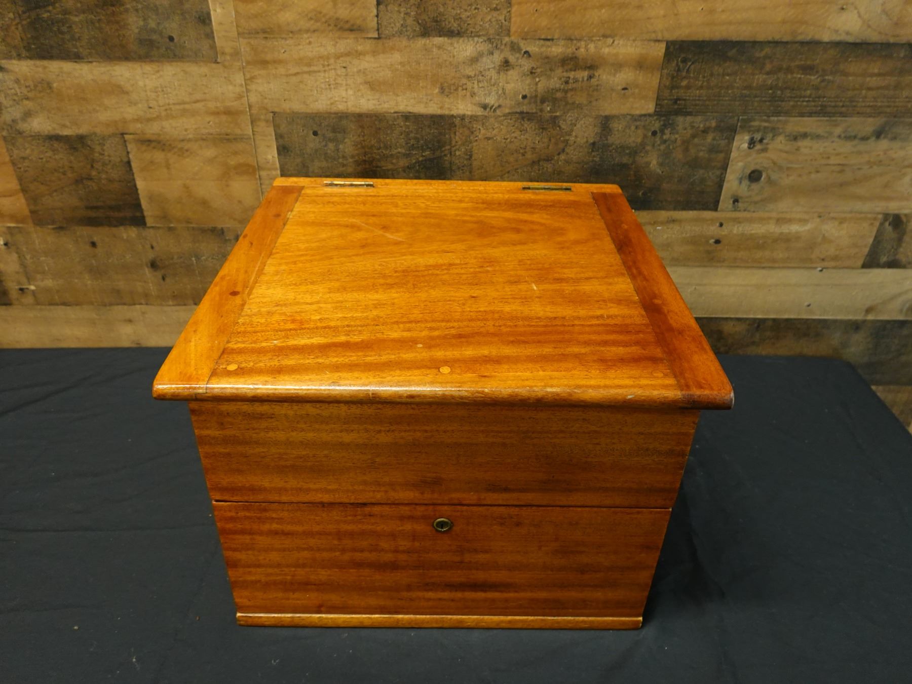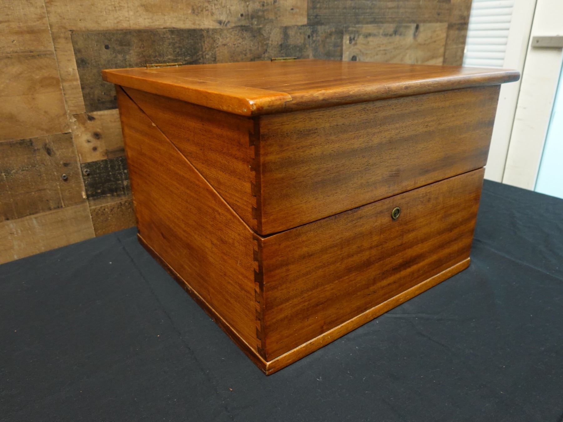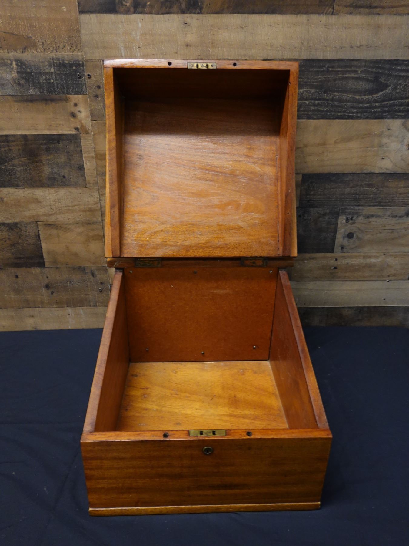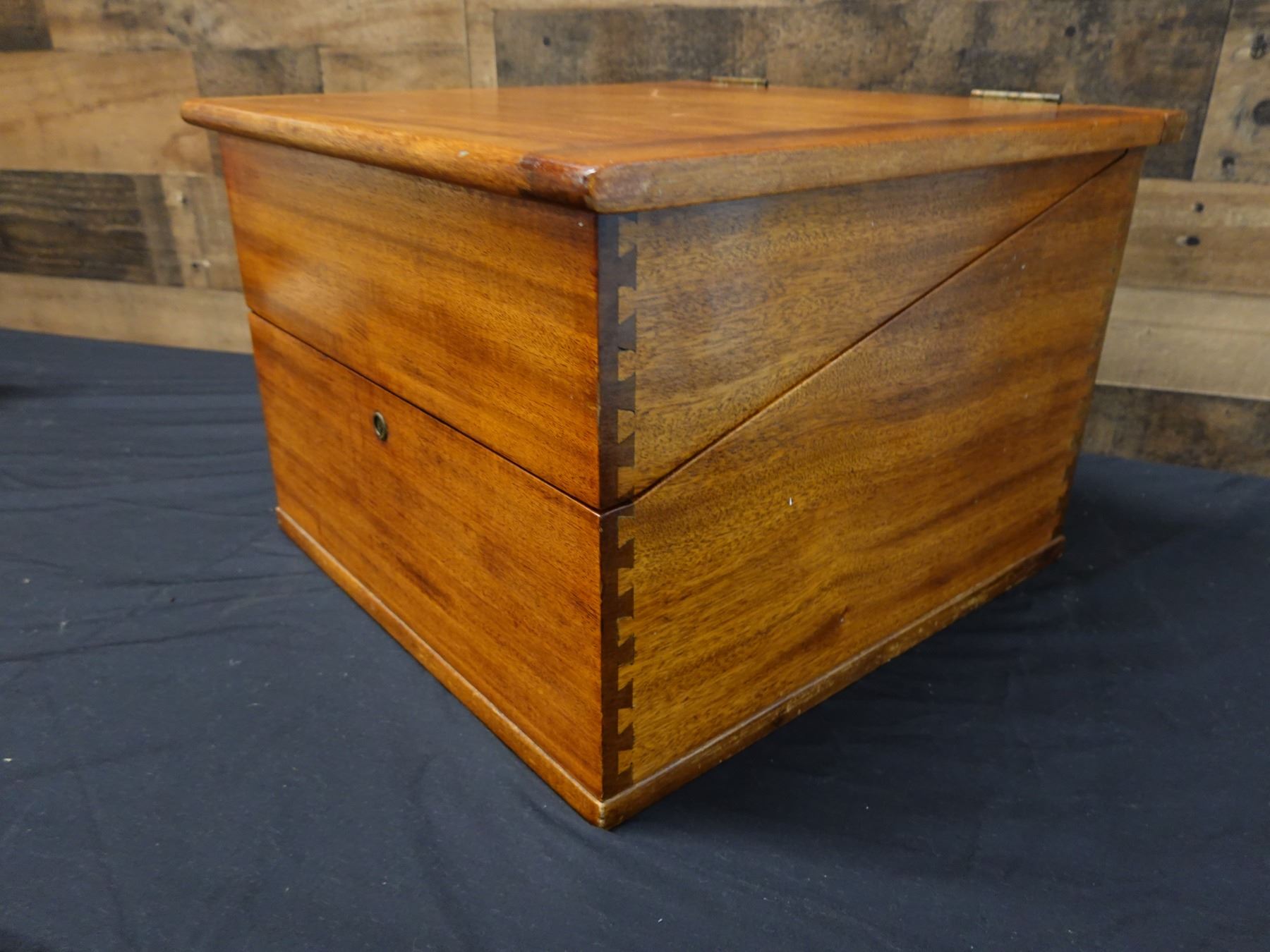Seller reports this interesting box was supposedly meant to house a large ship's compass. The wood is luminous and finely joined.