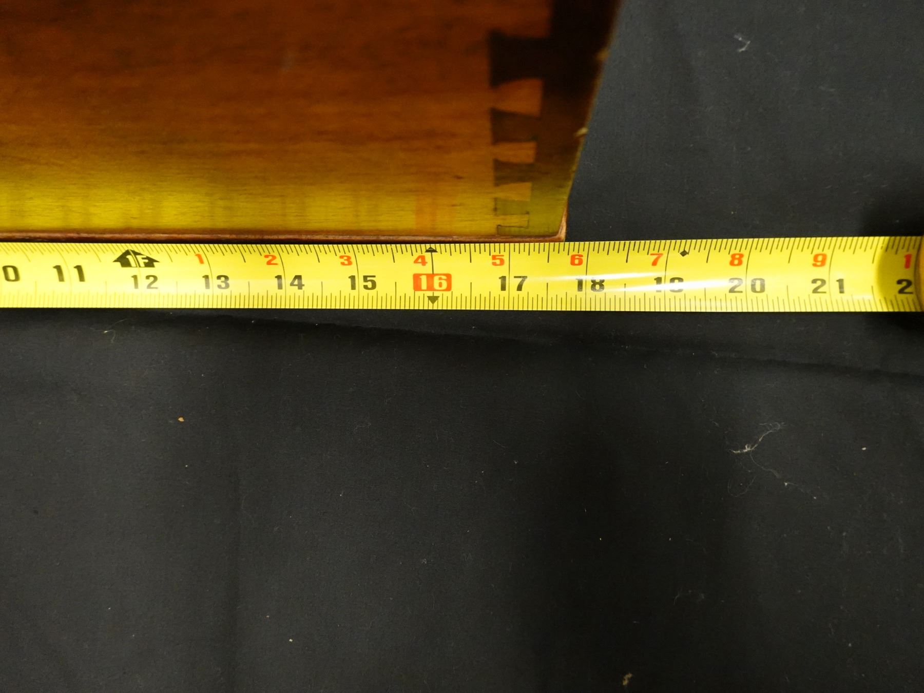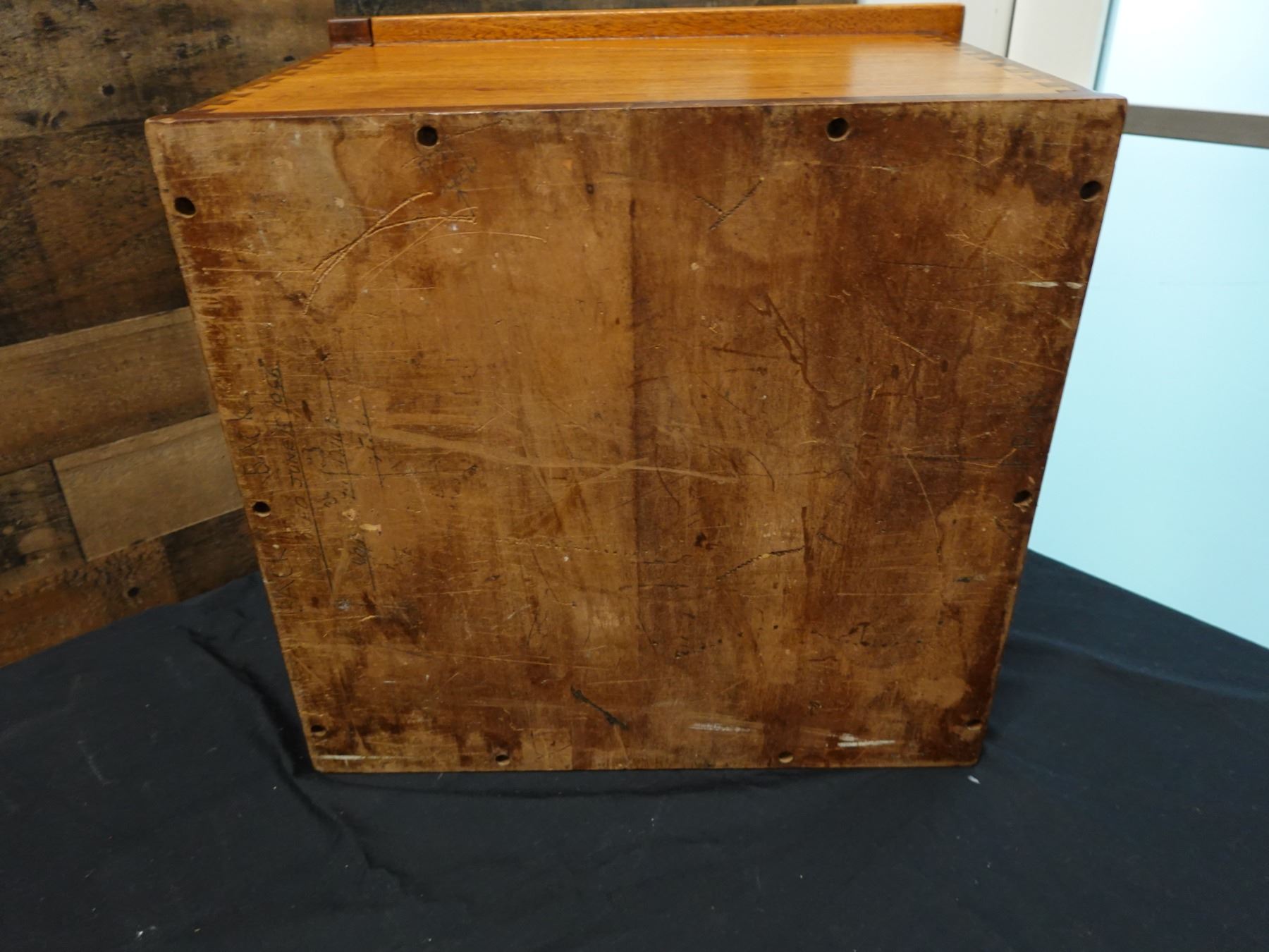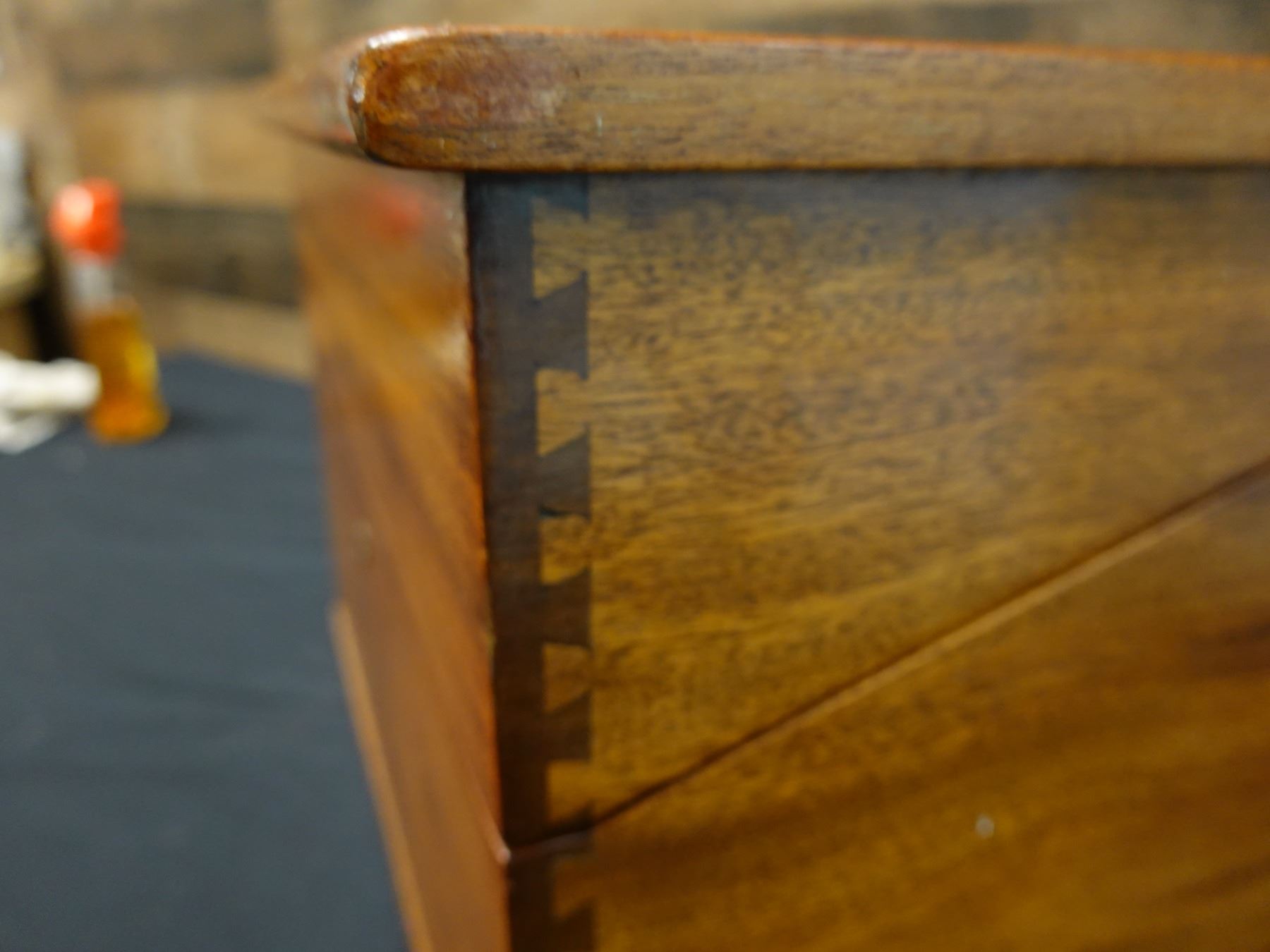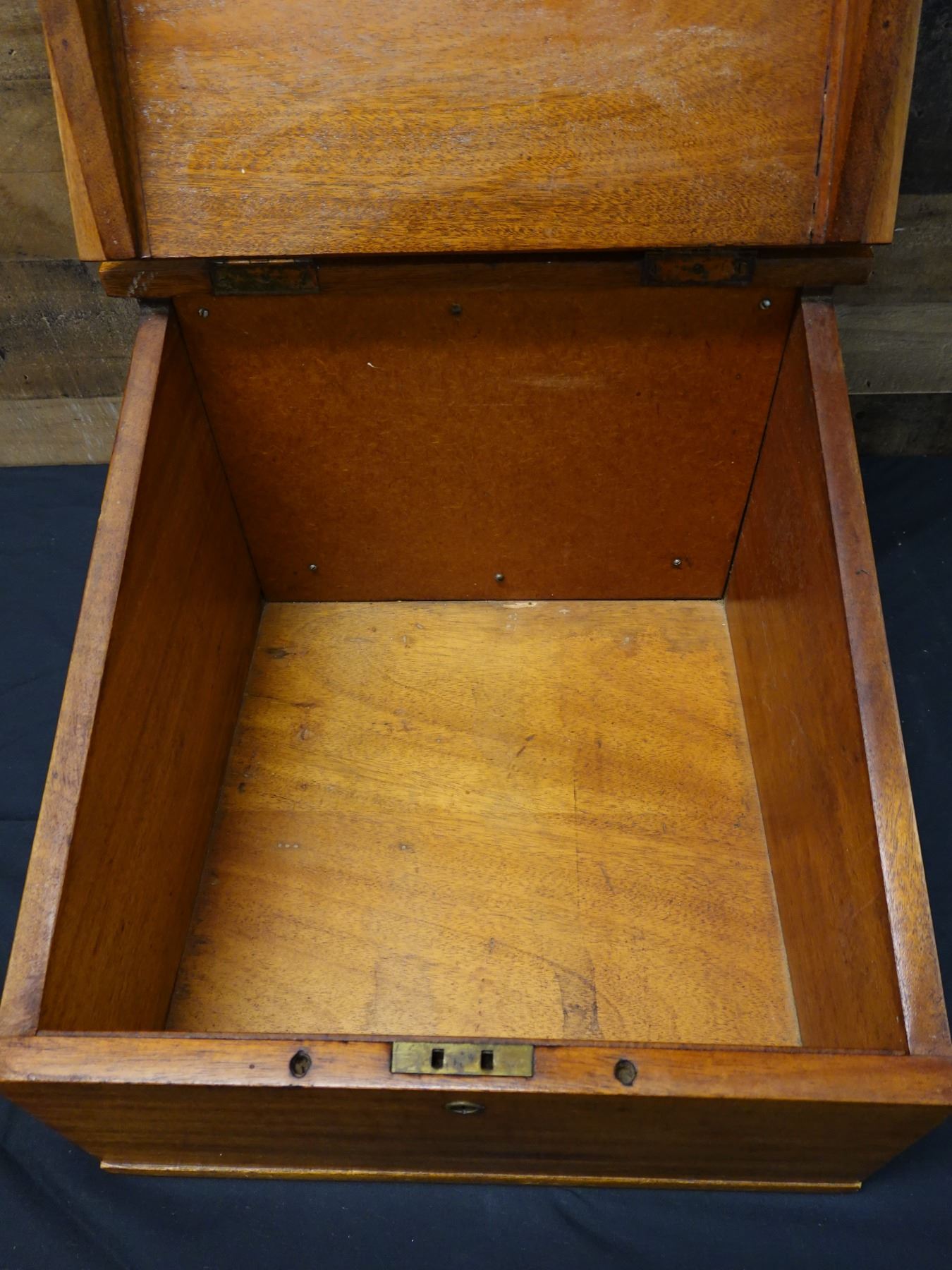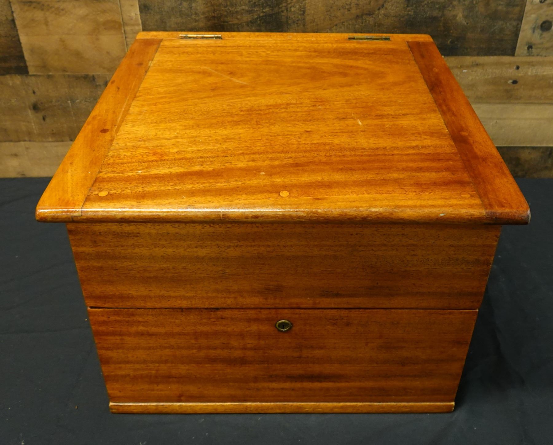 Seller reports this interesting box was supposedly meant to house a large ship's compass. The wood is luminous and finely joined.