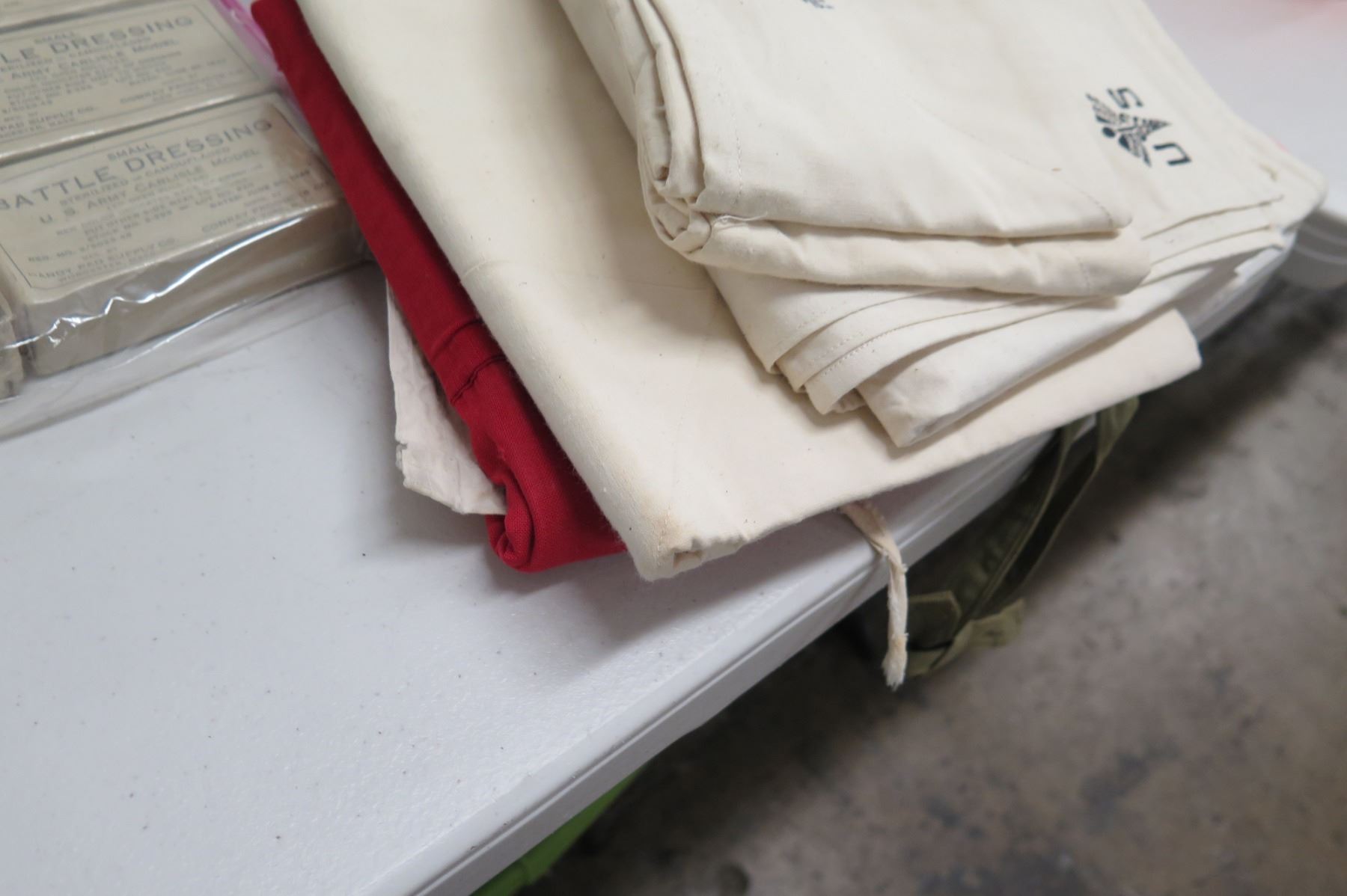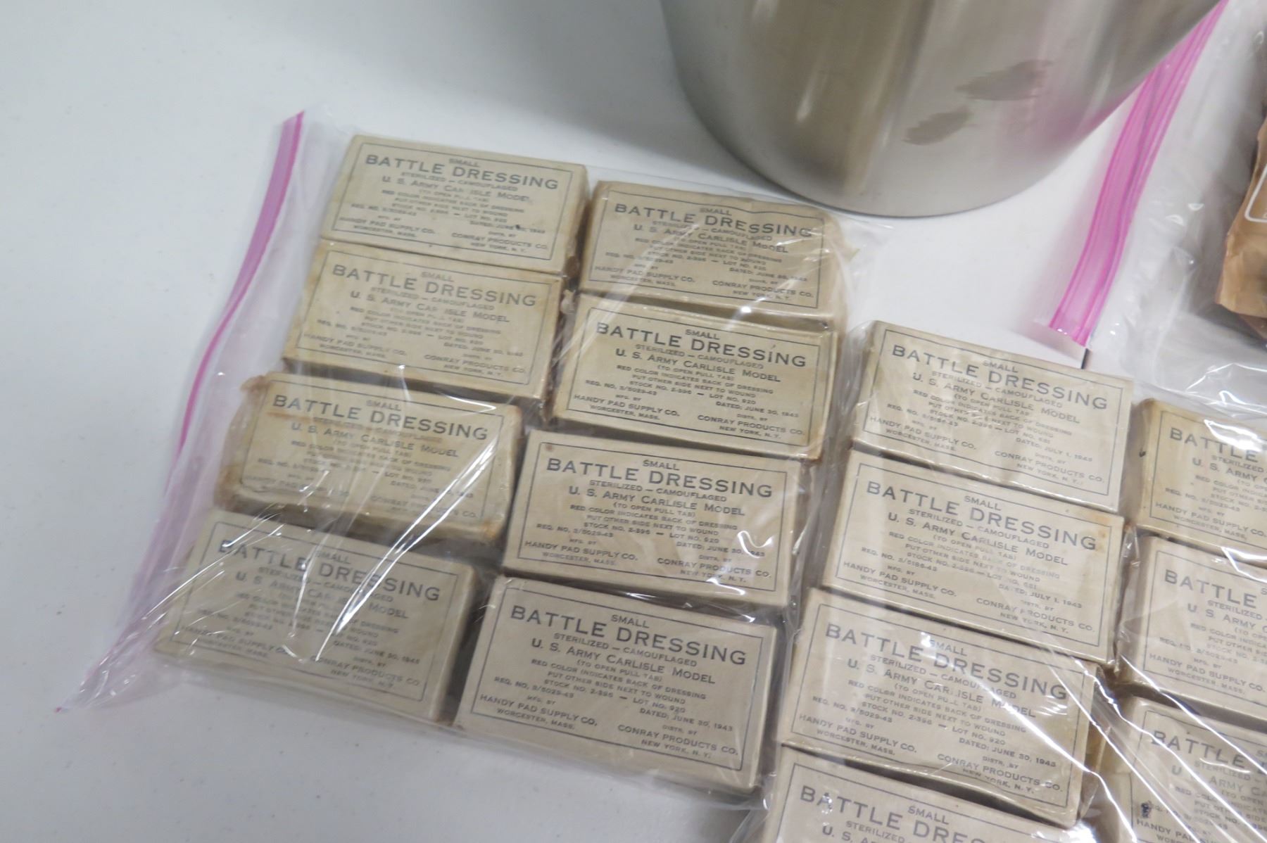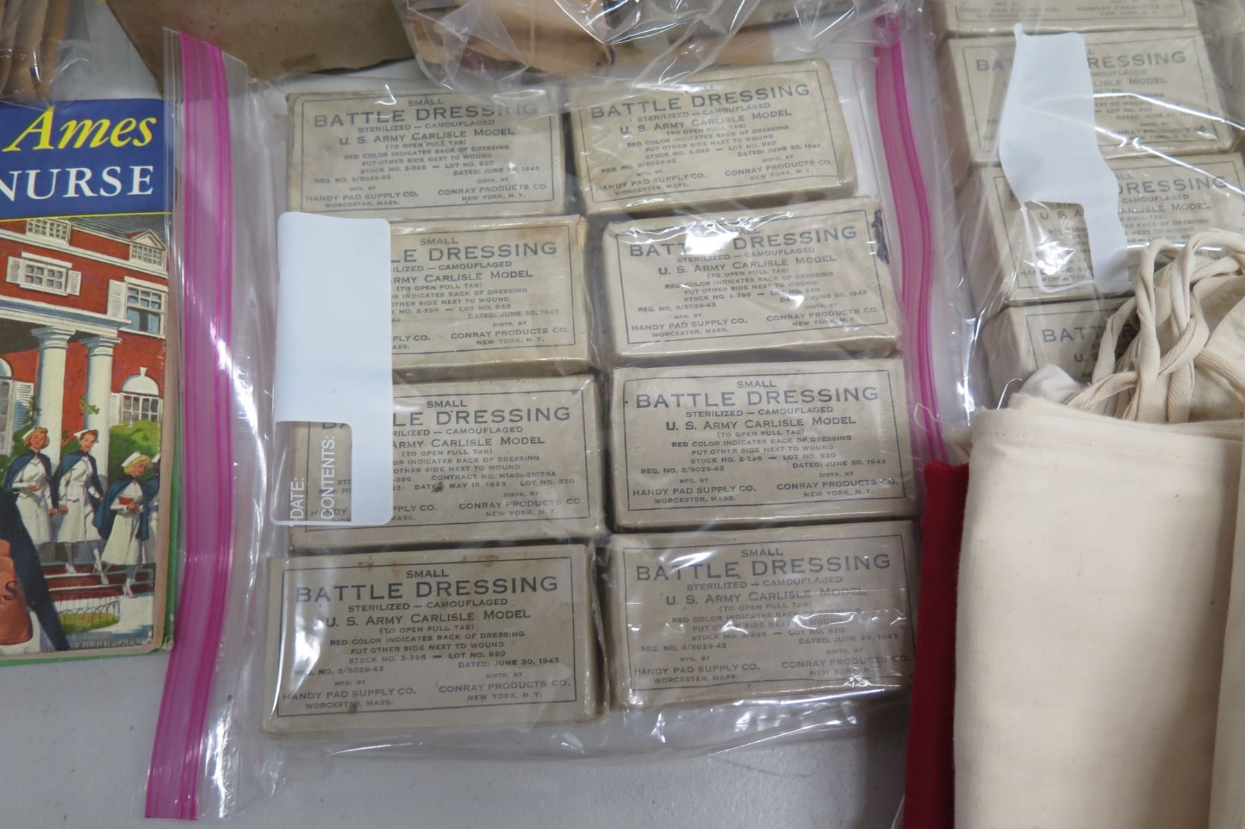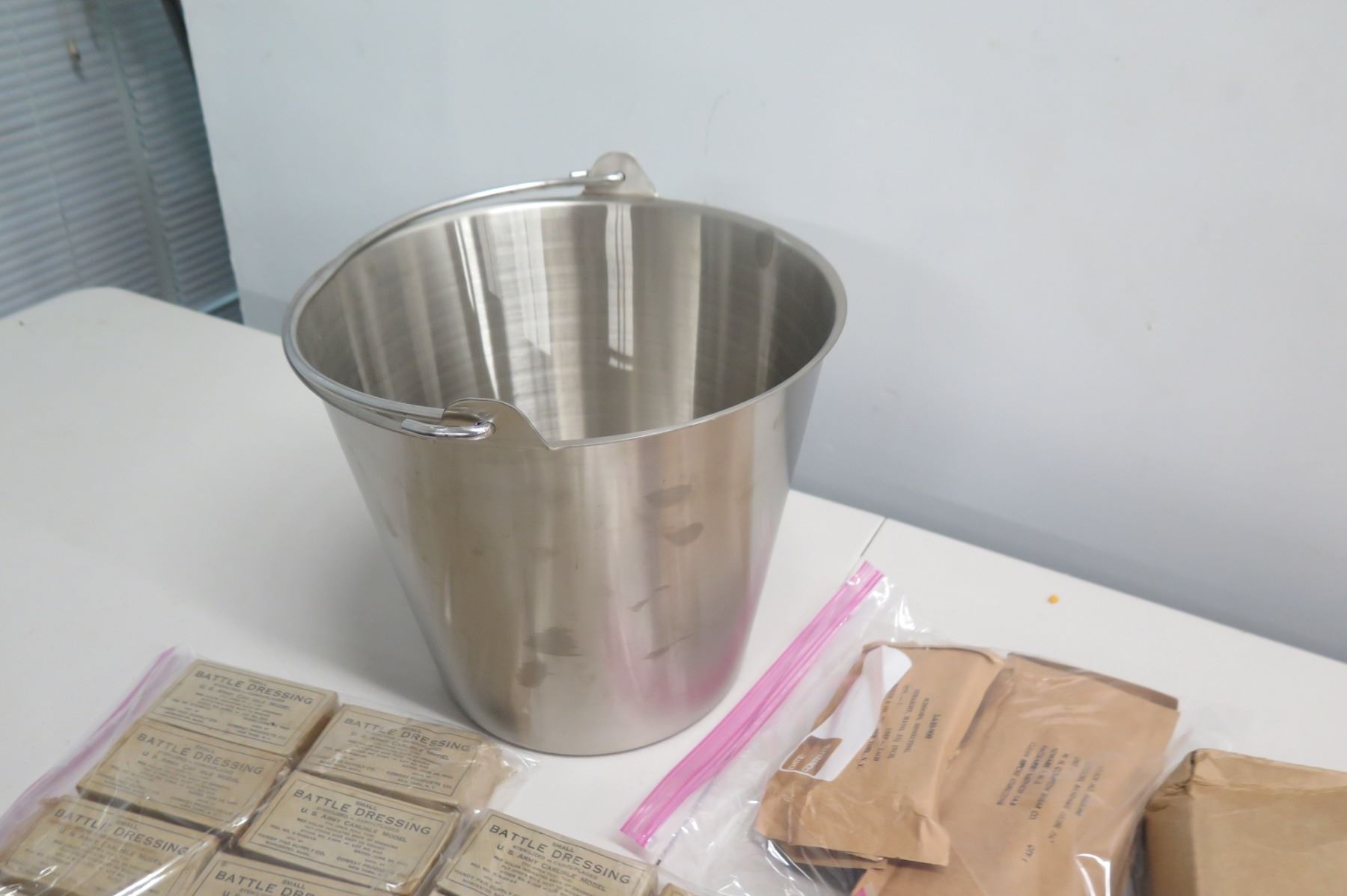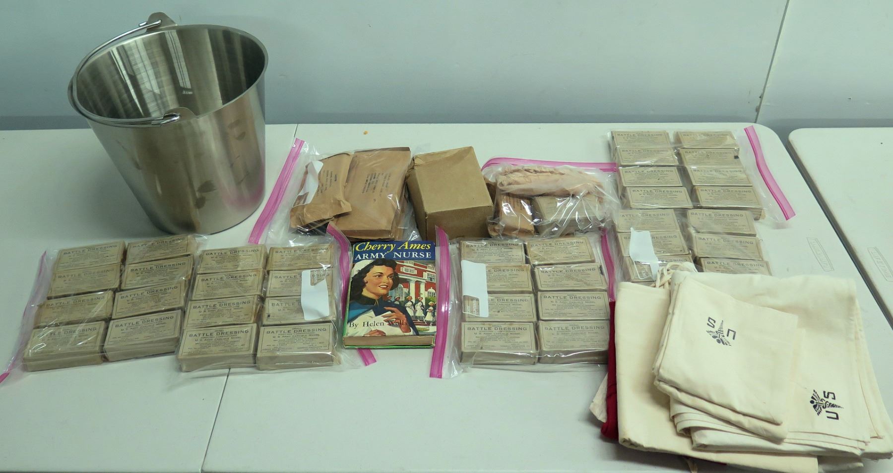 WWII Medical Supplies - Stainless Bucket, Red Cross Bag, Book & Supplies
