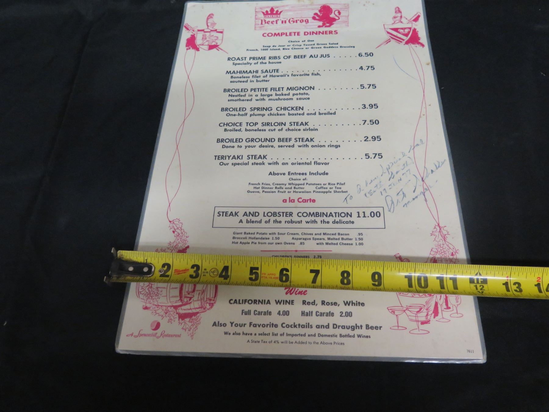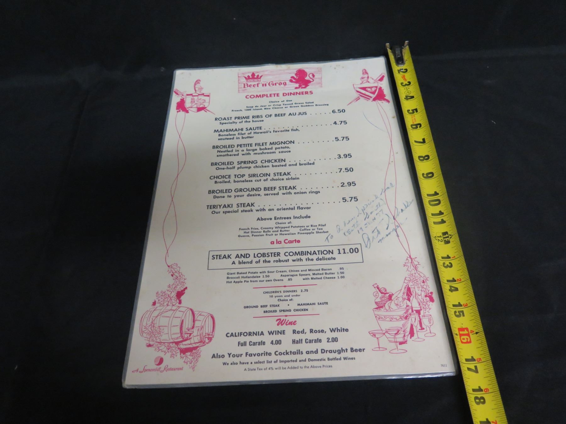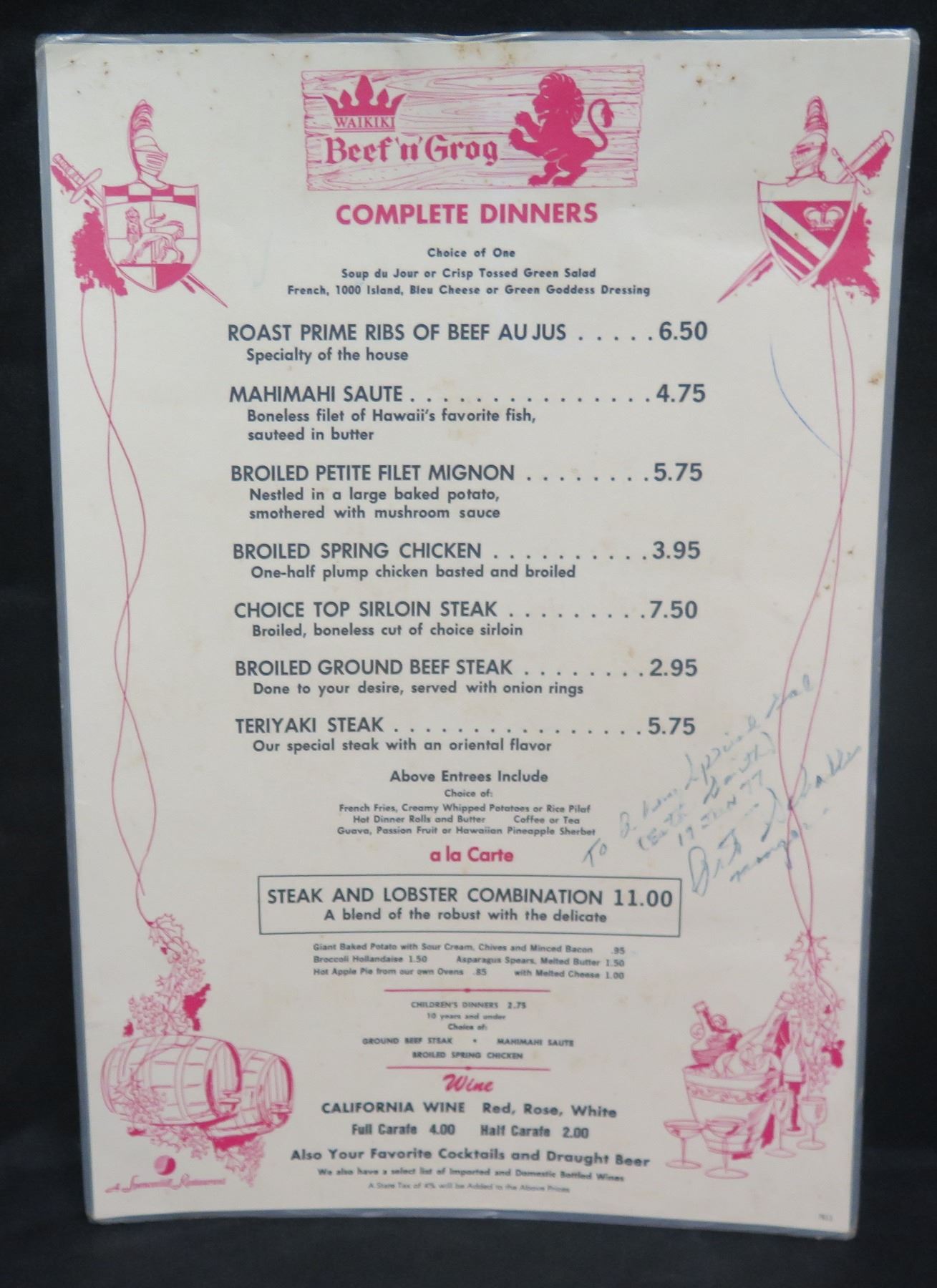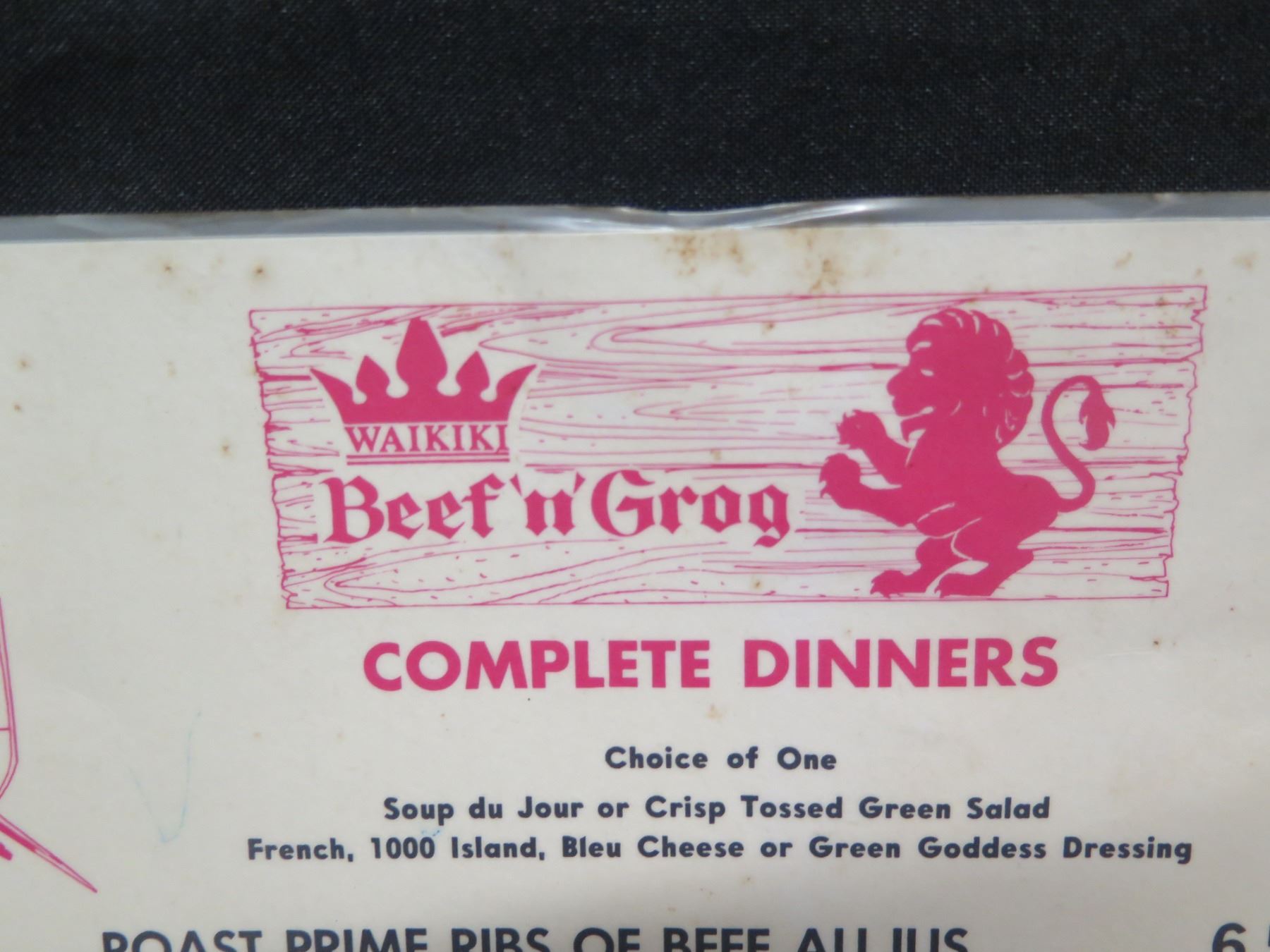 Waikiki Beef & Grog Complete Dinner Menu, Signed, 12"x17"