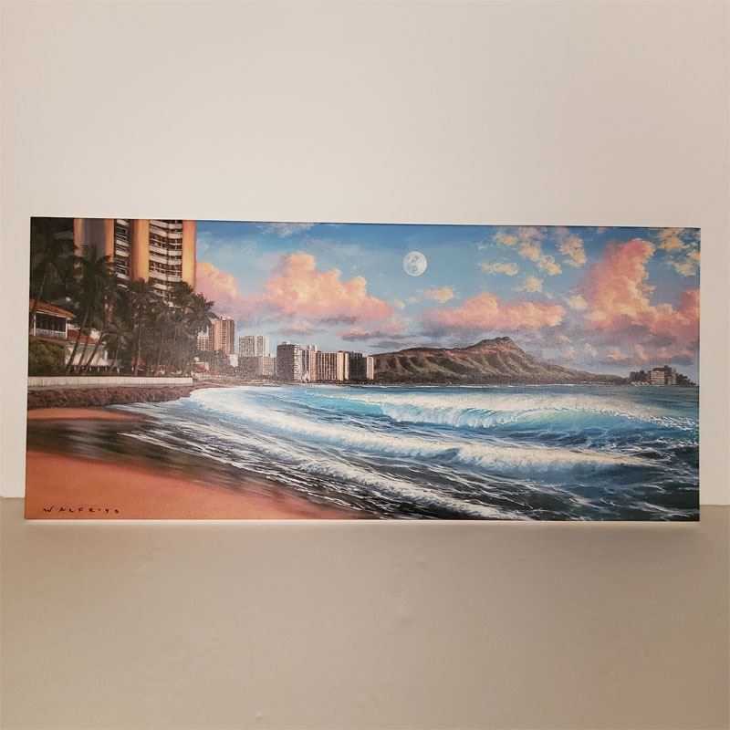 Artist Walfrido Garcia captures the beauty of twilight in Waikiki with this amazingly lifelike painting. New. Donated By: Heart Rock Productions, LLC.