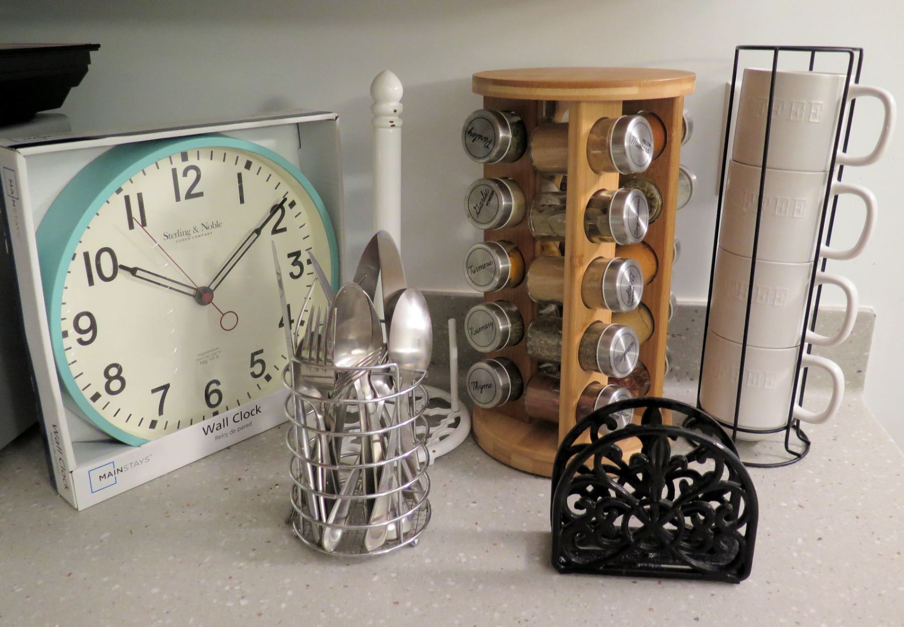 Wall Clock, Spice Rack w/ Jars, Mug Holder w/ Cups, Flatware & Napkin Holder